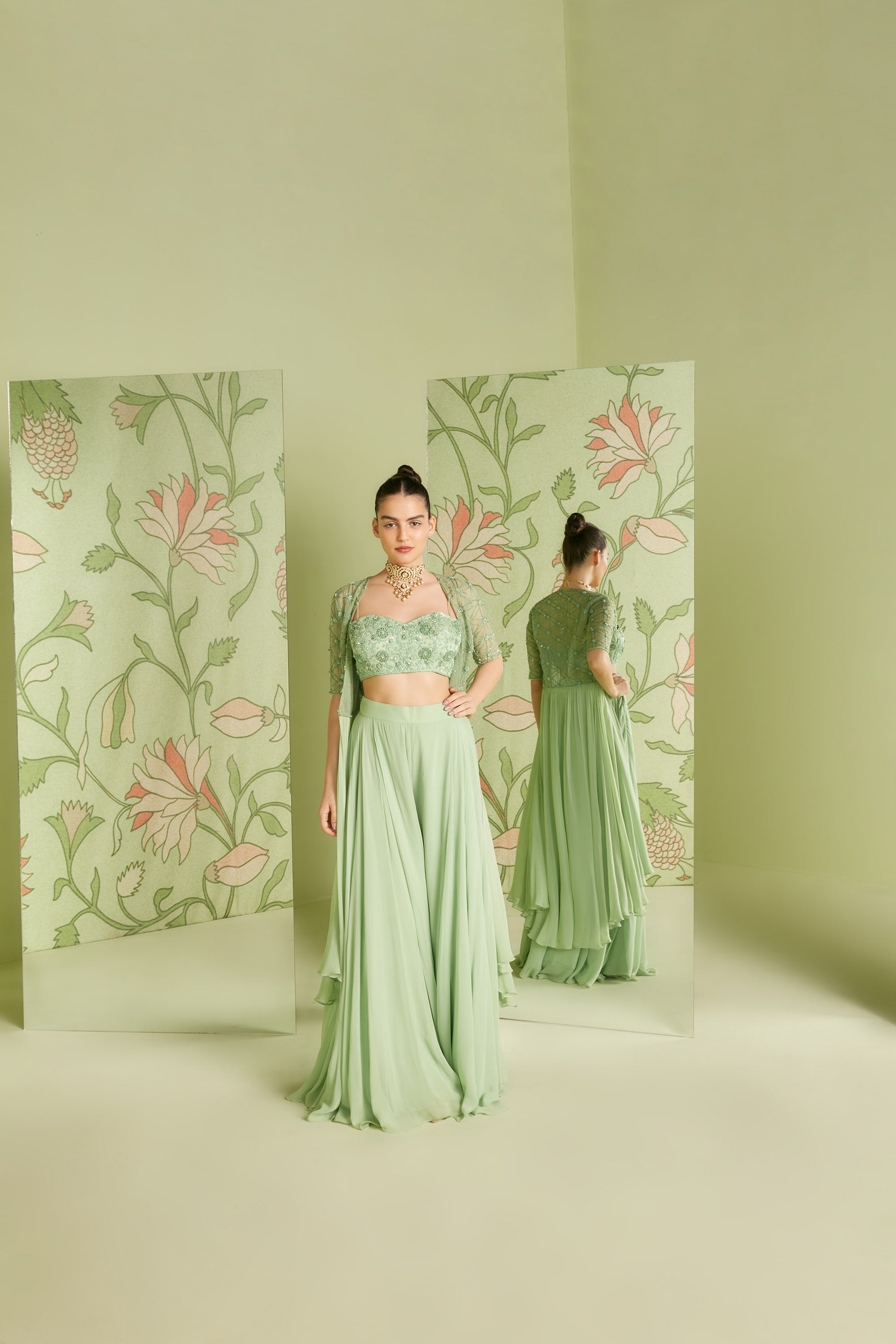 Indo Western Georgette Sage Green Hunar Jacket Set