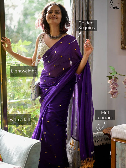 This purple made-in-heaven mul saree with glitters is ravishing!