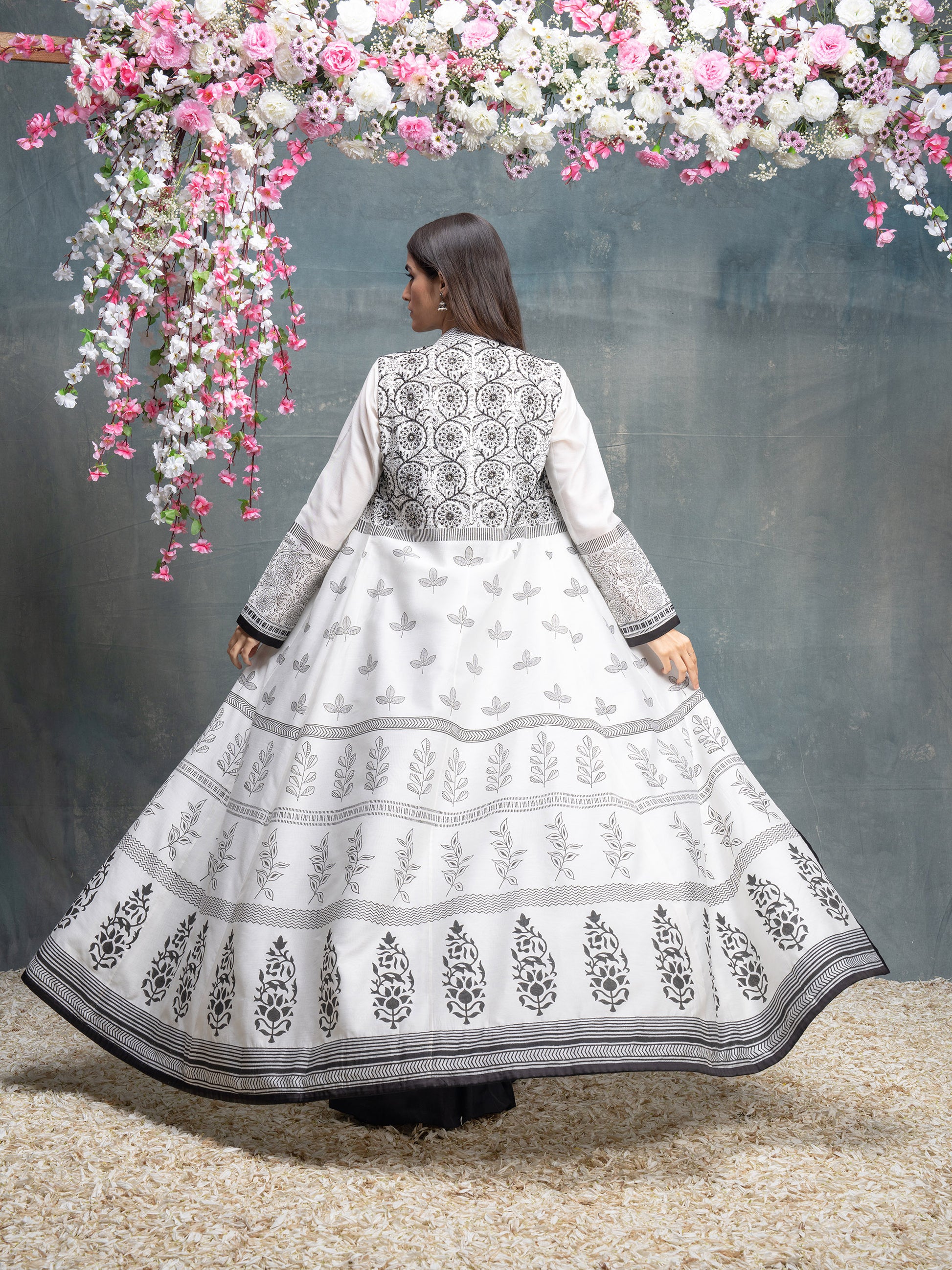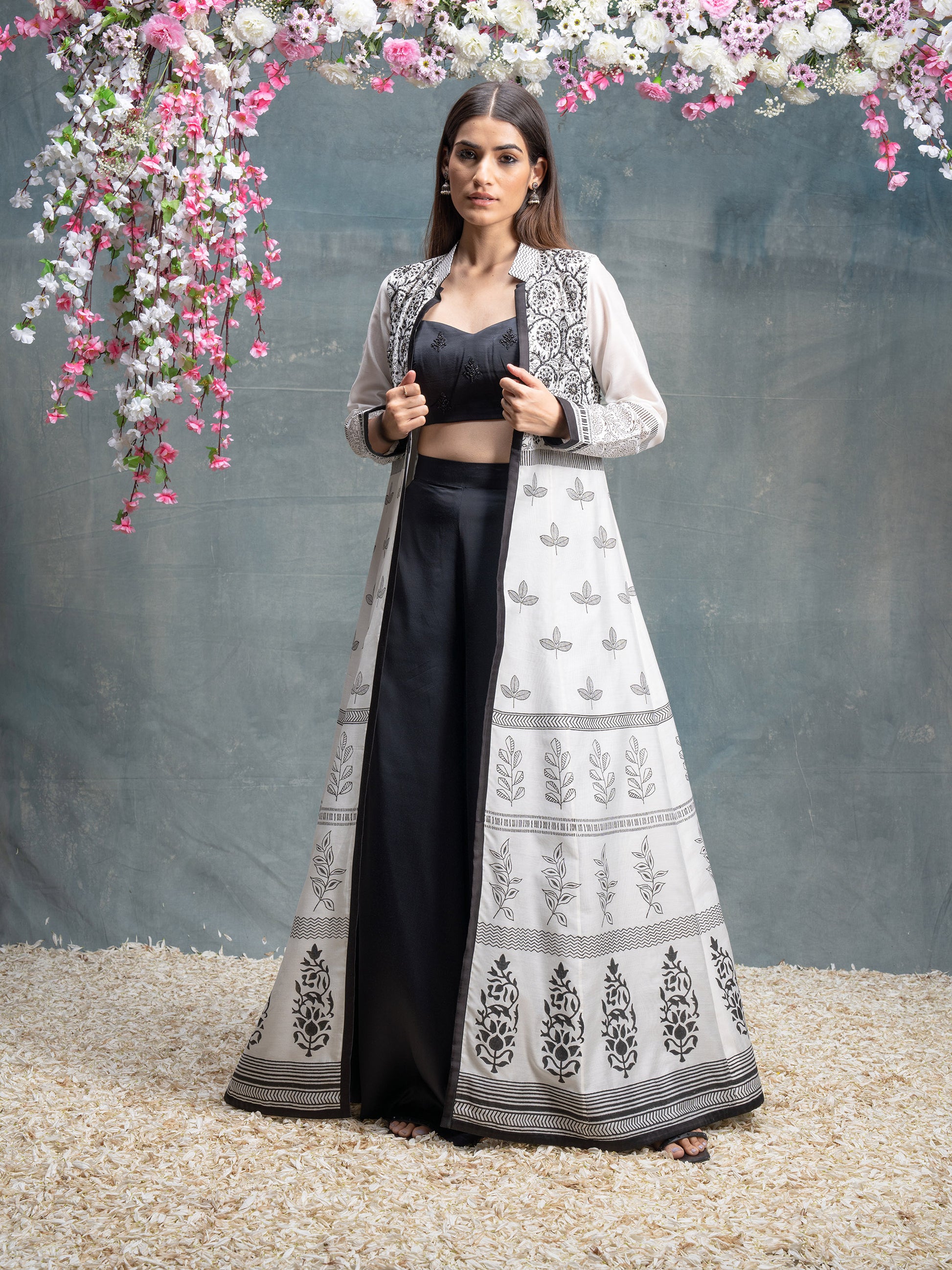 Ivory And Black Hand Block Printed & Embroidered Jacket Set