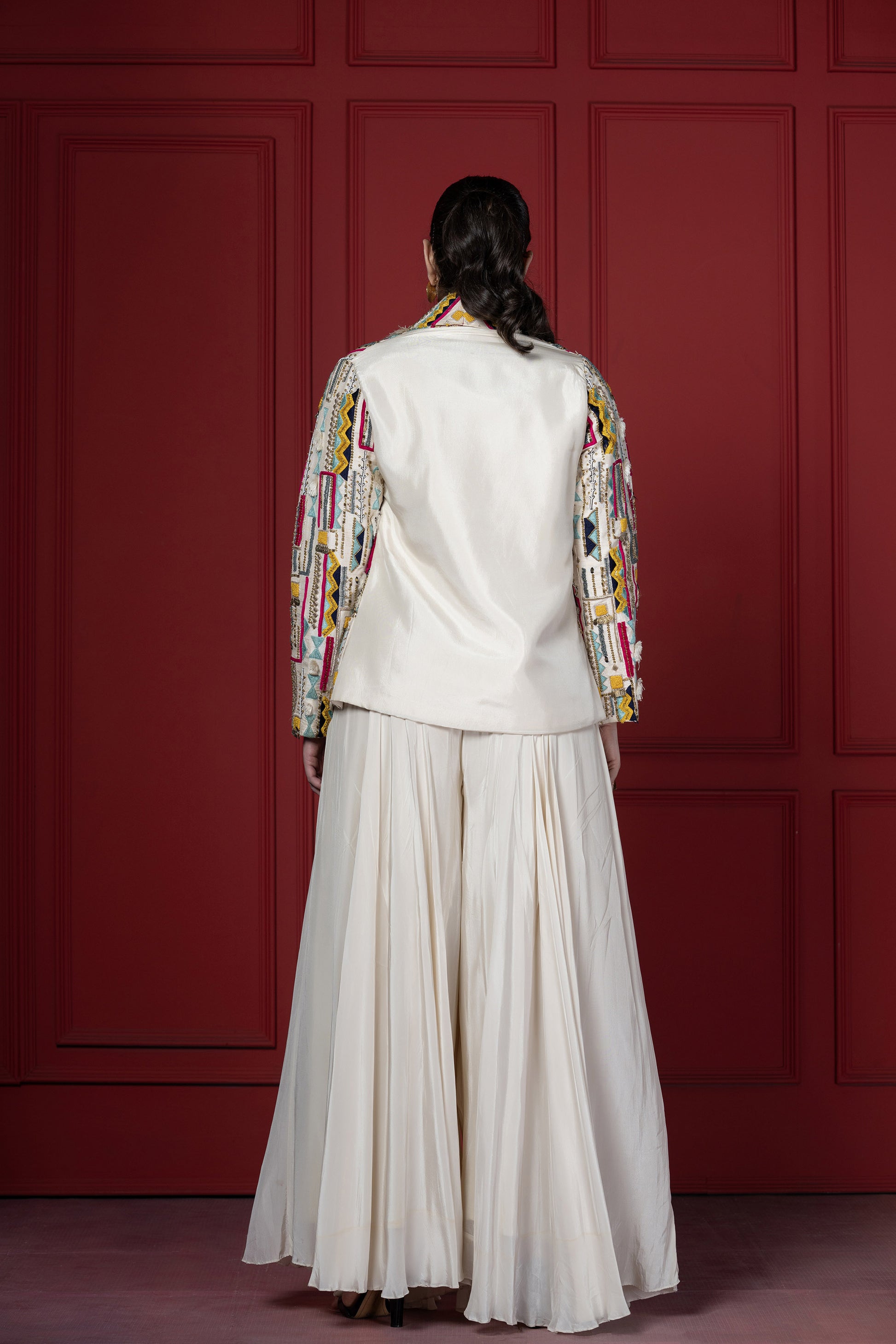Elegant Ivory Embroidered Jacket with Multi-Colored Thread and Hand work with plain pleated spaghetti & pleated palazzo