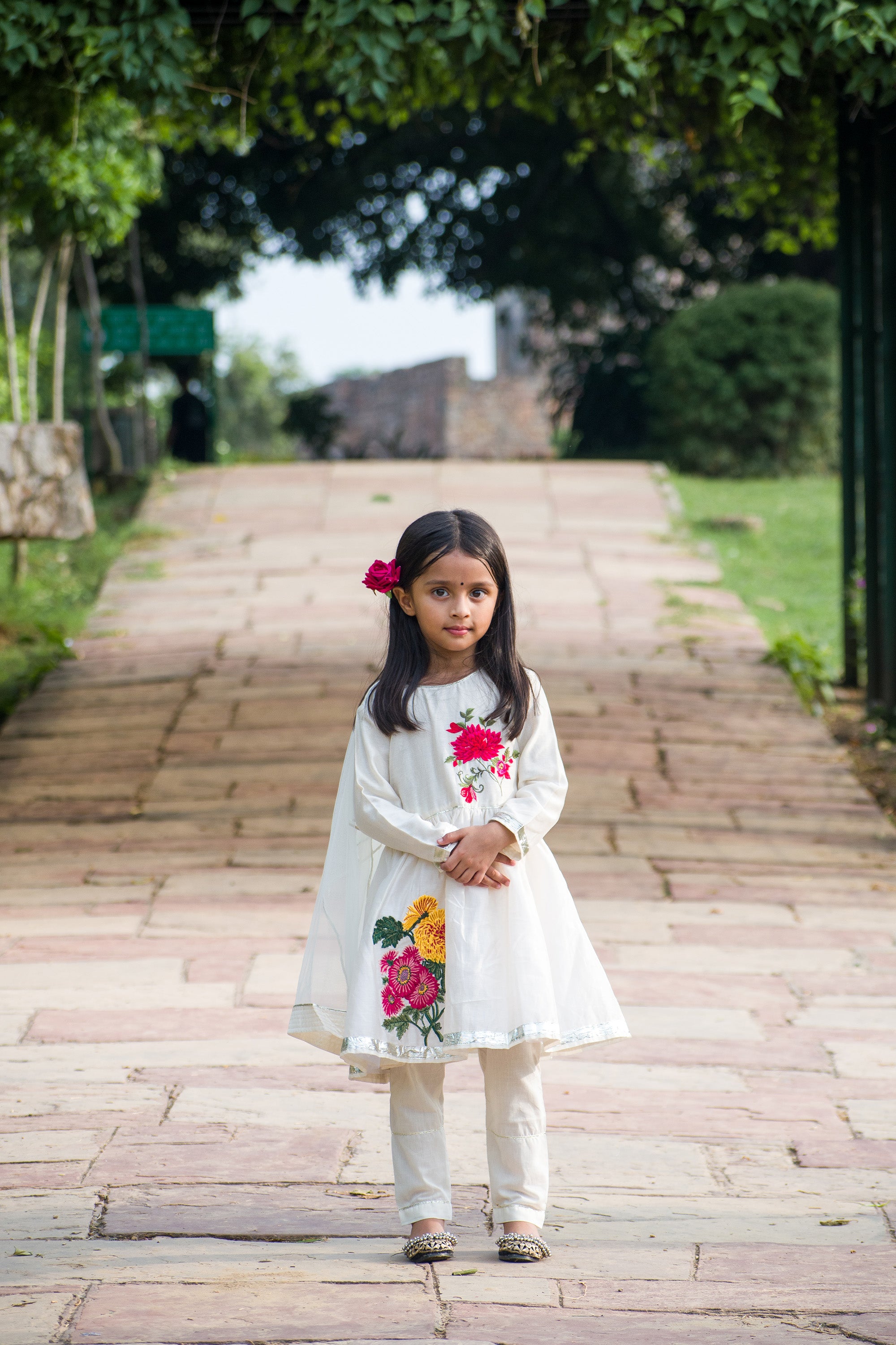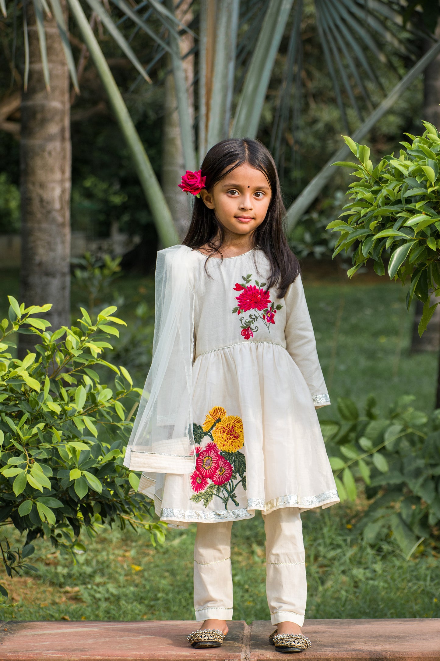 Ivory handwoven chanderi Anarkali with floral embroidery attached with can-can comes with Cotton Payjama and butterfly Net Dupatta having quilted border