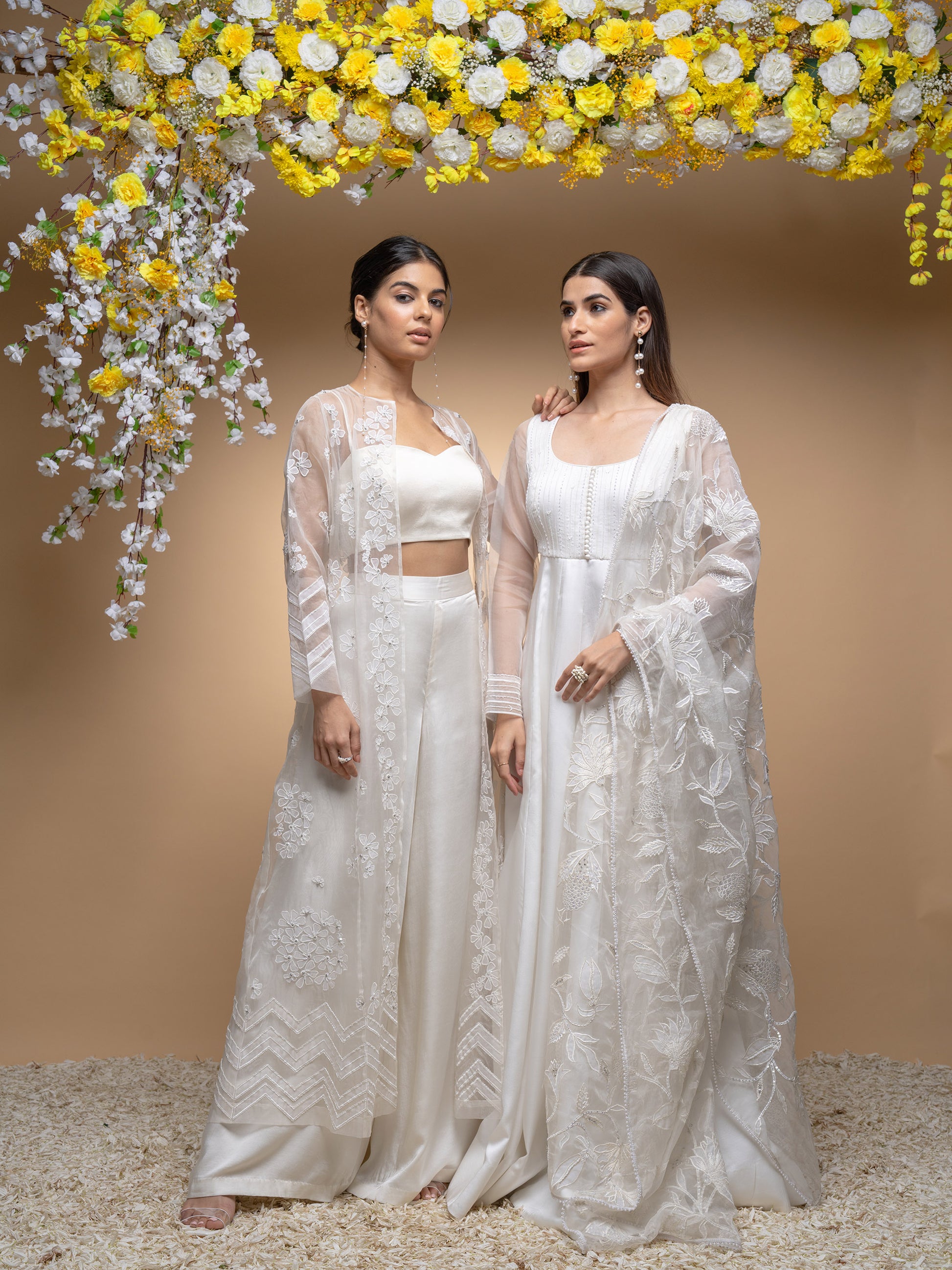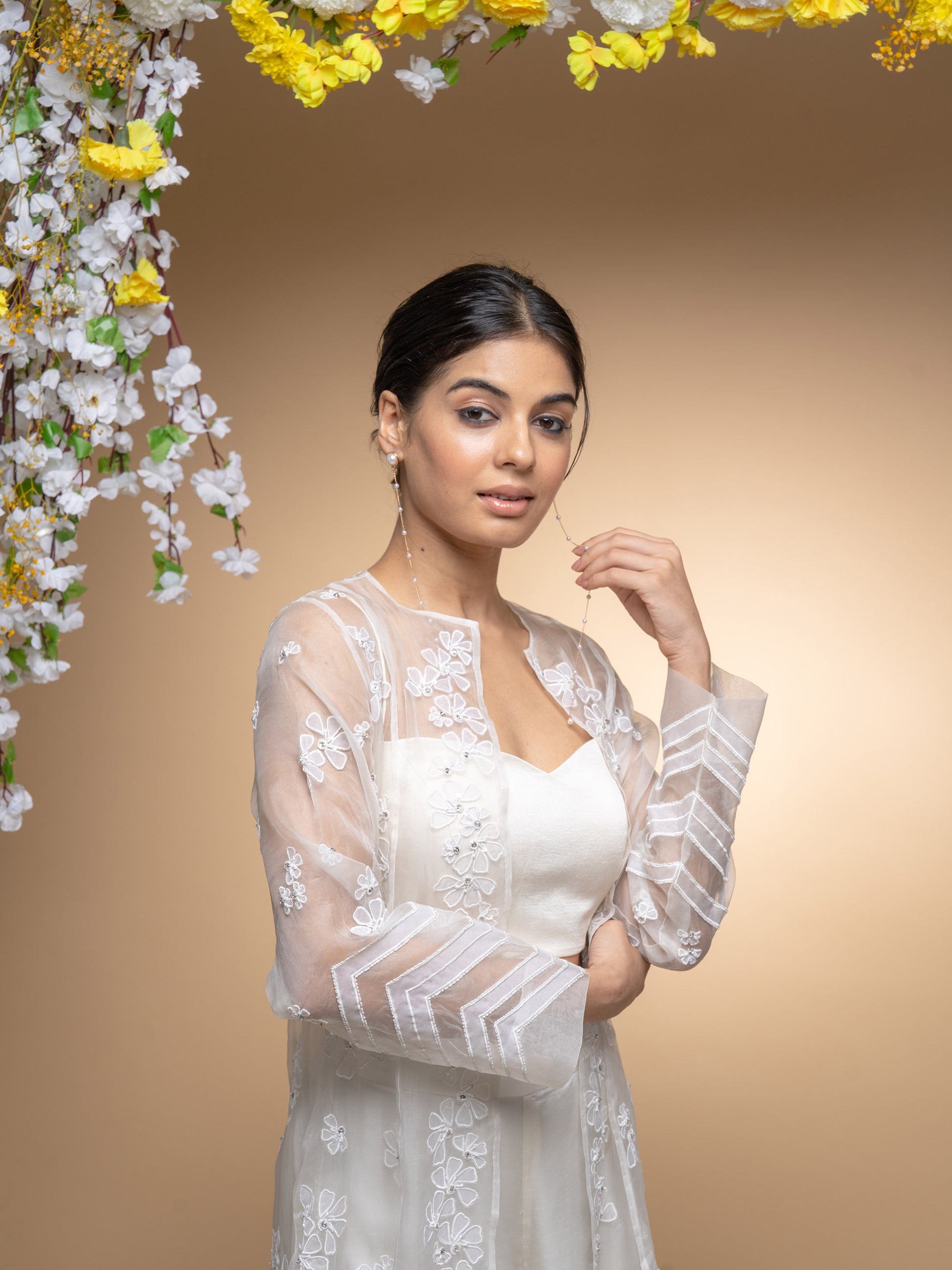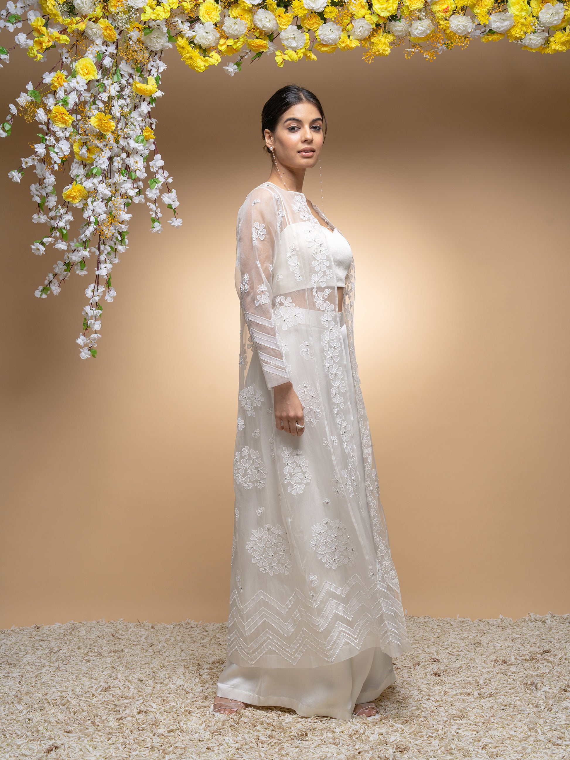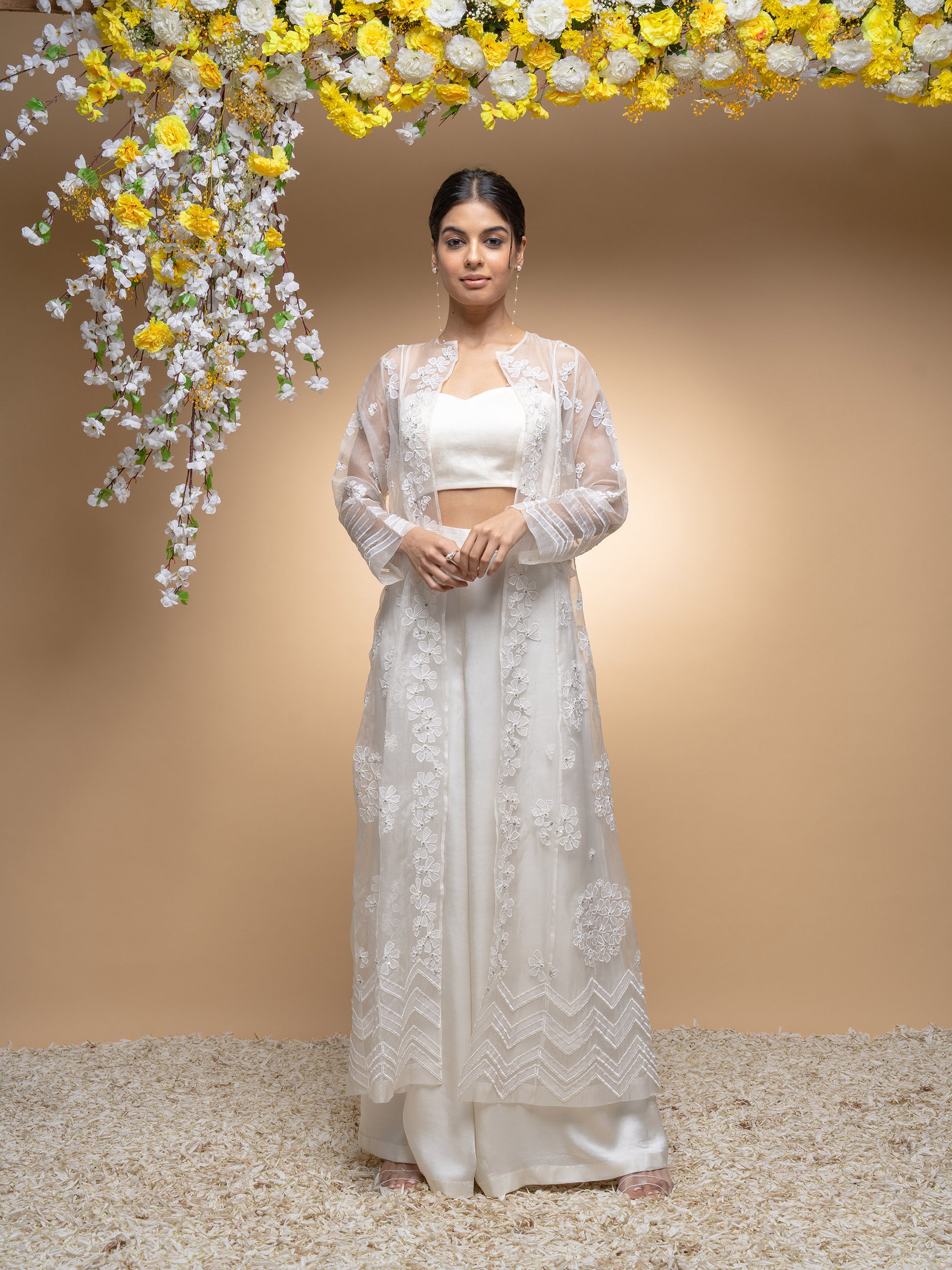 Ivory Organza Hand Applique Work Jacket Set With Bustier And Palazzo Pants