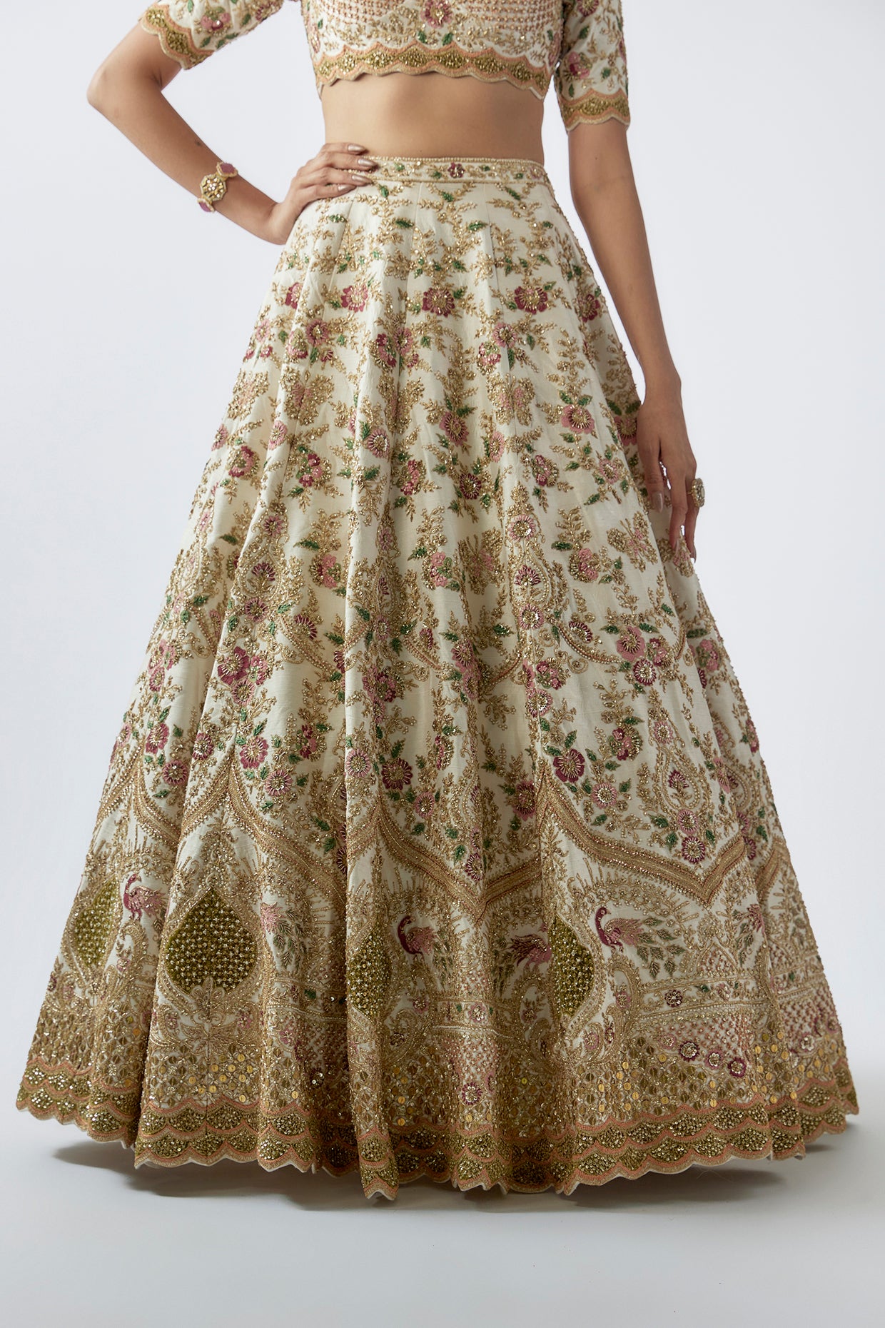 Featuring An Ivory Lehenga In Raw Silk Base With Zardosi Hand And Machine Embellishments, Including A Can-Can. It Is Paired With An Embellished Blouse And Two Dupattas. Accentuate This Designer Lehenga Set With Heels And Polki Jewellery For A Bridal Look.