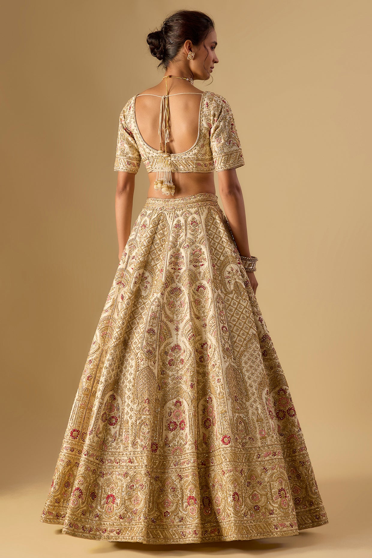 Featuring An Ivory Lehenga In Raw Silk Base With Zardosi Embellishments. It Is Paired With A Blouse And A Pair Of Dupattas. Accentuate The Designer Lehenga With Polki Jewellery, Embellished Heels And A Potli Bag For Your Wedding Or Engagement Ceremony.