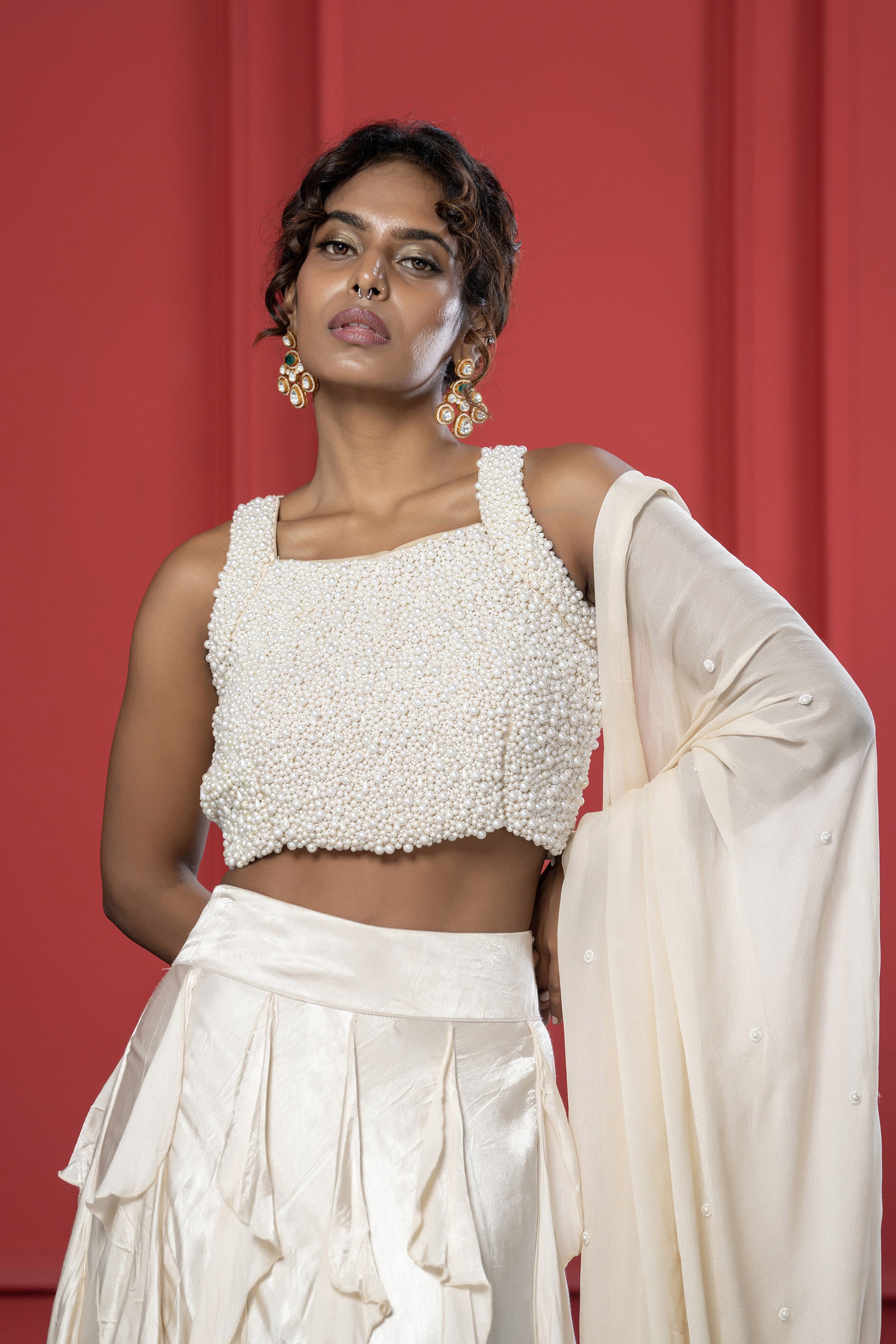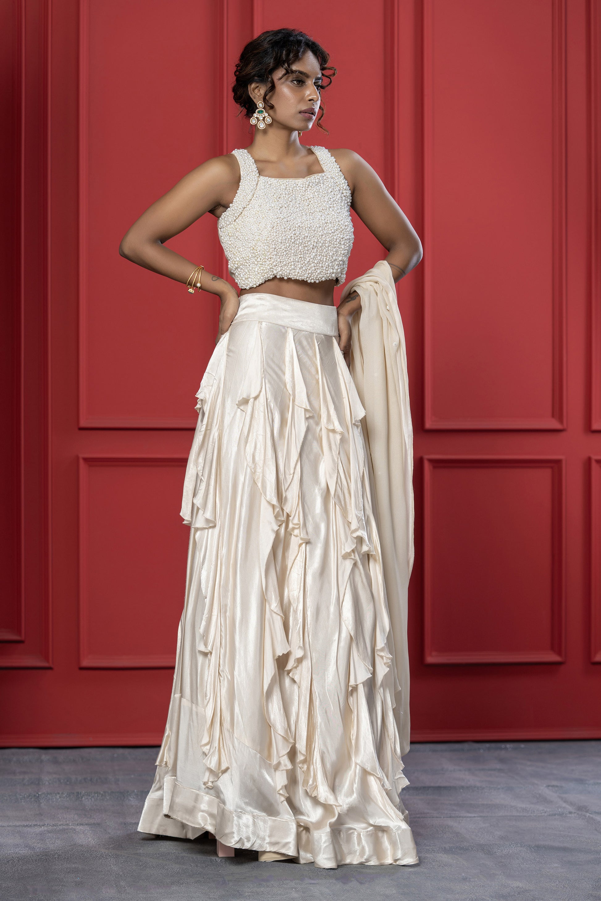 Blouse with Pearl work all over & shiny skirt with ruffles in between paired with an amazing flowy dupatta with small buttons
