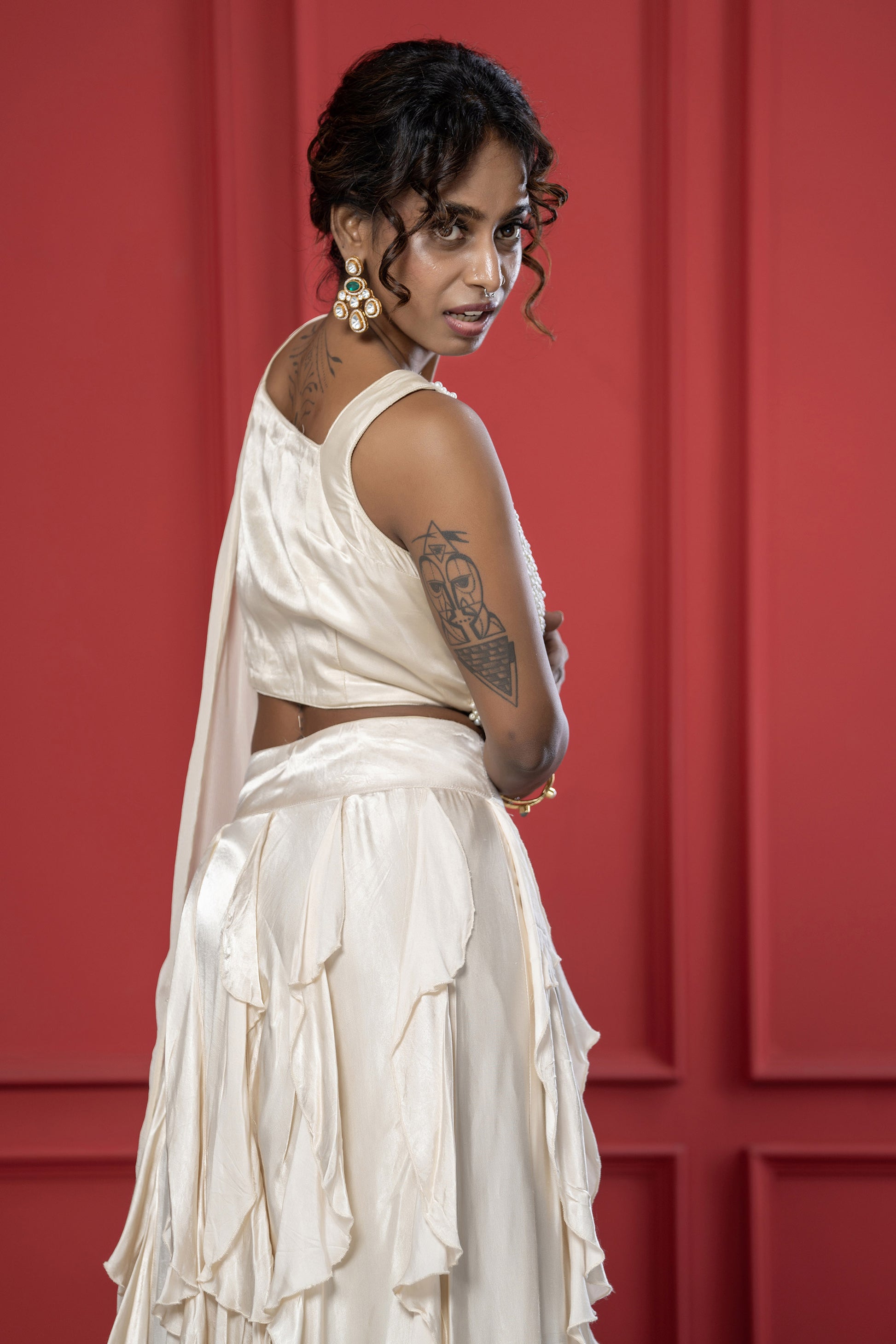 Ivory Ruffle Gaji Silk Pearl Lehenga