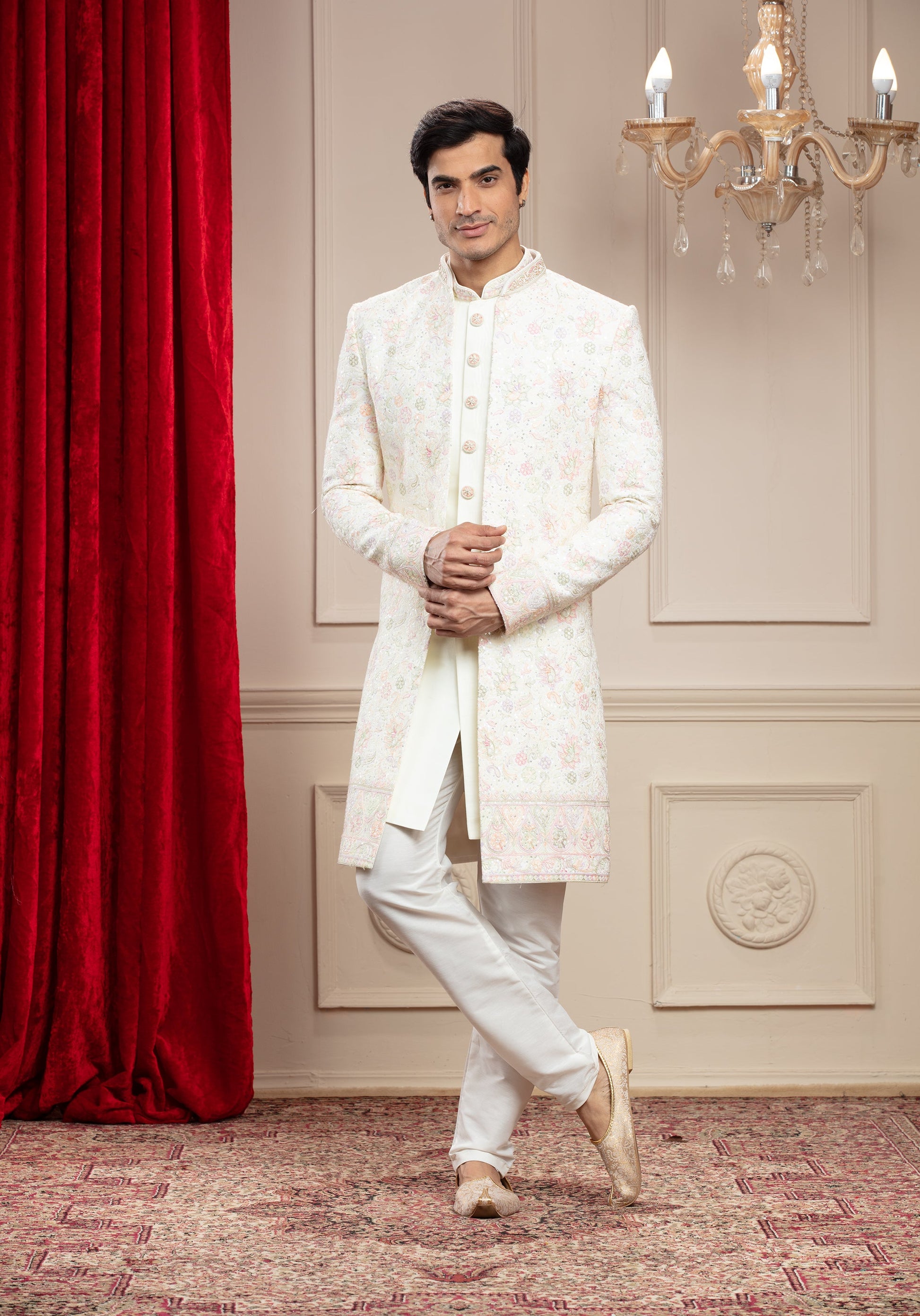 Ivory White Open indo western set with machine embroidery