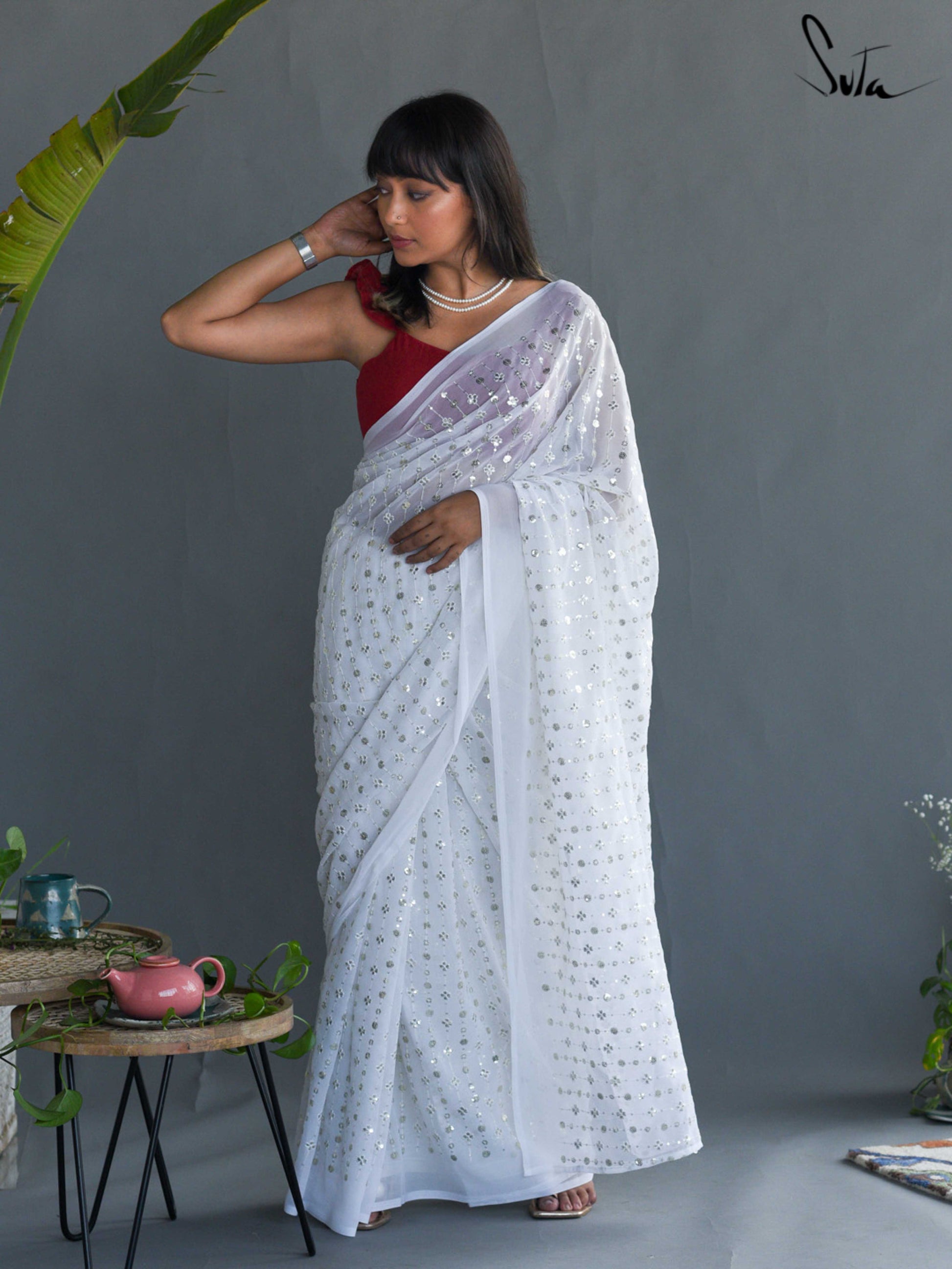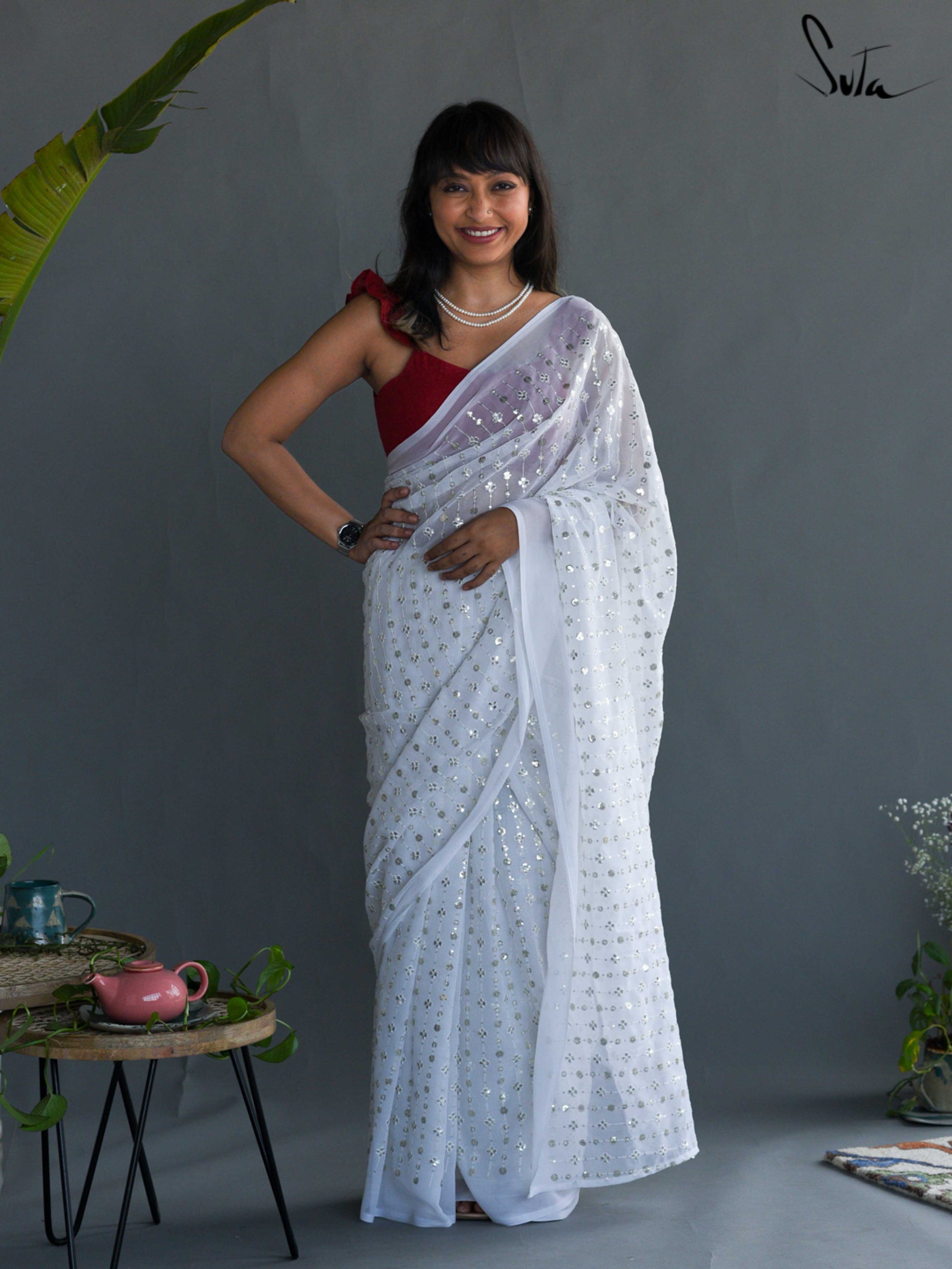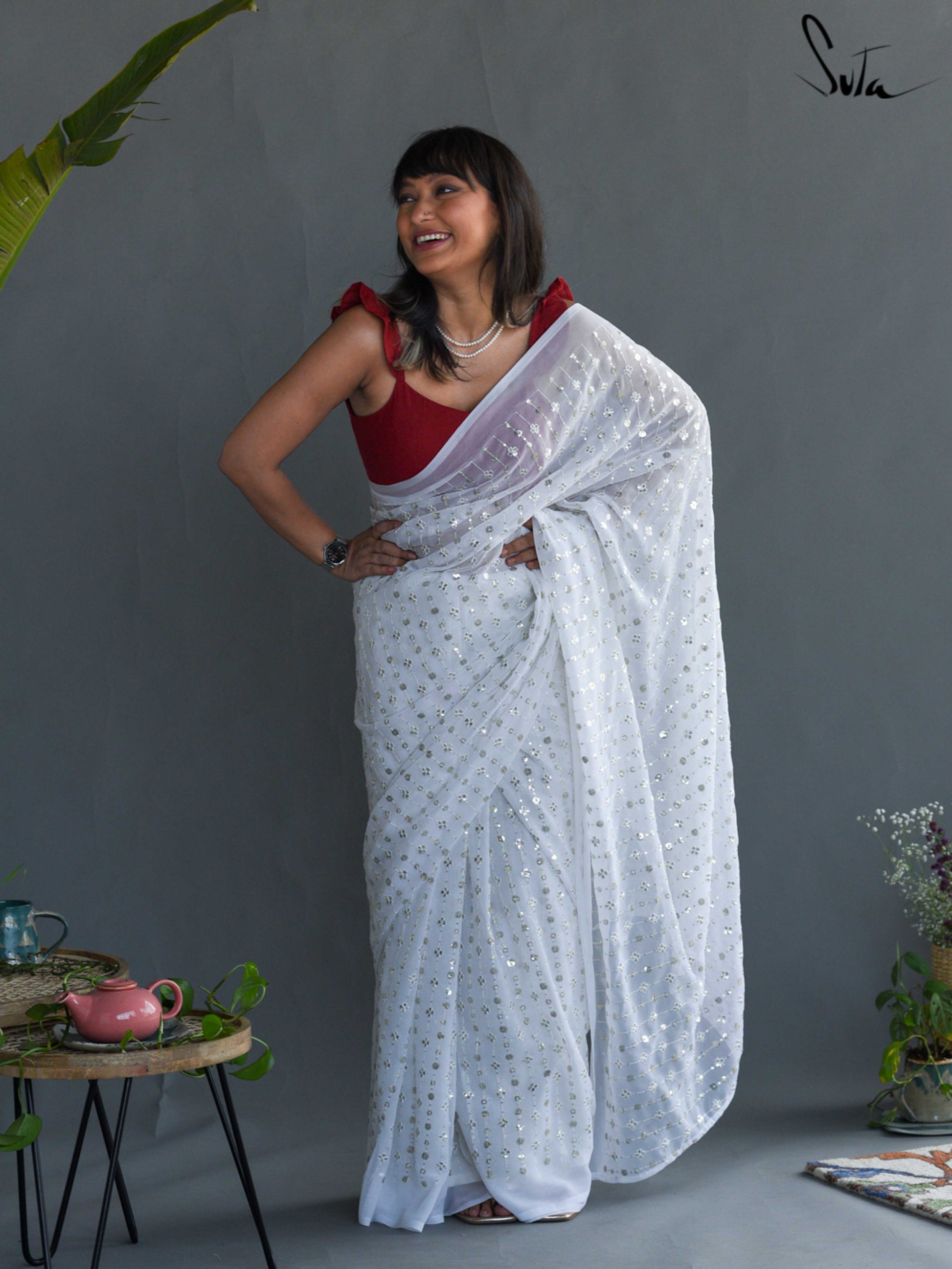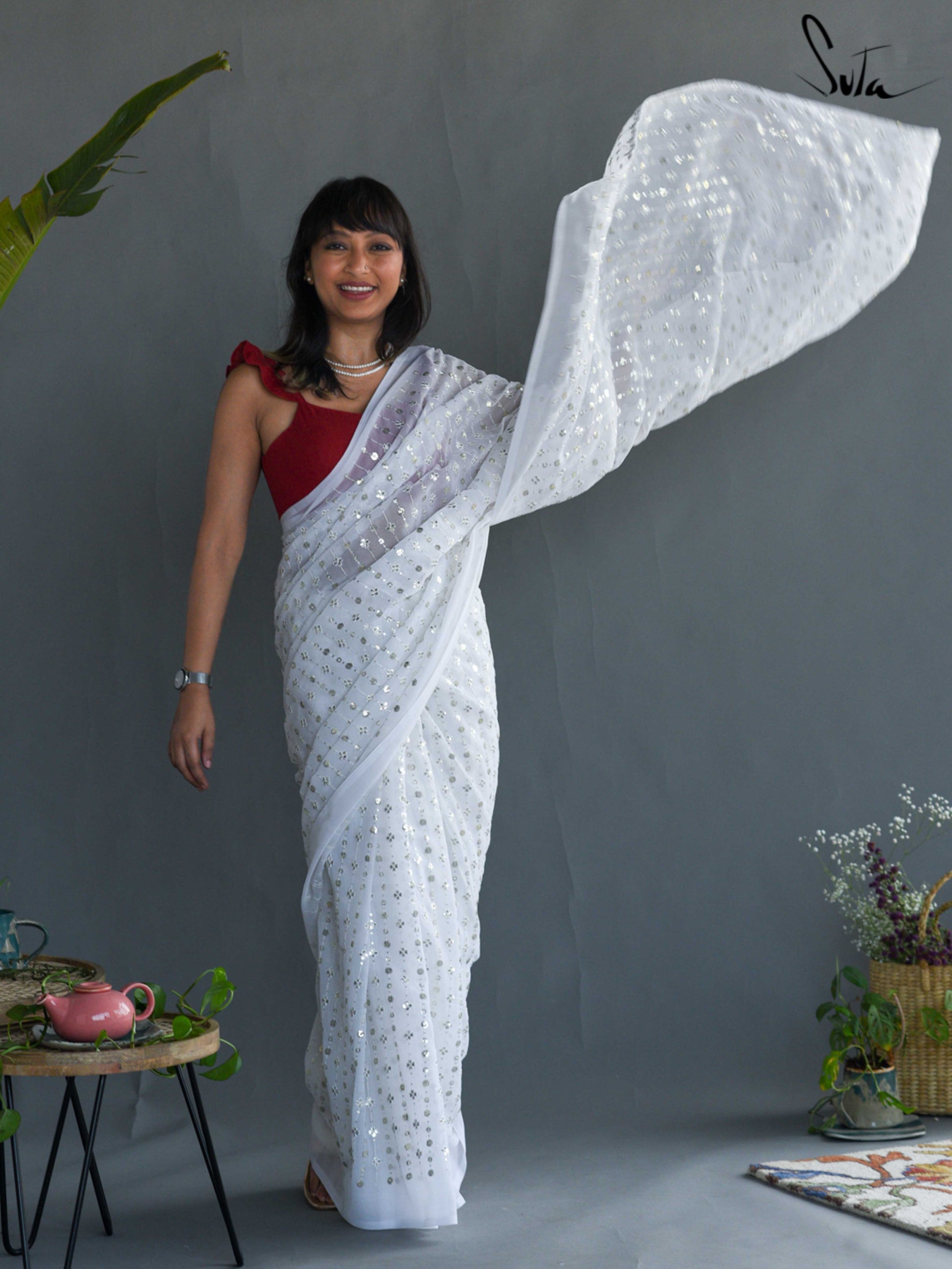 Georgette is a type of crêpe fabric that is sheer and lightweight, and has a dull, matte finish. In this saree, viscose fibres have been used to create the lightest and most effortless georgette.