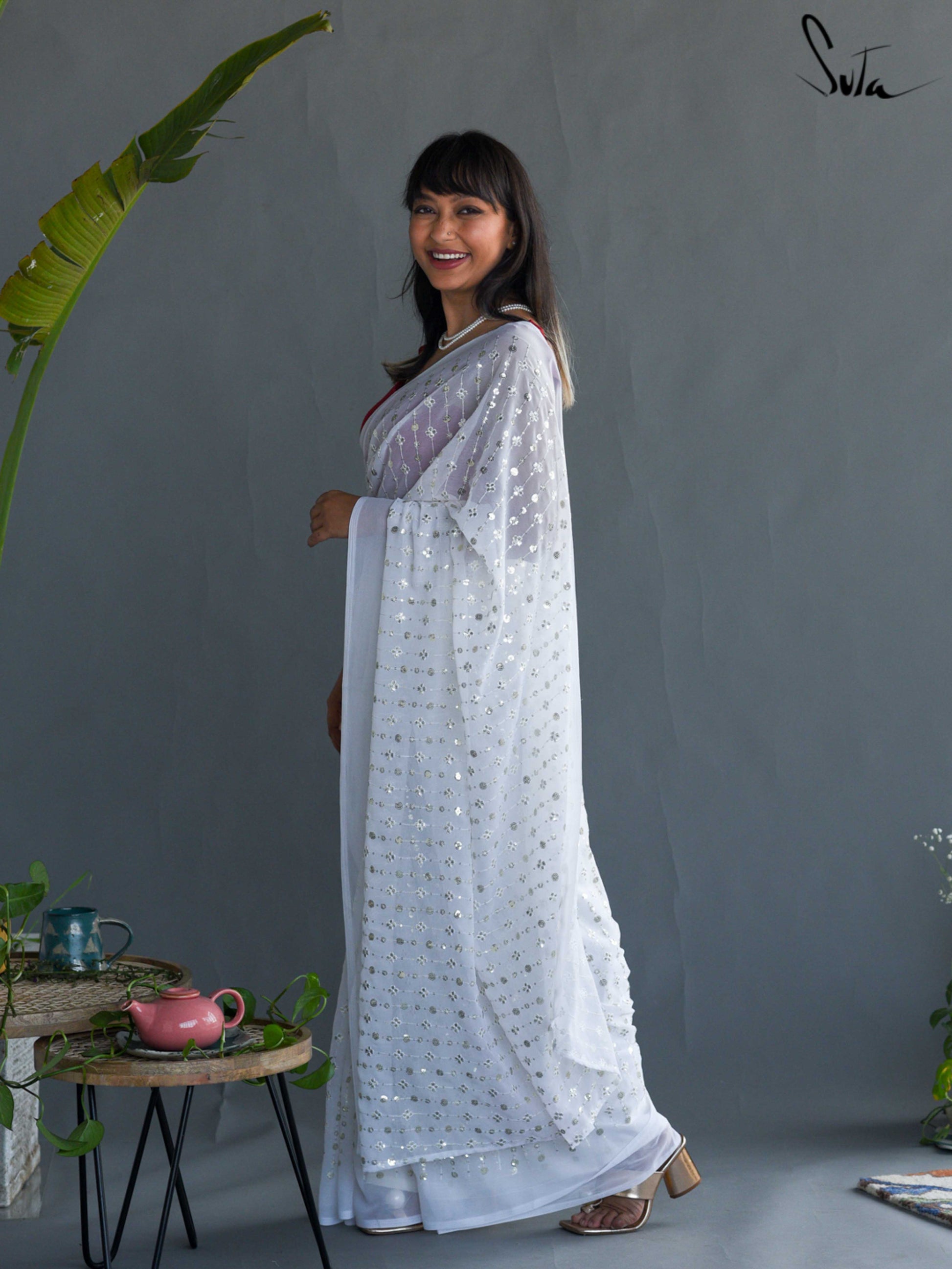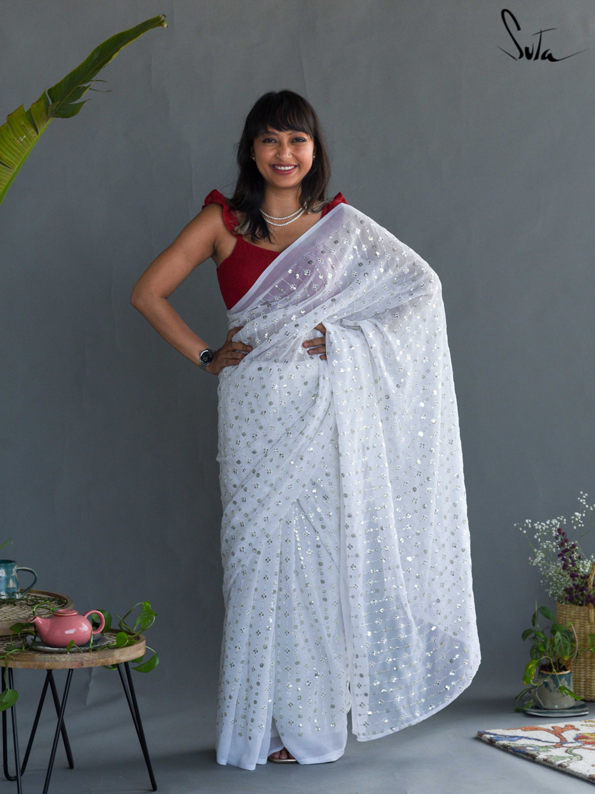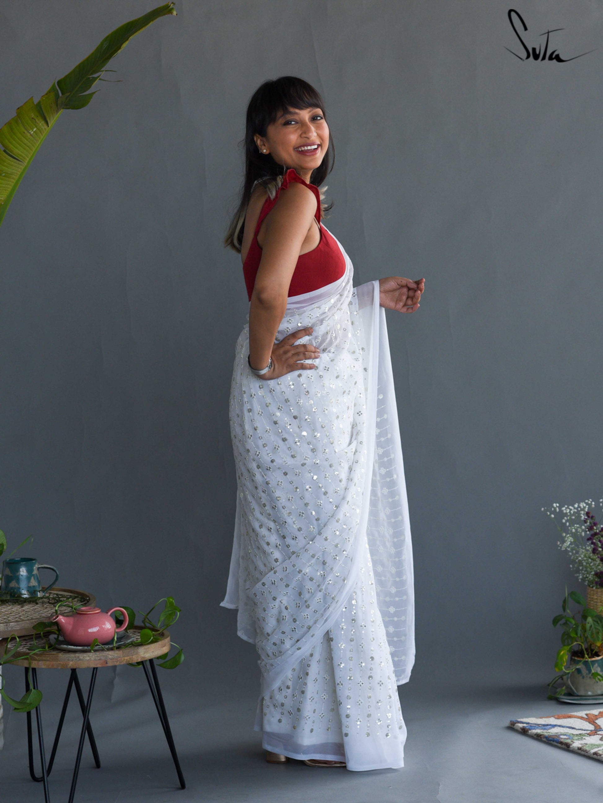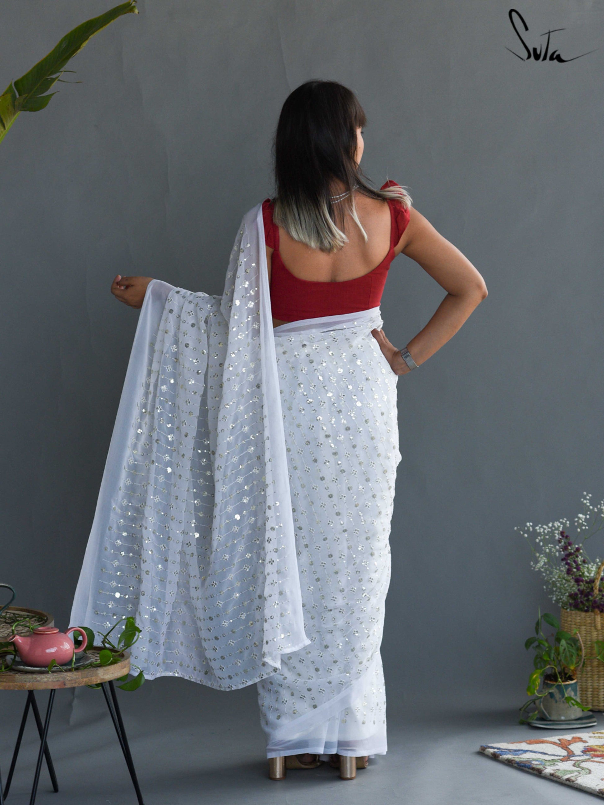 Georgette is a type of crêpe fabric that is sheer and lightweight, and has a dull, matte finish. In this saree, viscose fibres have been used to create the lightest and most effortless georgette.