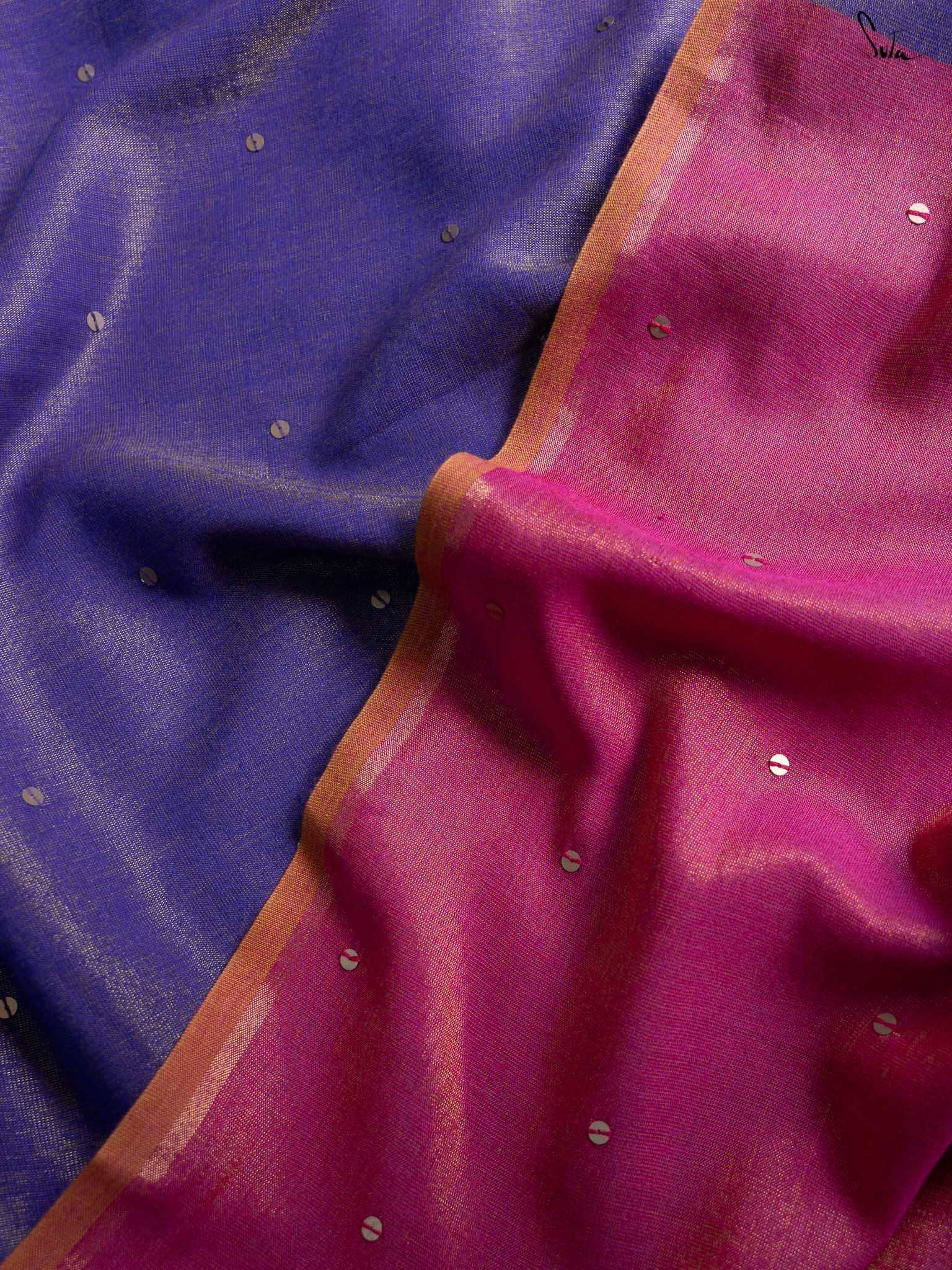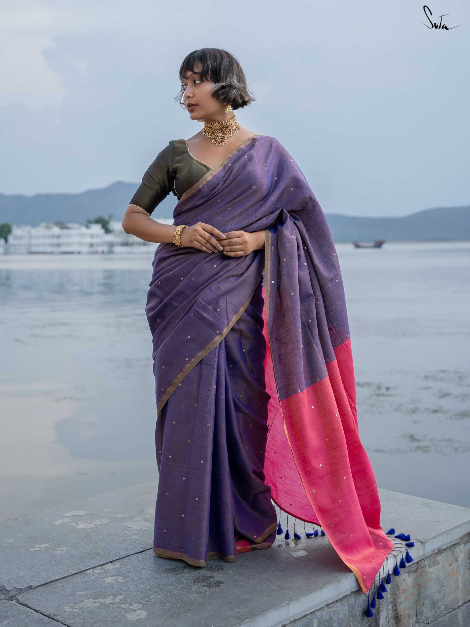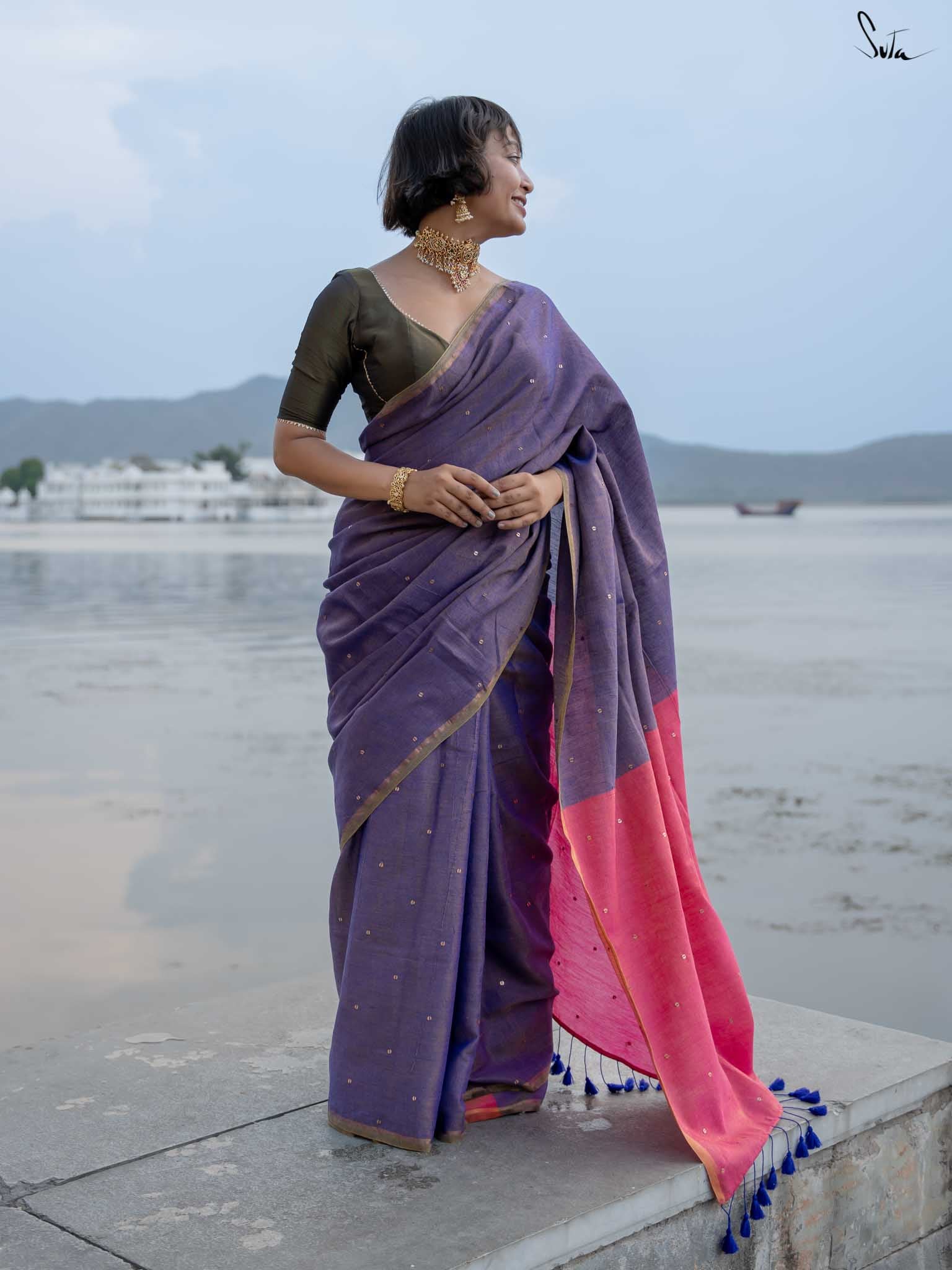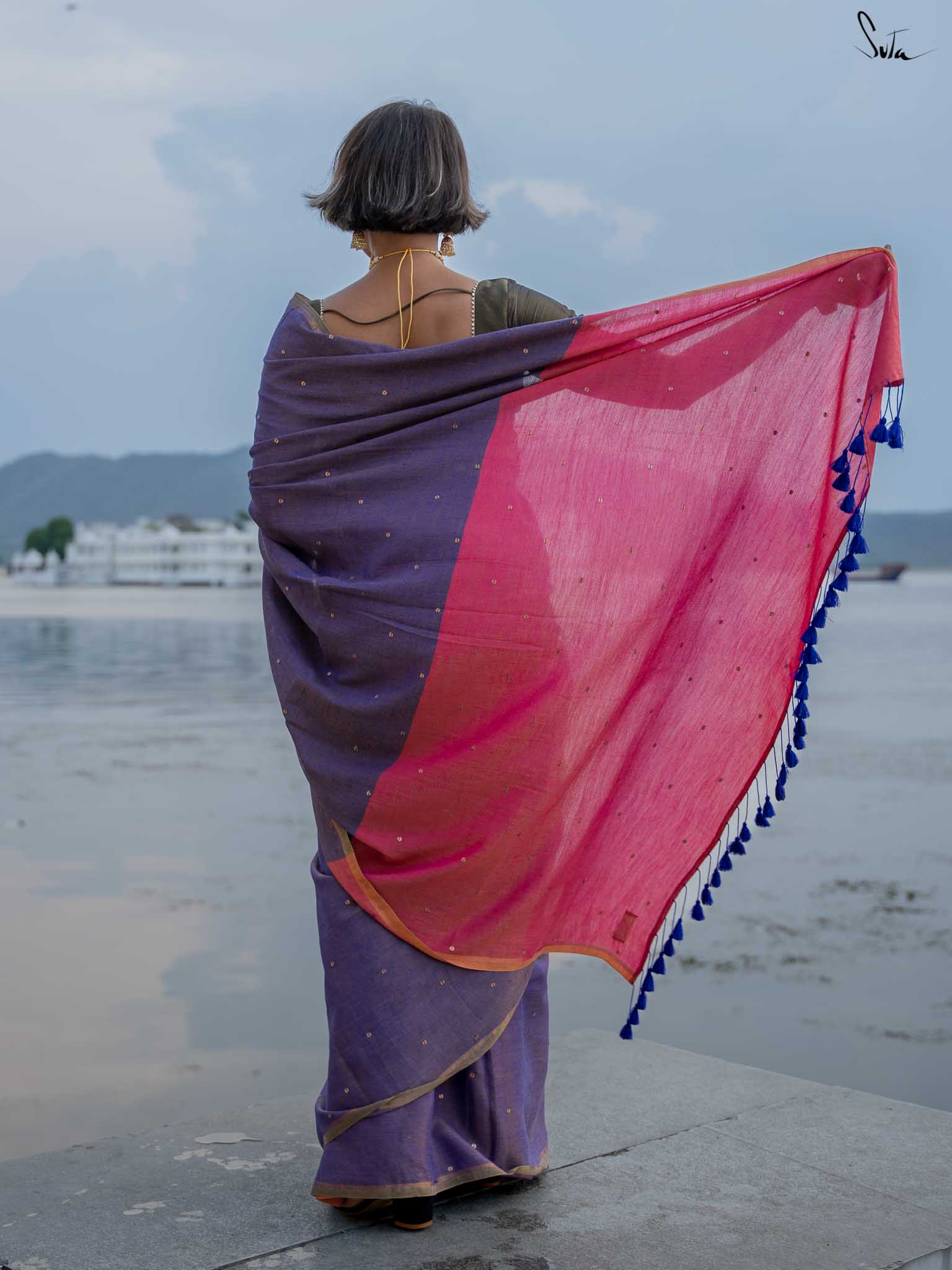 Channel the serene beauty of a night by the sea with Jalpari, a saree from Suta’s Taara collection. Crafted from rich acrylic cotton with zari, this purple saree features hand-embellished chumki work. The saree also comes with an attached pink blouse piece, which can be easily styled into any design or pattern you prefer, making it a versatile addition to your wardrobe. An intricate gold zari border is handcrafted to carry the brilliance of the stars wherever you go. The contrasting pink pallu adds a graceful touch, making Jalpari a perfect choice for those who embrace their inner mermaid and shine effortlessly.
