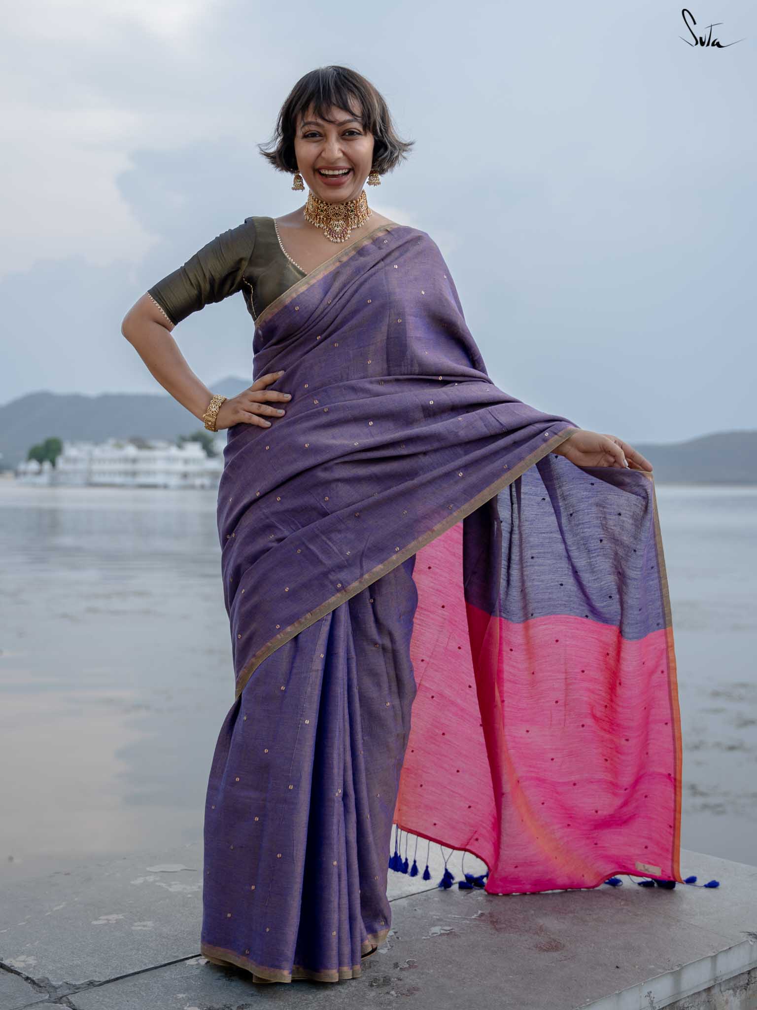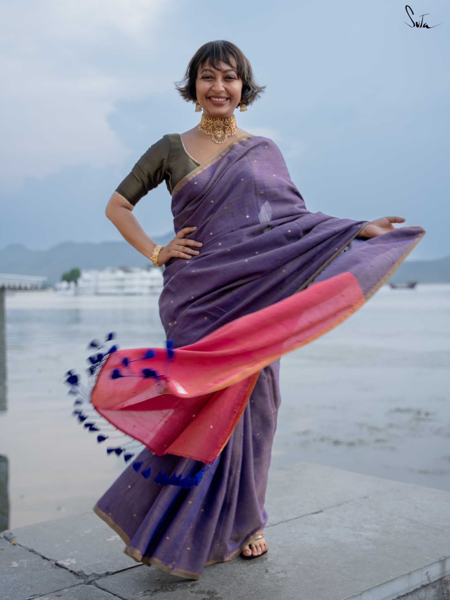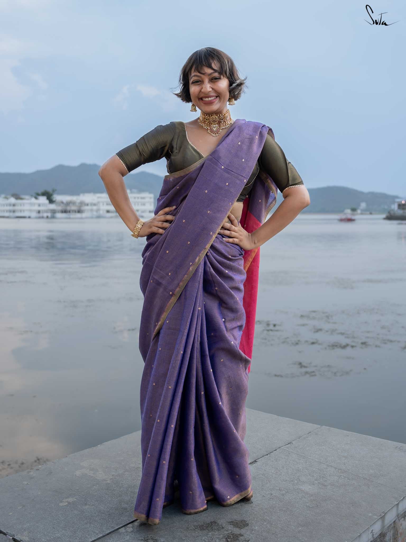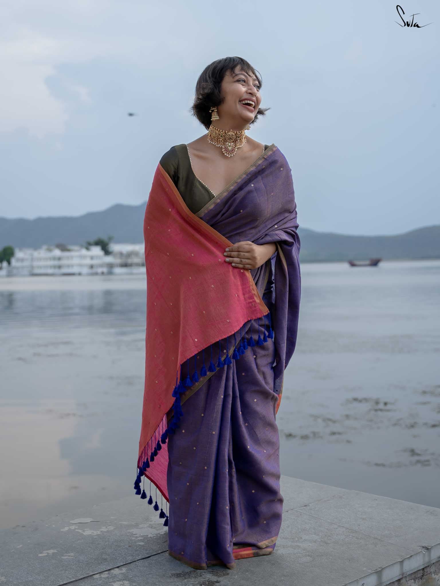 Channel the serene beauty of a night by the sea with Jalpari, a saree from Suta’s Taara collection. Crafted from rich acrylic cotton with zari, this purple saree features hand-embellished chumki work. The saree also comes with an attached pink blouse piece, which can be easily styled into any design or pattern you prefer, making it a versatile addition to your wardrobe. An intricate gold zari border is handcrafted to carry the brilliance of the stars wherever you go. The contrasting pink pallu adds a graceful touch, making Jalpari a perfect choice for those who embrace their inner mermaid and shine effortlessly.