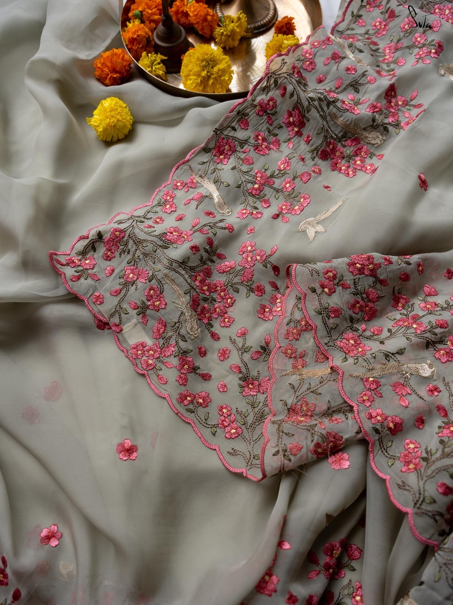 Meticulously embellished scalloped border creates a charming contrast, complementing the embroidery crafted on the fabric.