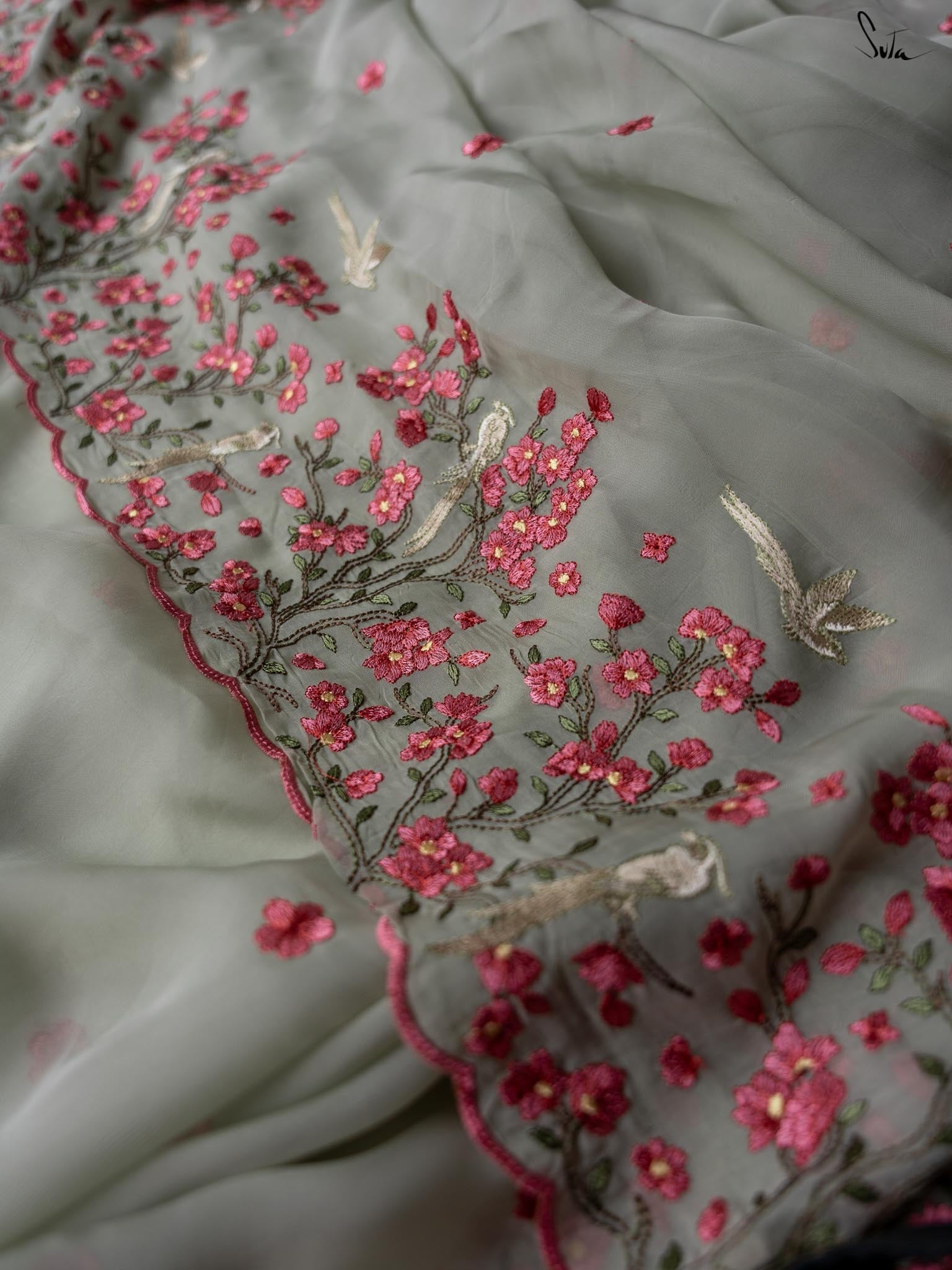 This mint green saree is crafted from viscose organza fabric with intricate embroidery, depicting soothing scenes of cherry blossom trees and birds. The tiny pink flower buttis dancing all over the saree is the optimal final touch.