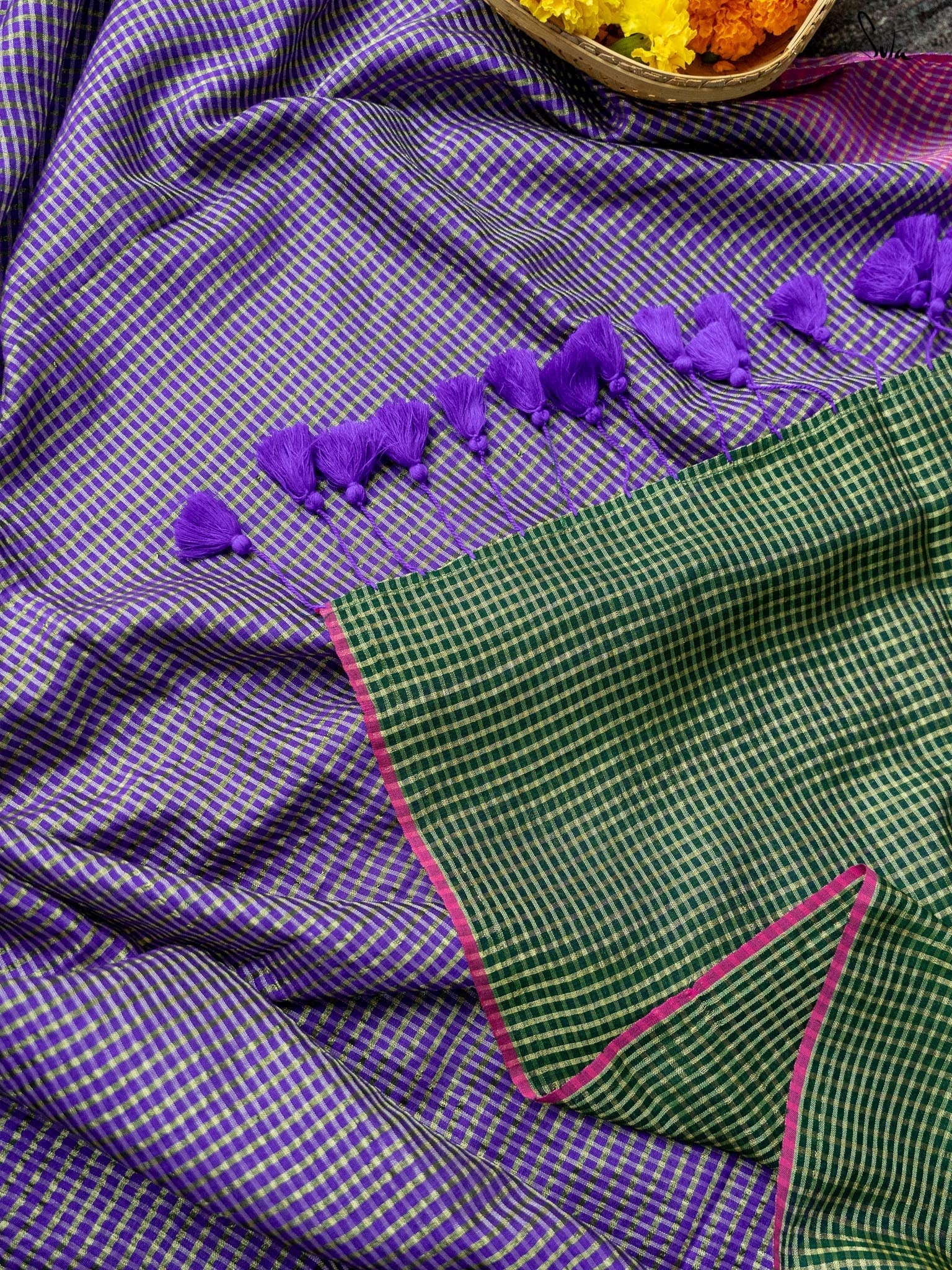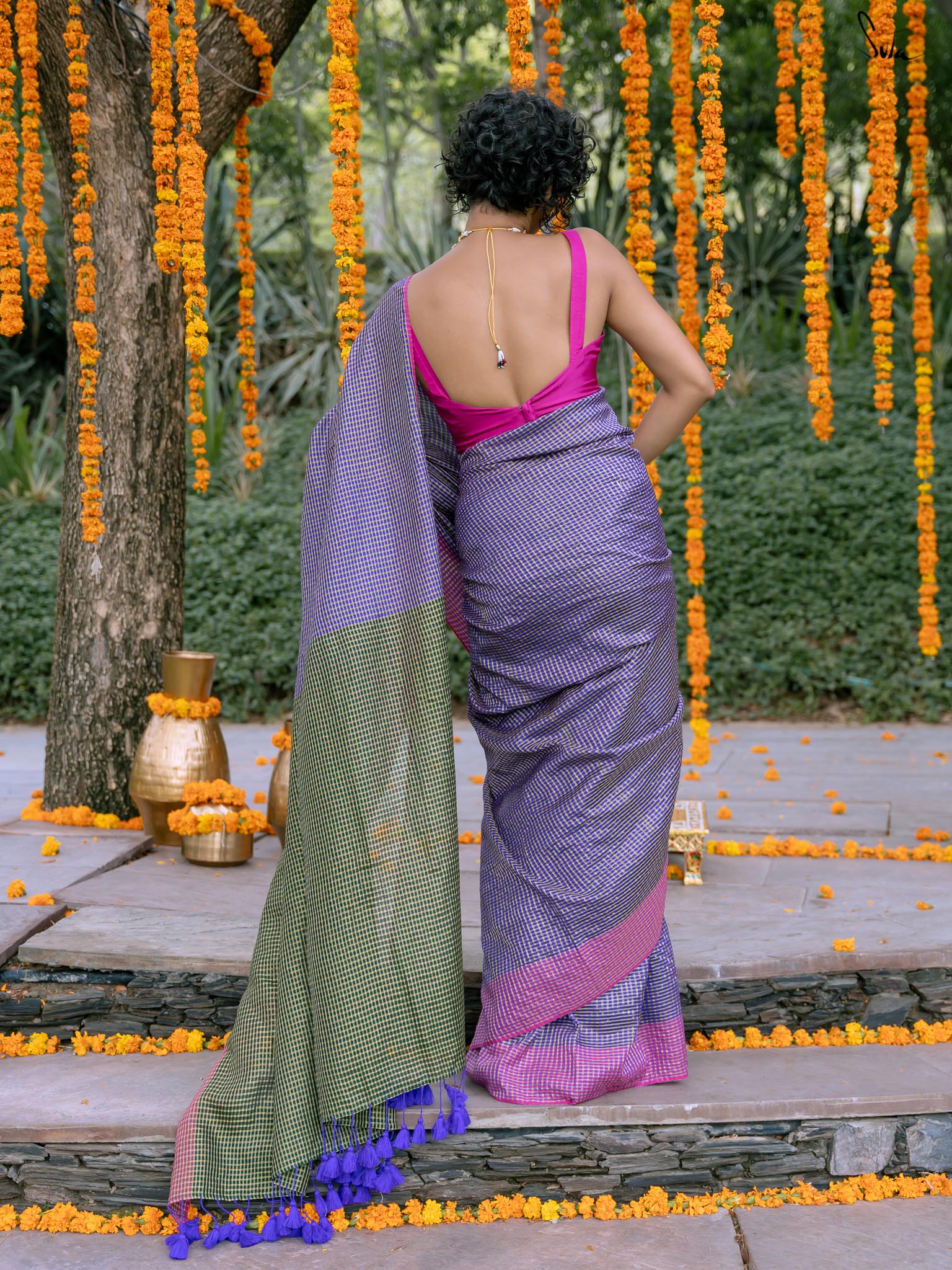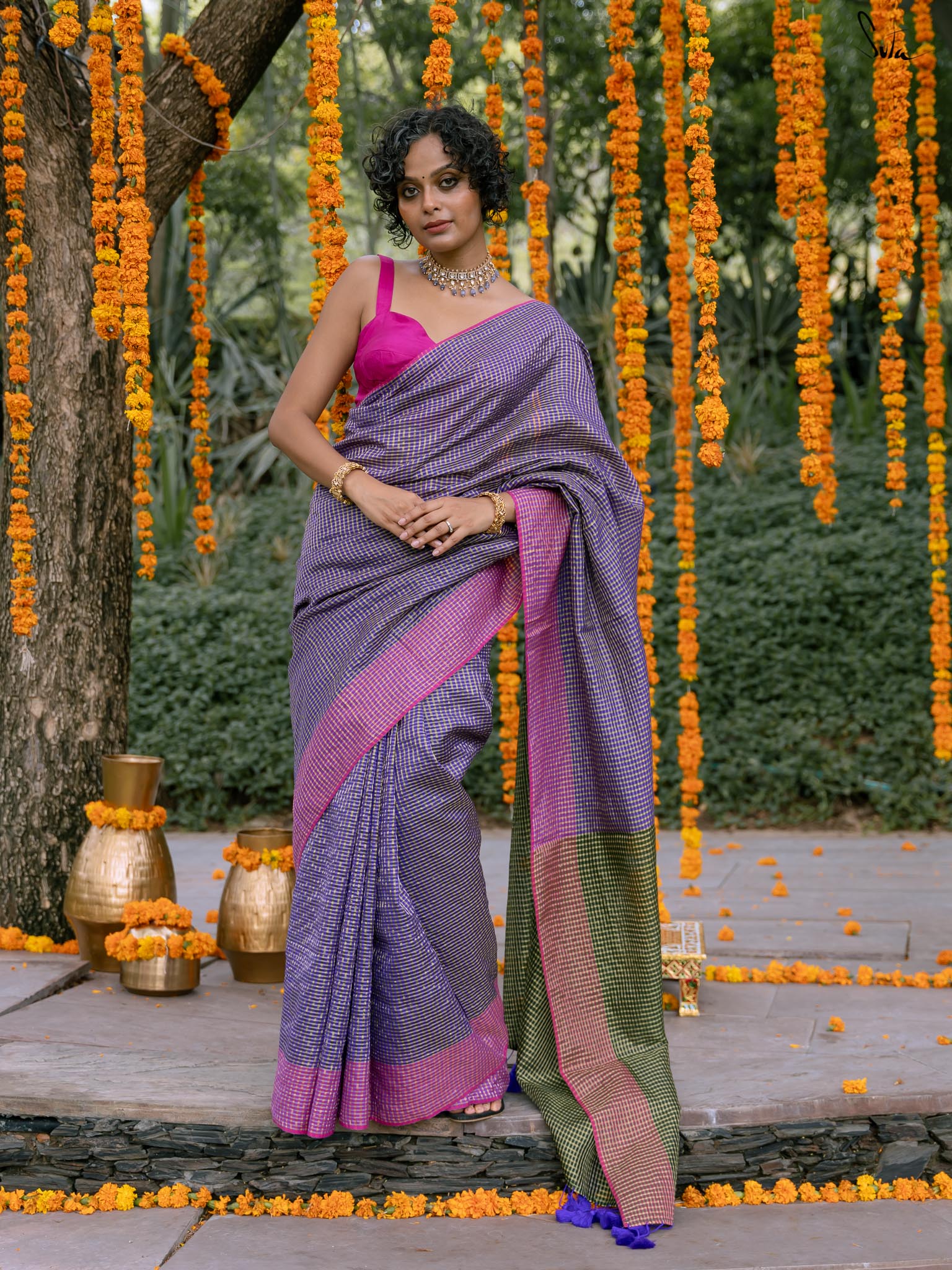 The 'Jashn ka Rang' saree, crafted from rich cotton acrylic zari, features a sensuous lavender base with a contrasting border and pallu. Zari lines running in both warp and weft through the saree enhance its beauty, making it a standout choice for festivities. Drape it with the 'Pushkara' blouse from Suta for a pinpoint look.