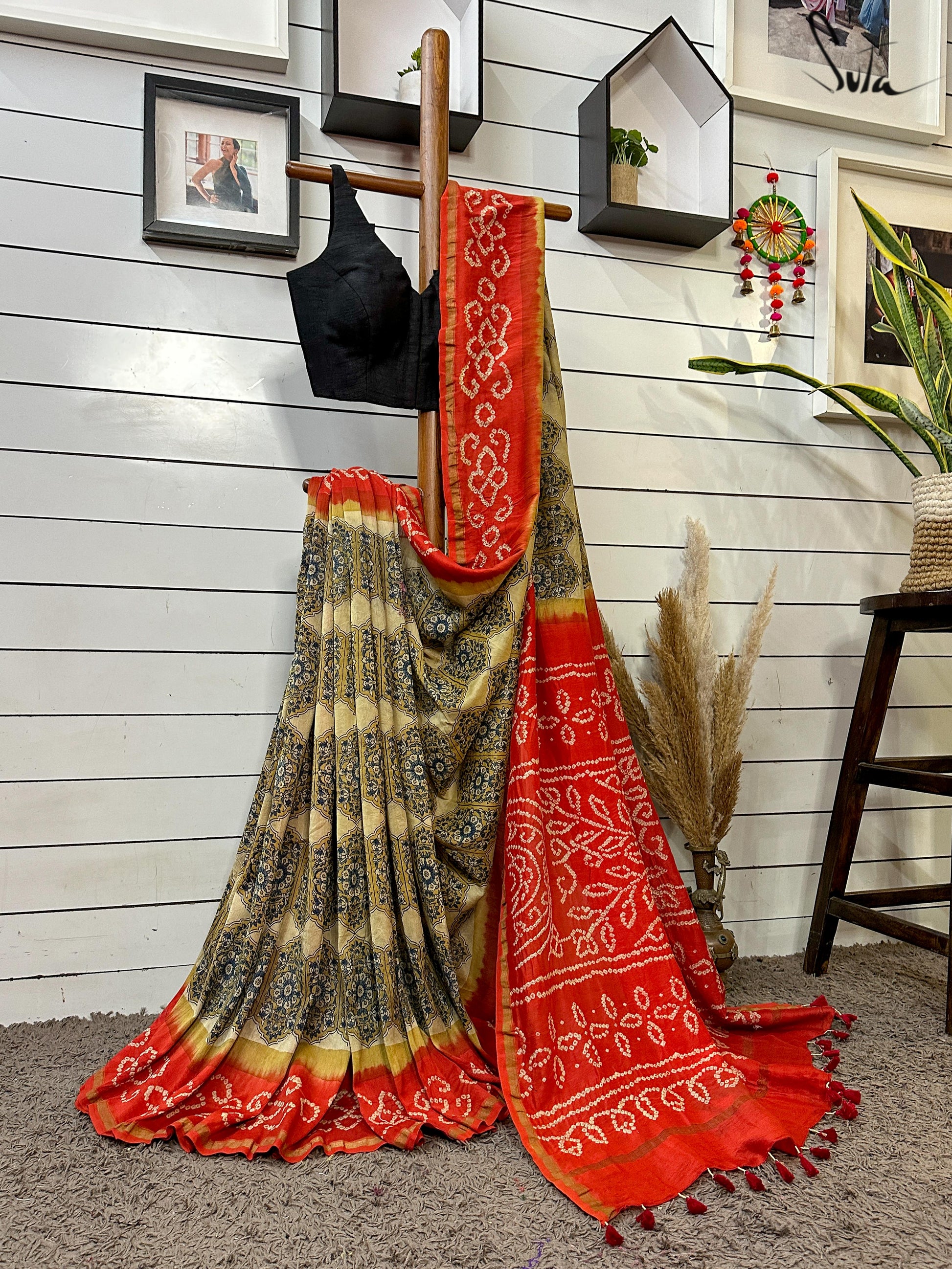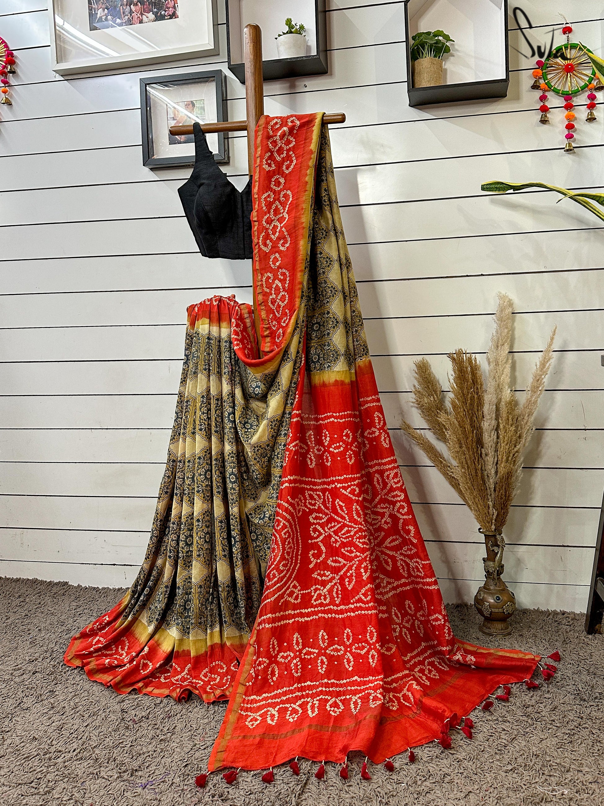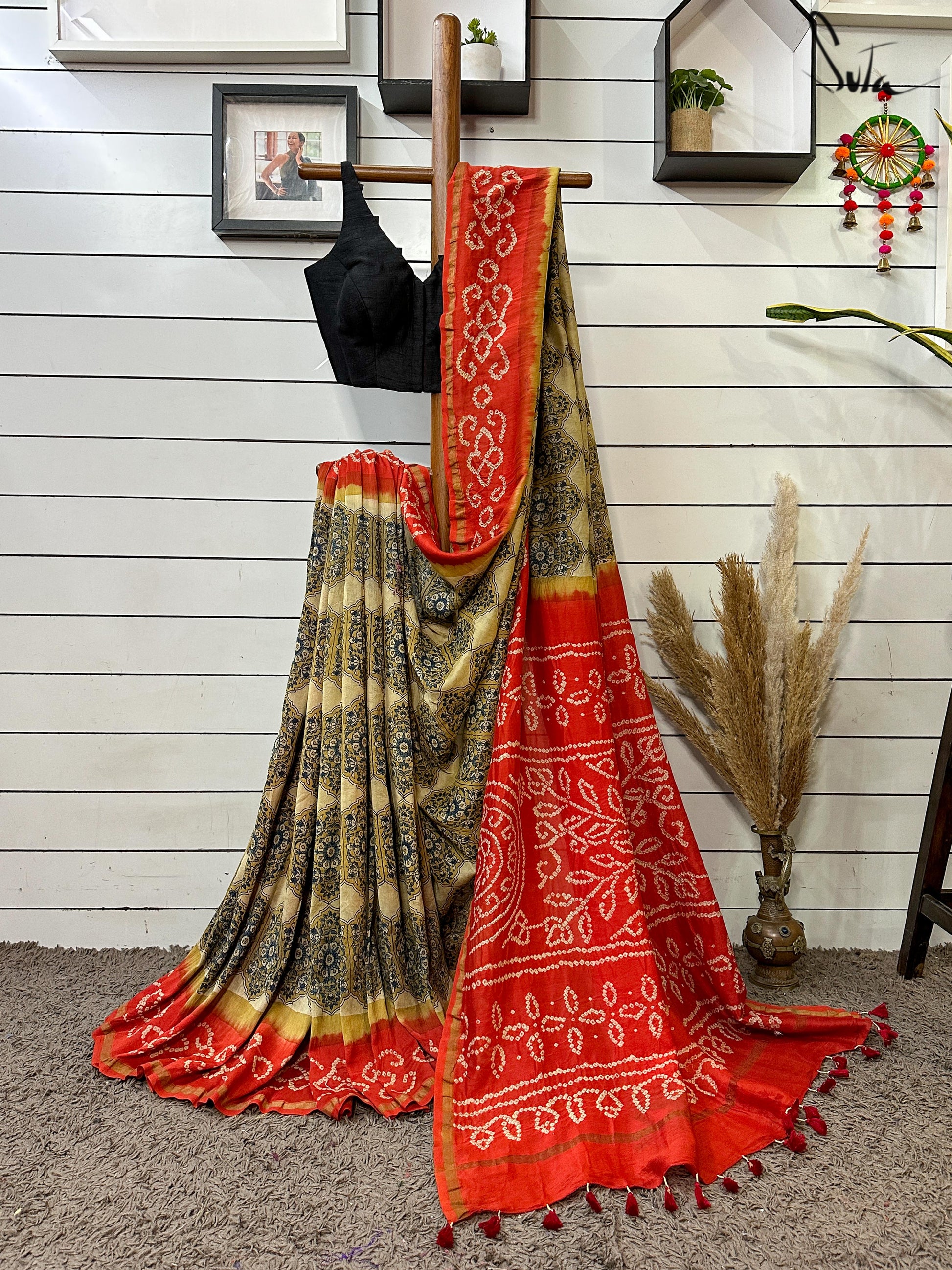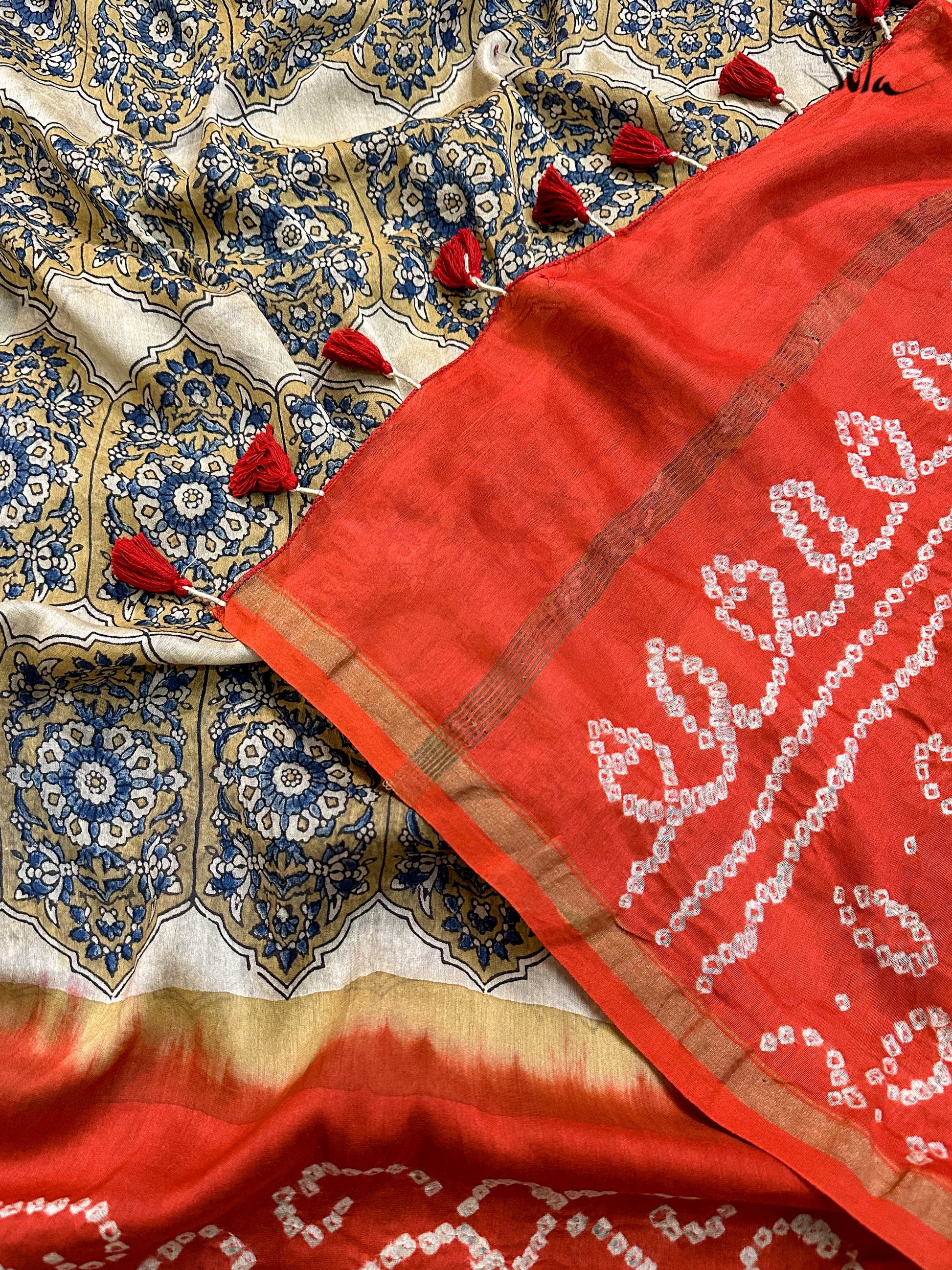 Fabric: Saree chanderi pbb ajrakh body bandhani