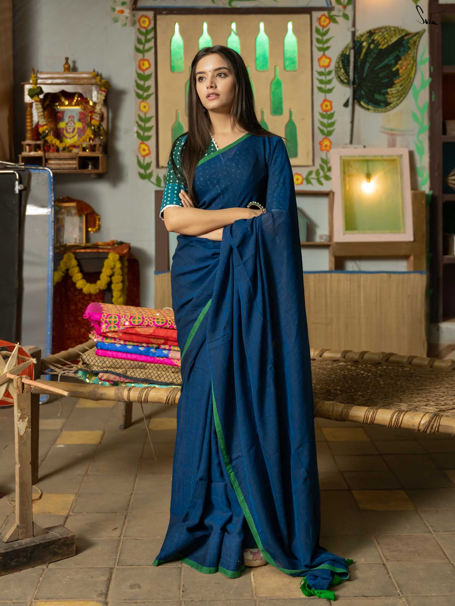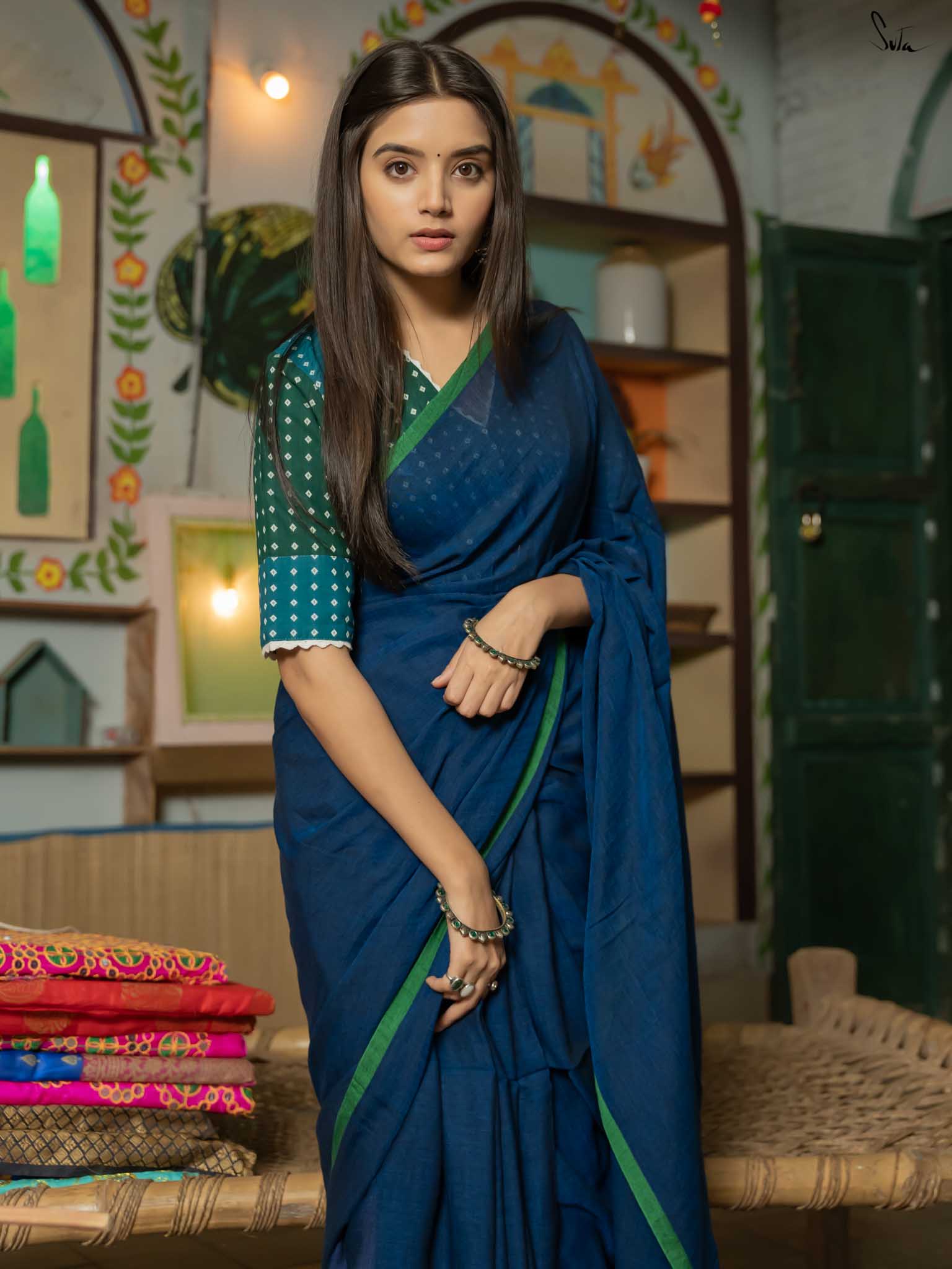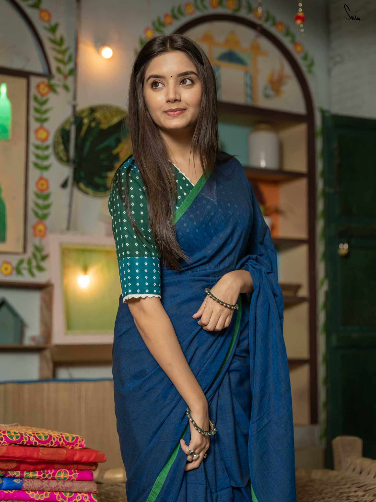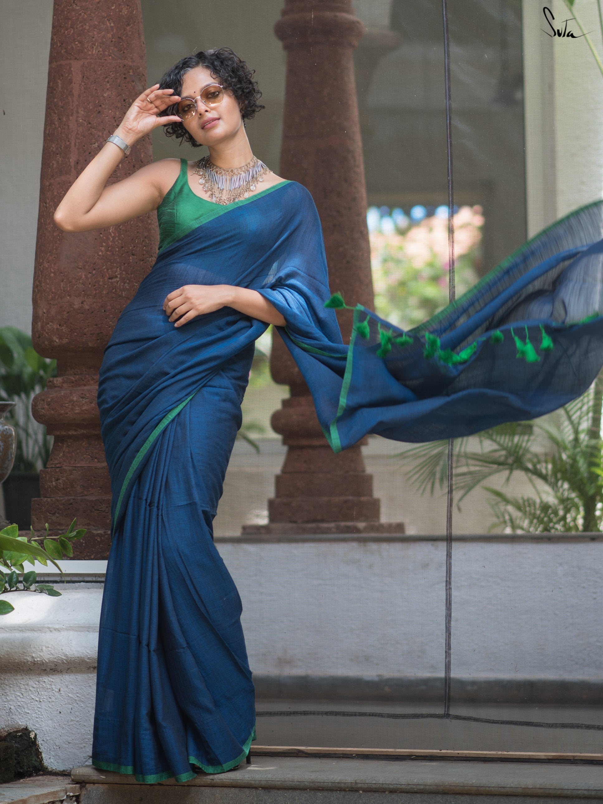This blue cotton saree with a touch of mul and viscose slub is prettiness redefined!