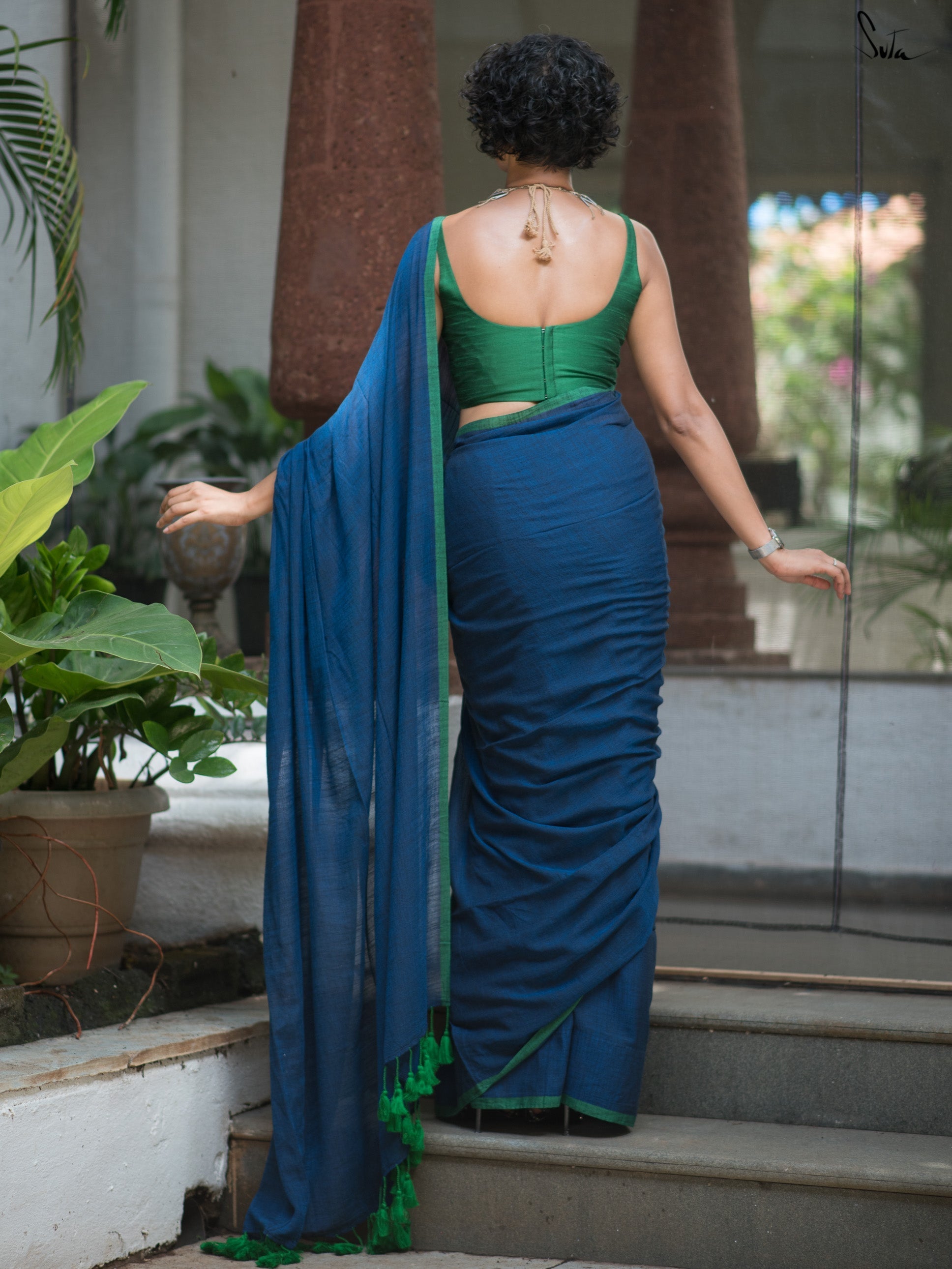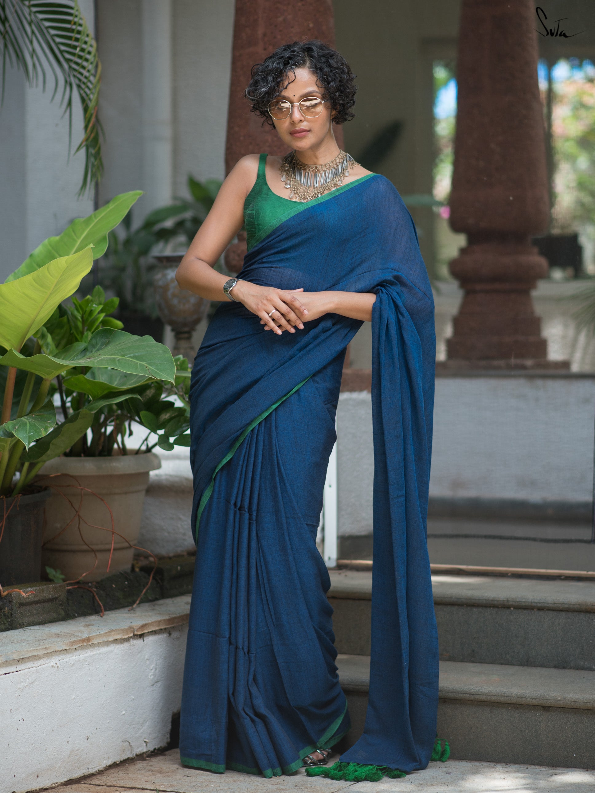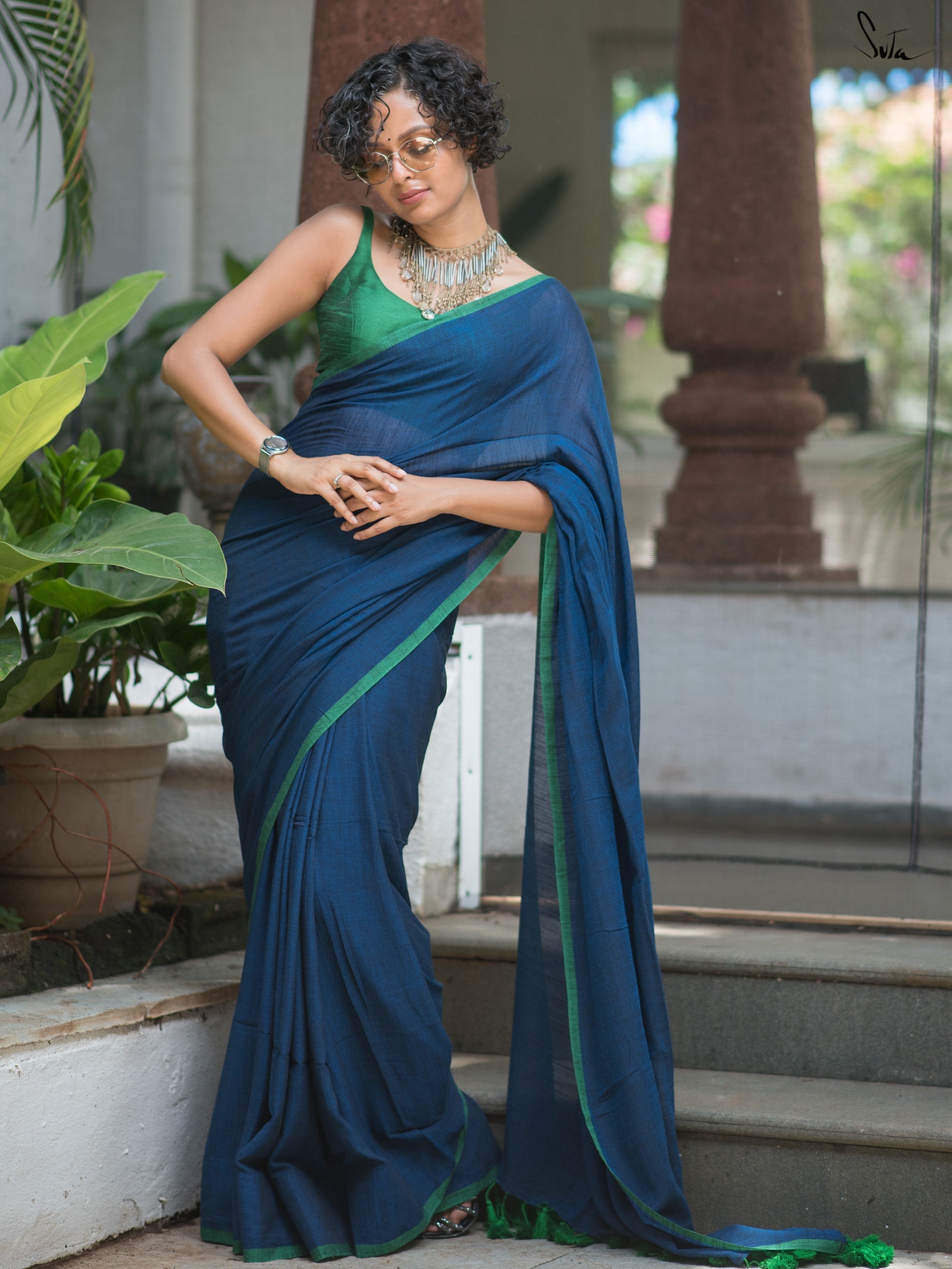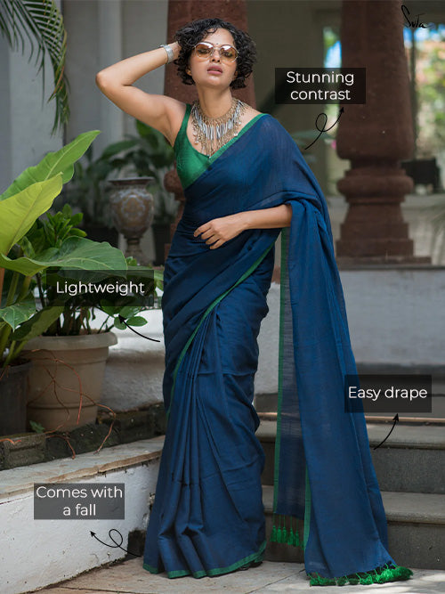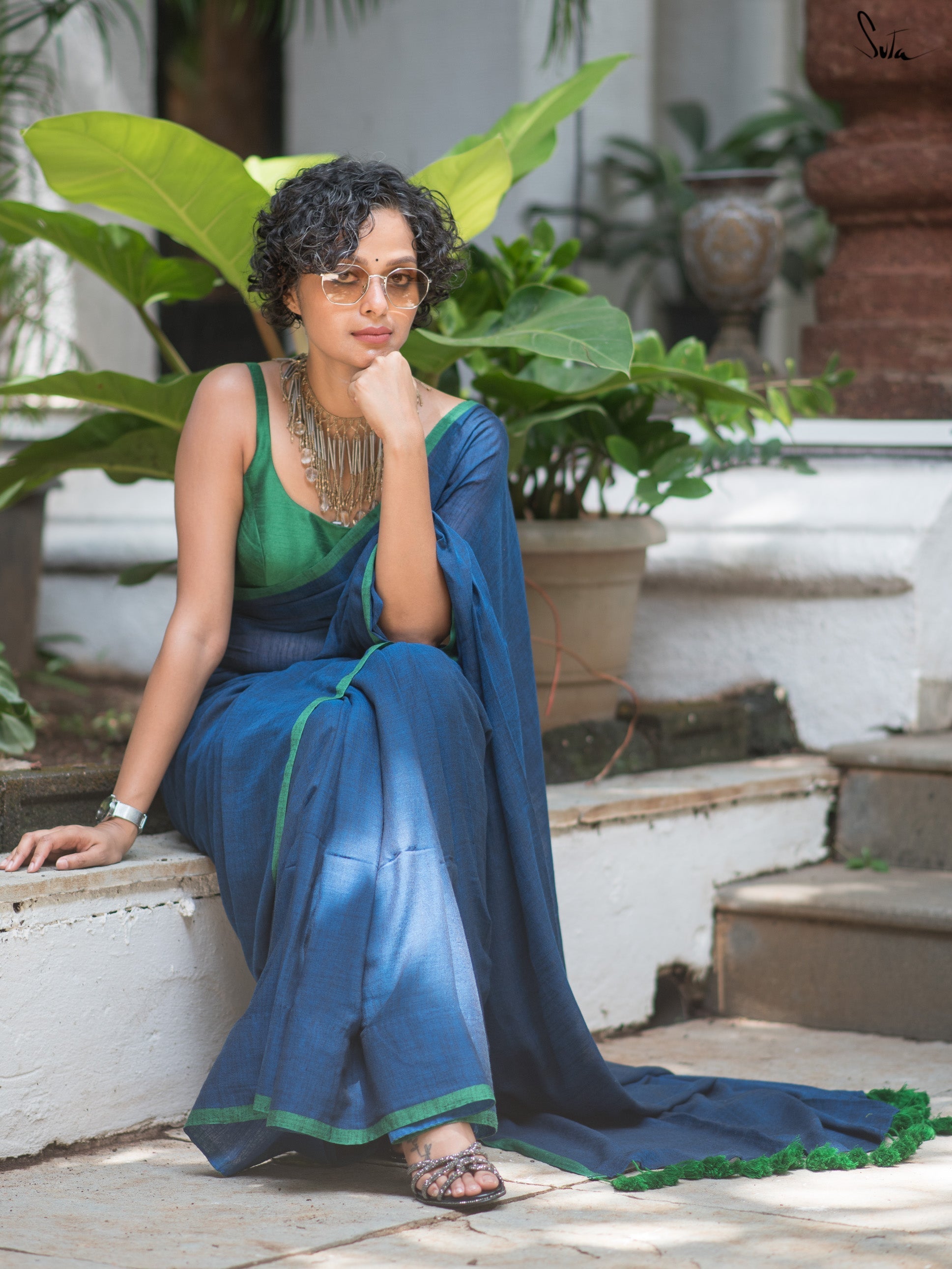 This blue cotton saree with a touch of mul and viscose slub is prettiness redefined!