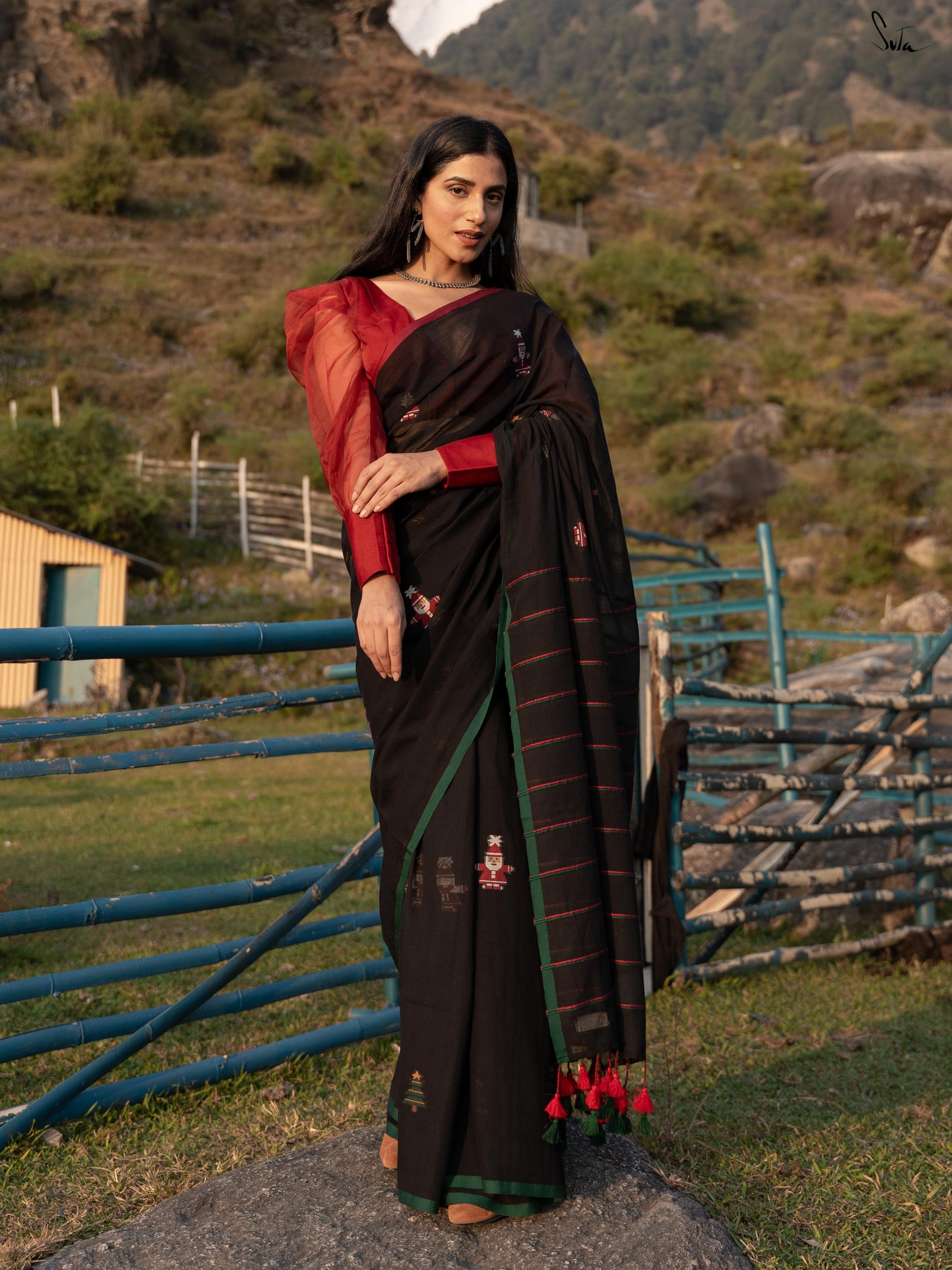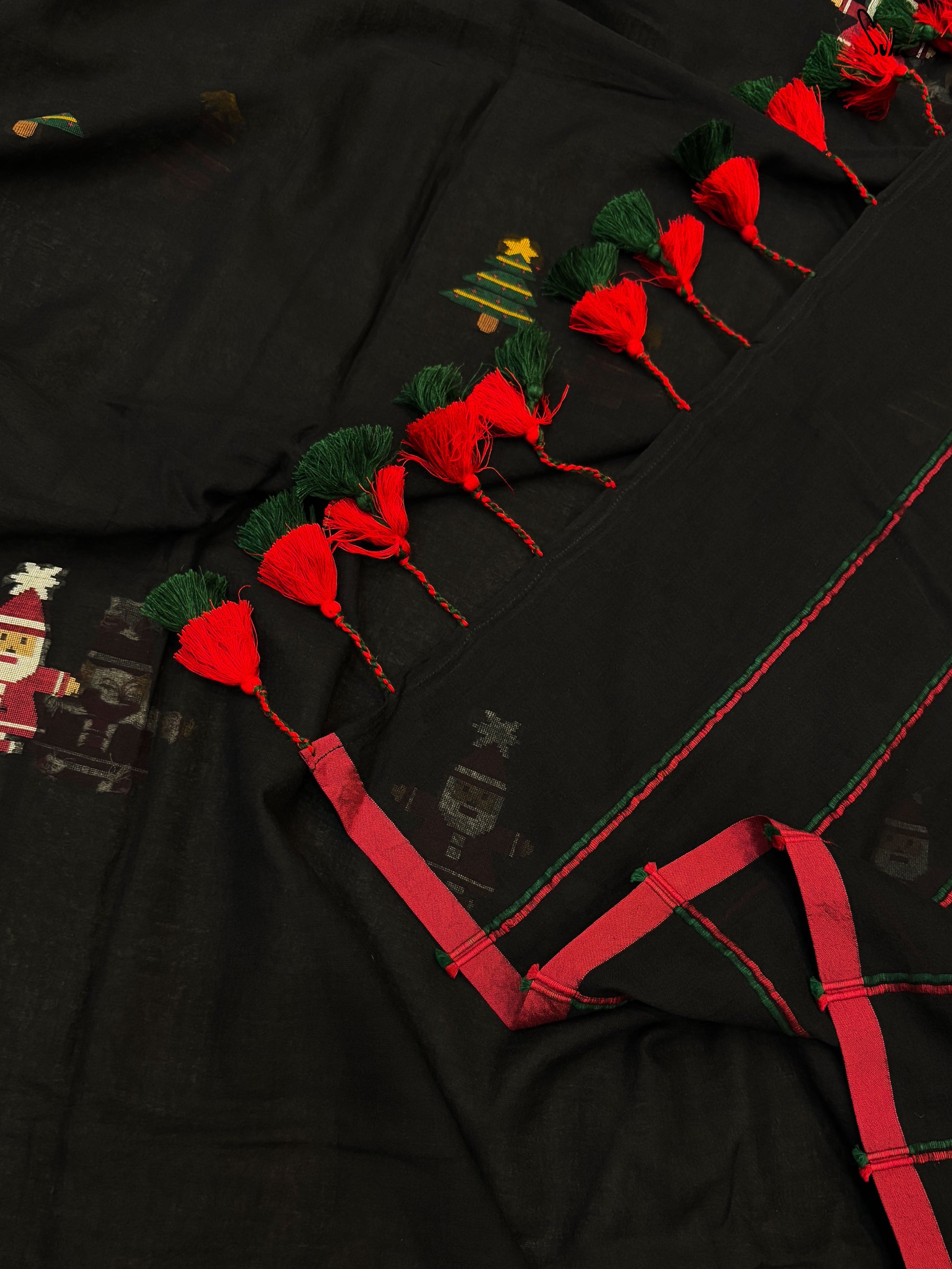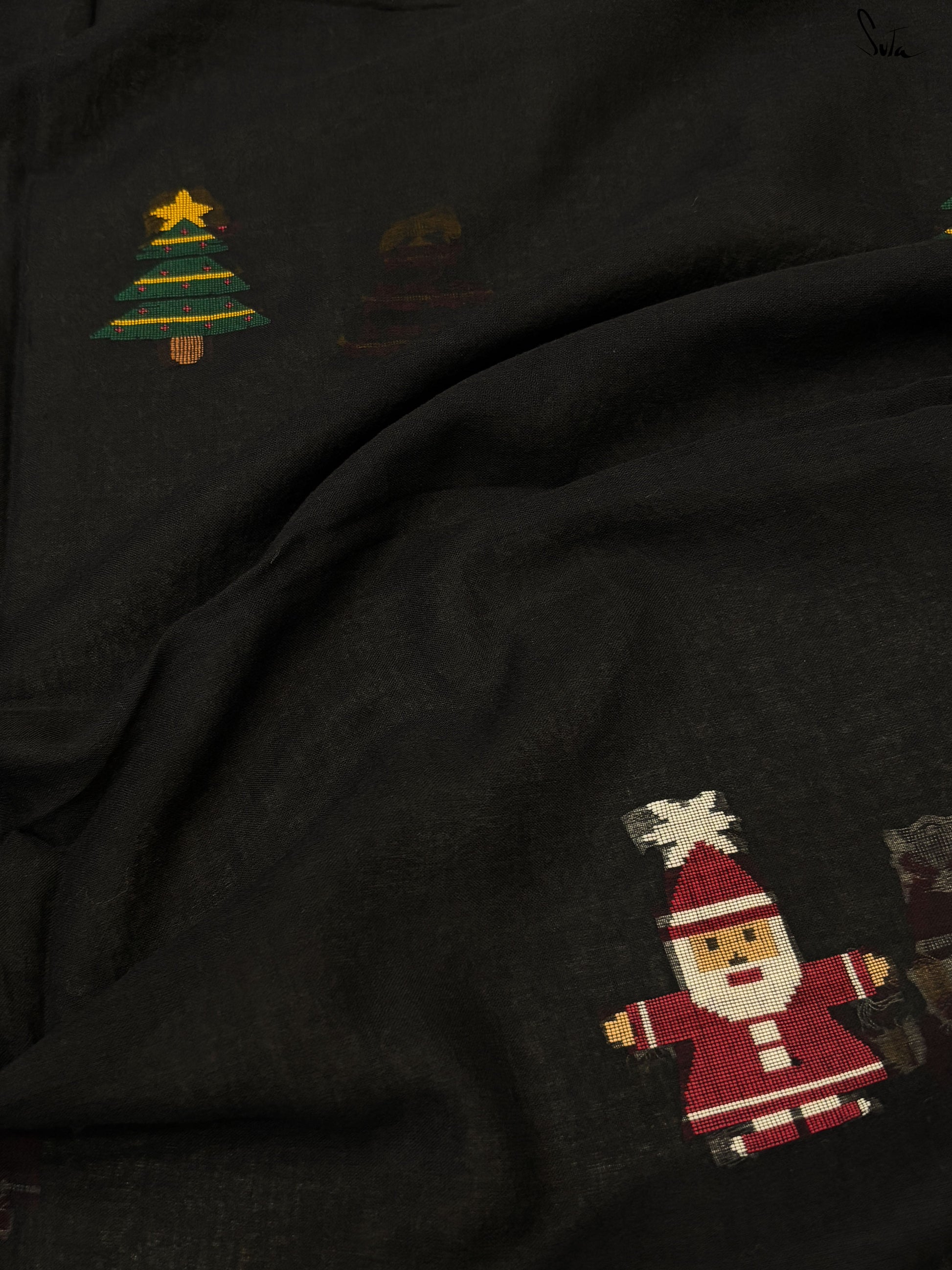 Unwrap the magic of Jolly Pines, where every thread tells a festive tale. Crafted from black mul cotton, this saree brings Christmas to life with a vibrant red and green border. The delicate Christmas tree motifs, sprinkled like pine leaves, weave a beautiful holiday story. Red and green Khesh stripes in the pallu add a touch of charm. Pair it with the 'Dil Ka Saaya' blouse for a look as timeless and enchanting as a snowy Christmas night!