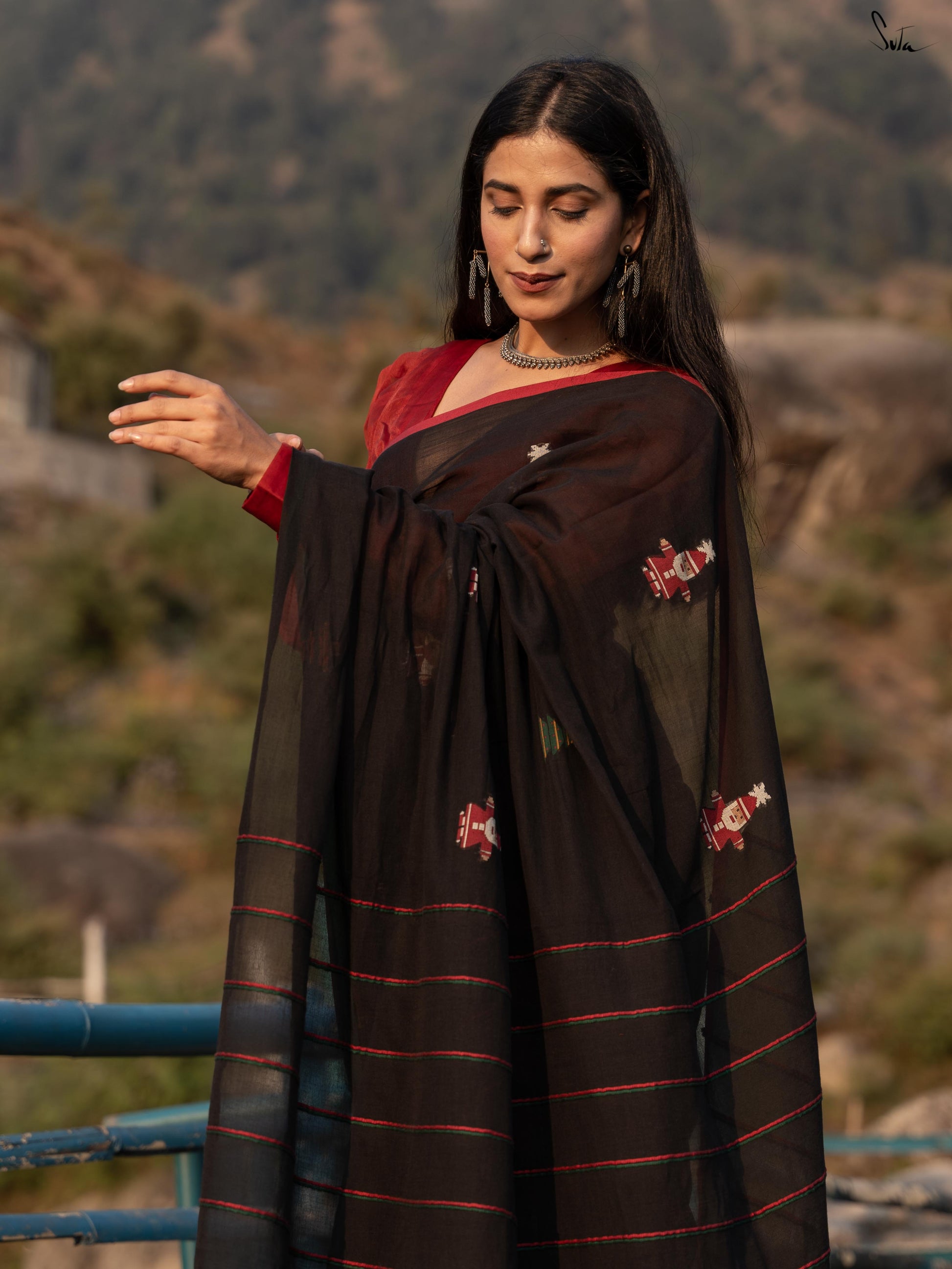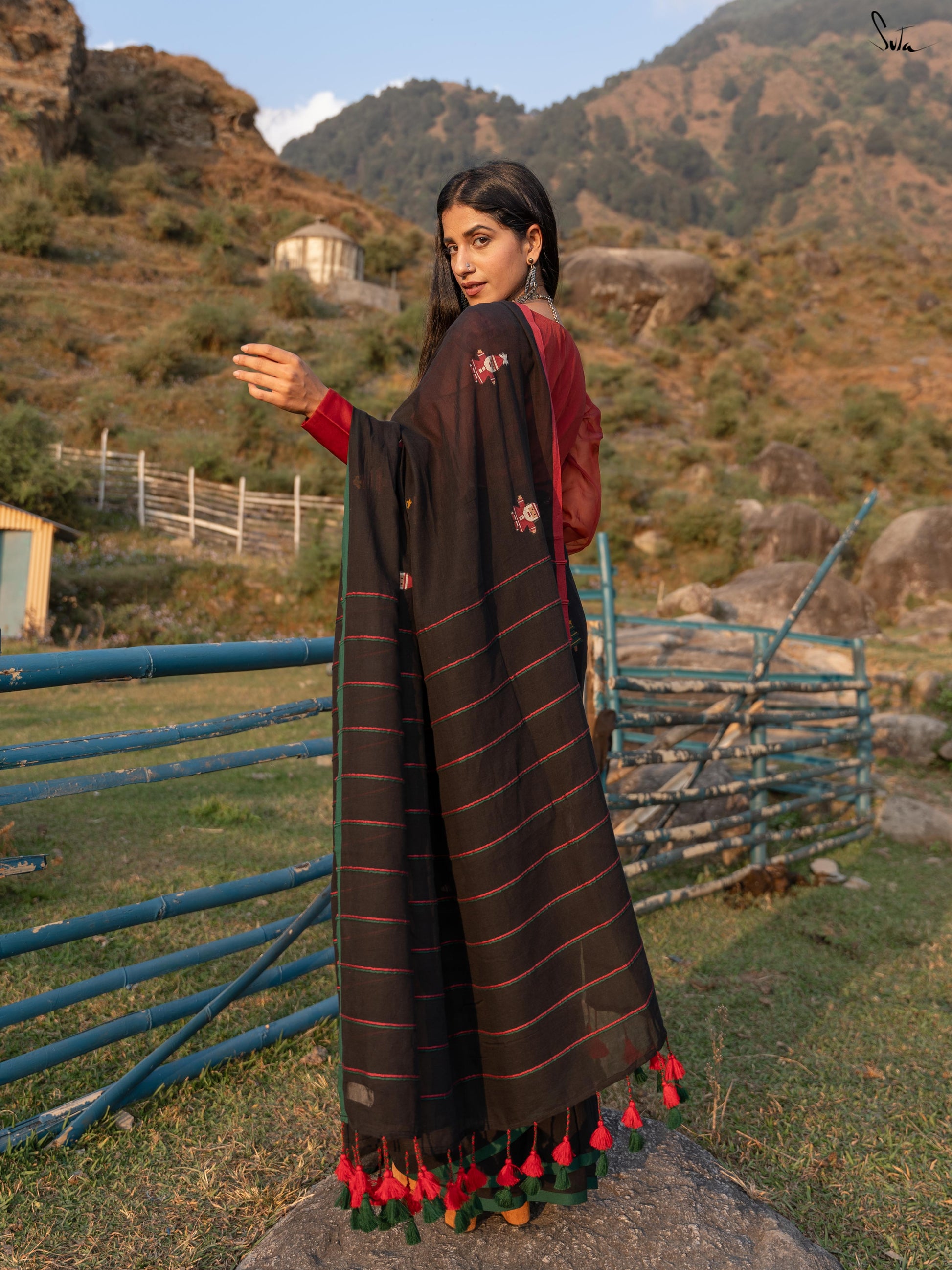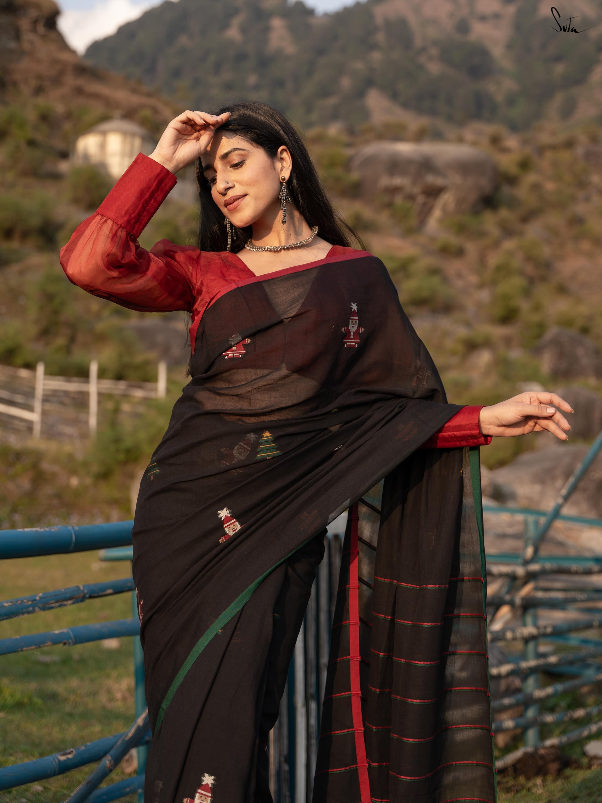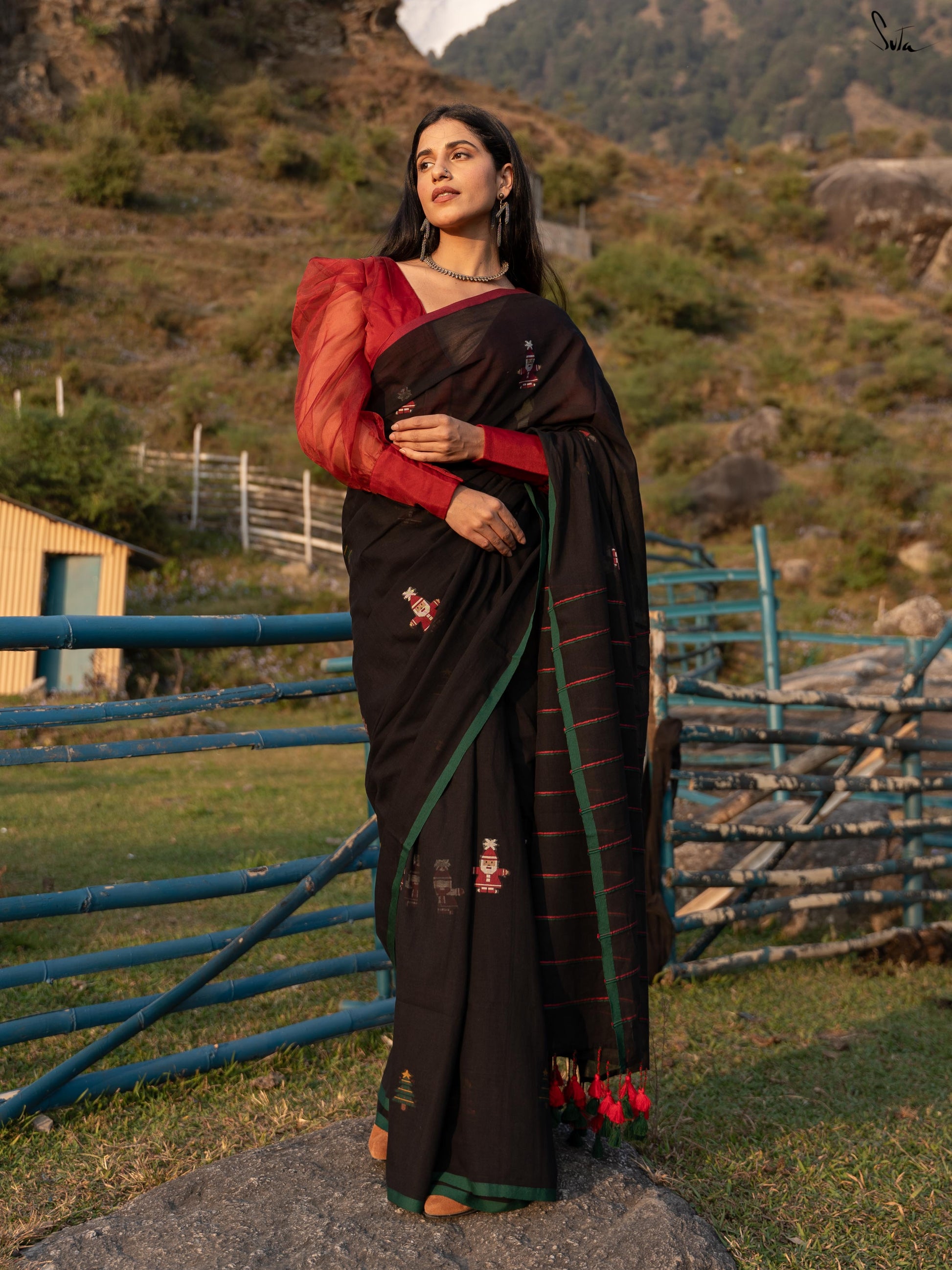 Unwrap the magic of Jolly Pines, where every thread tells a festive tale. Crafted from black mul cotton, this saree brings Christmas to life with a vibrant red and green border. The delicate Christmas tree motifs, sprinkled like pine leaves, weave a beautiful holiday story. Red and green Khesh stripes in the pallu add a touch of charm. Pair it with the 'Dil Ka Saaya' blouse for a look as timeless and enchanting as a snowy Christmas night!