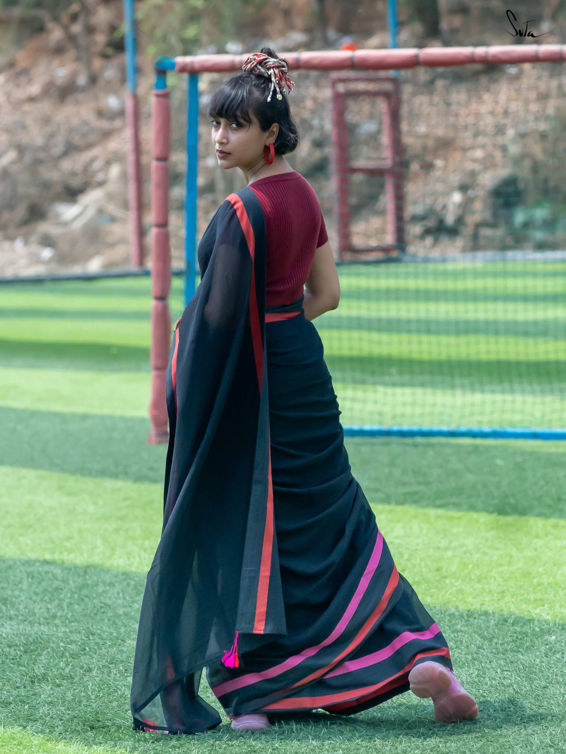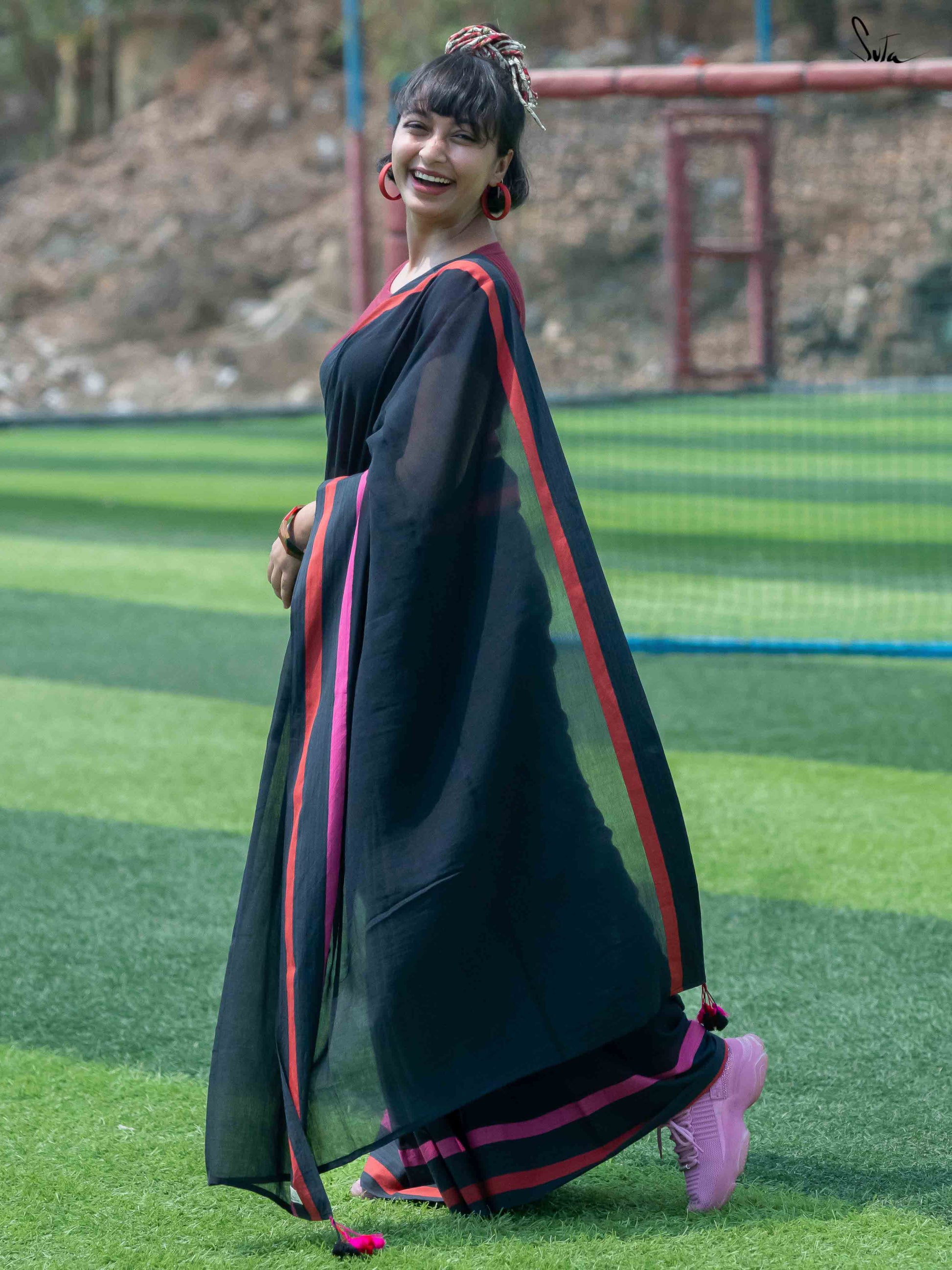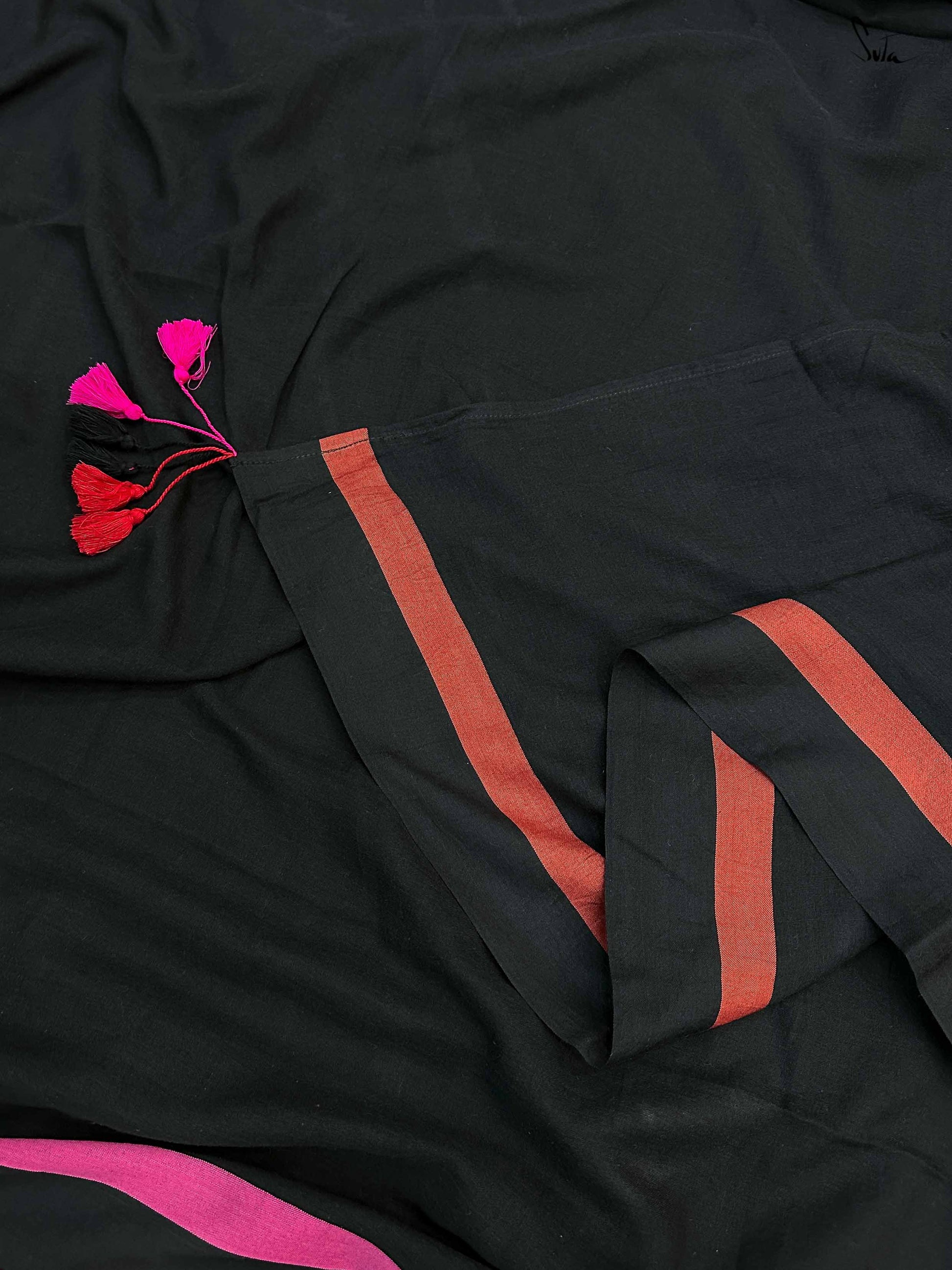 A fetching black mul weave with pretty pink and red borders. It will take to your shape, letting your individuality flourish. Fanning your curiosity for an adventure as free-spirited as YOU, the saree will swathe you in heavenly softness.