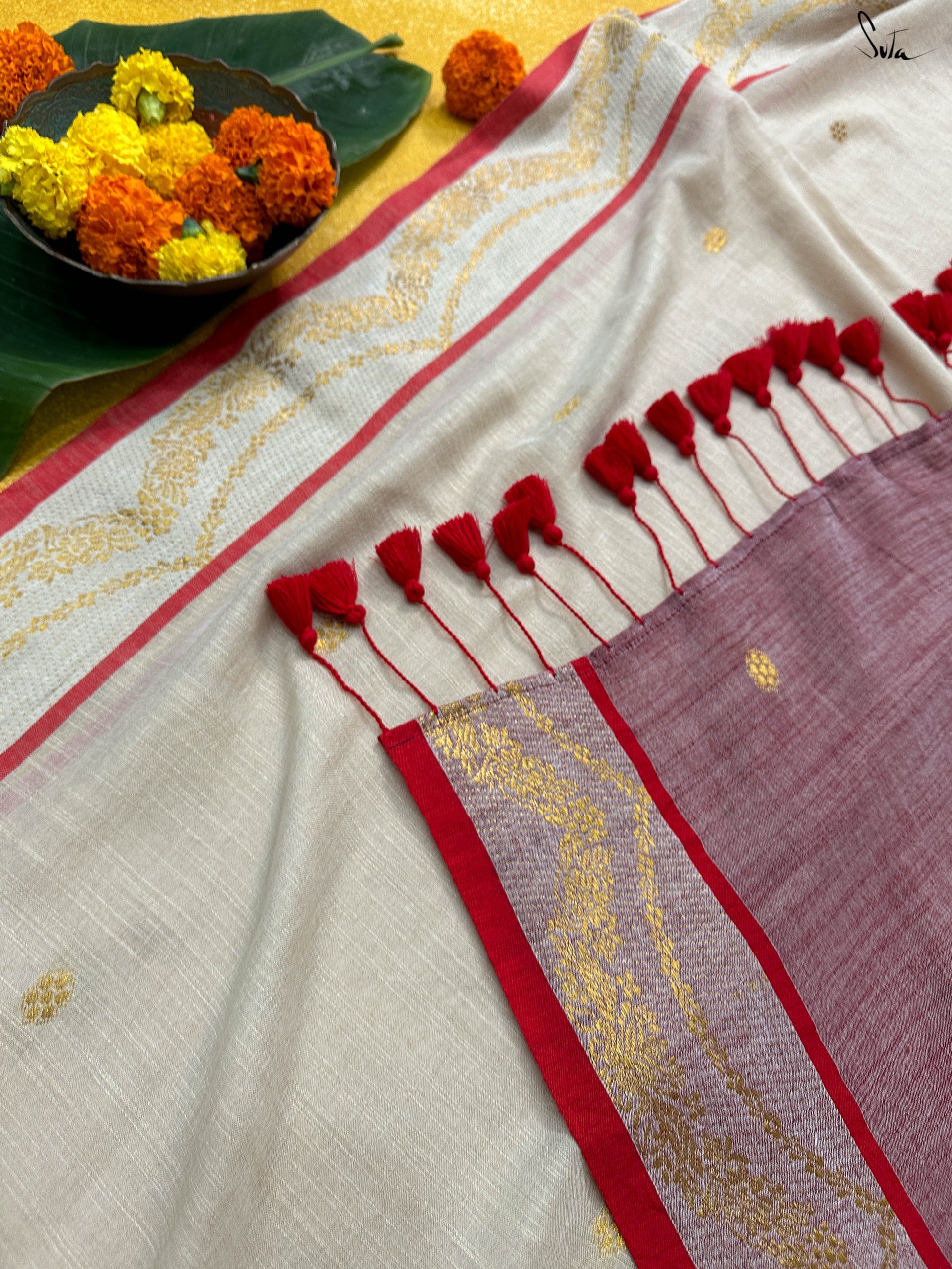 Kaanti is a masterpiece made of off-white cotton slub fabric, with its subtle textured weave featuring delicate gold jacquard buttis. This saree echoes tales of nostalgia as a signature festive saree. The rich hue of red pallu fills you with radiant confidence. This lightweight cotton slub drapes comfortably, allowing you to move with poise.