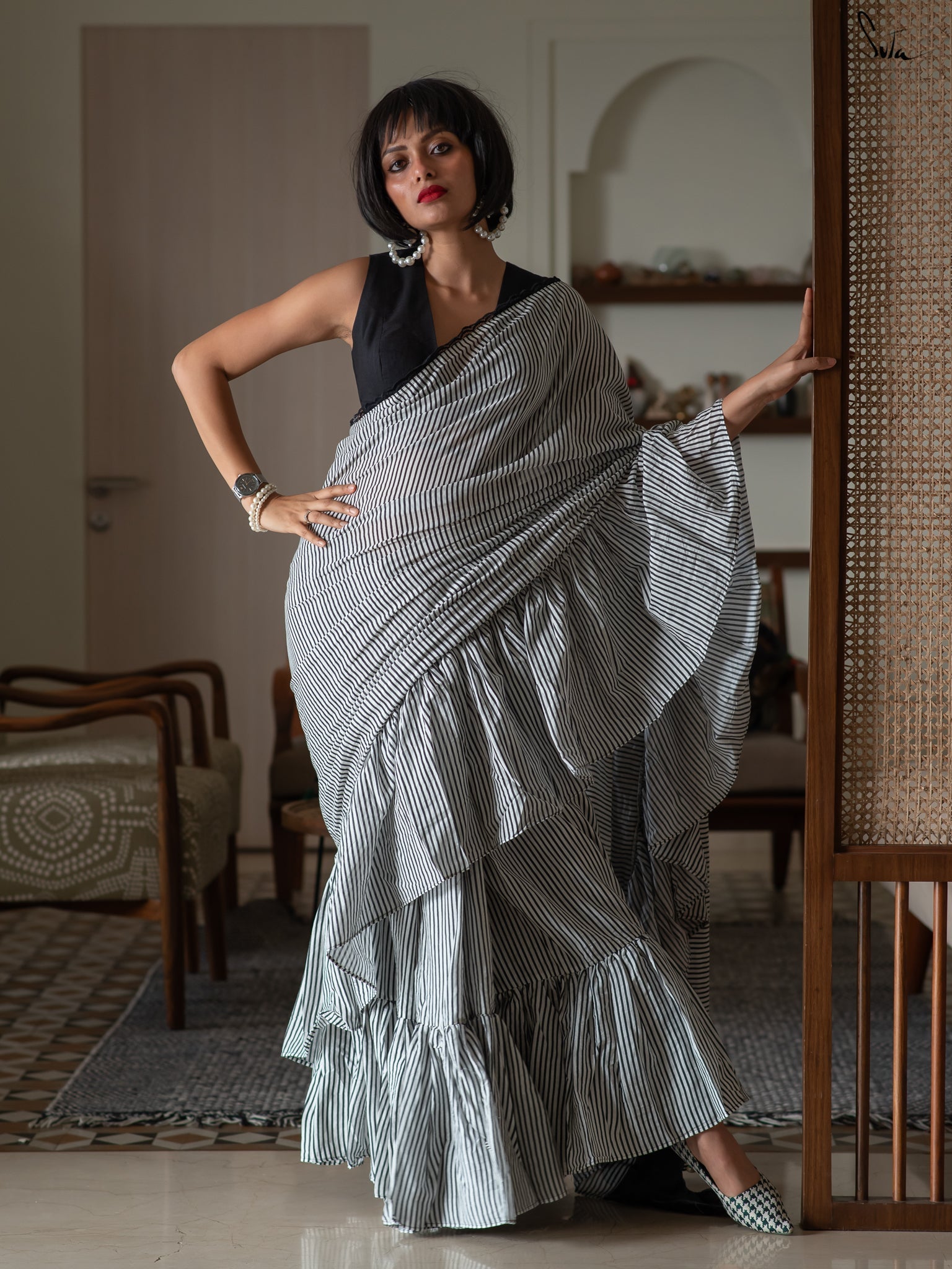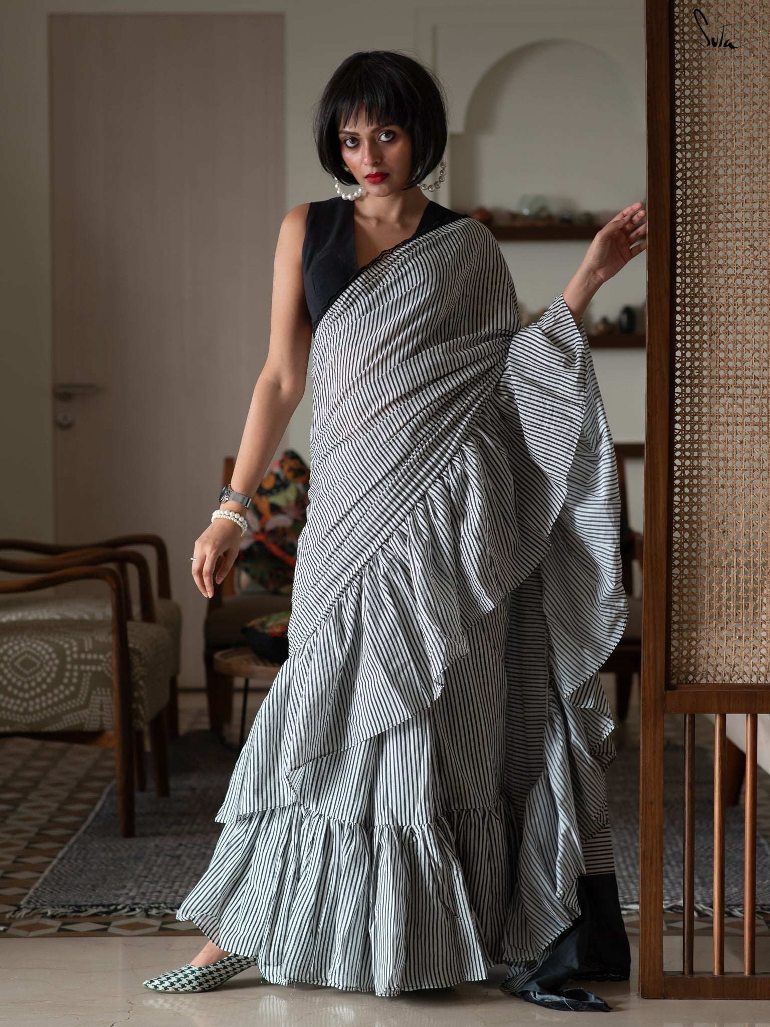 Blouse: The model is wearing size S of blouse from our in house collection. To view similar blouses