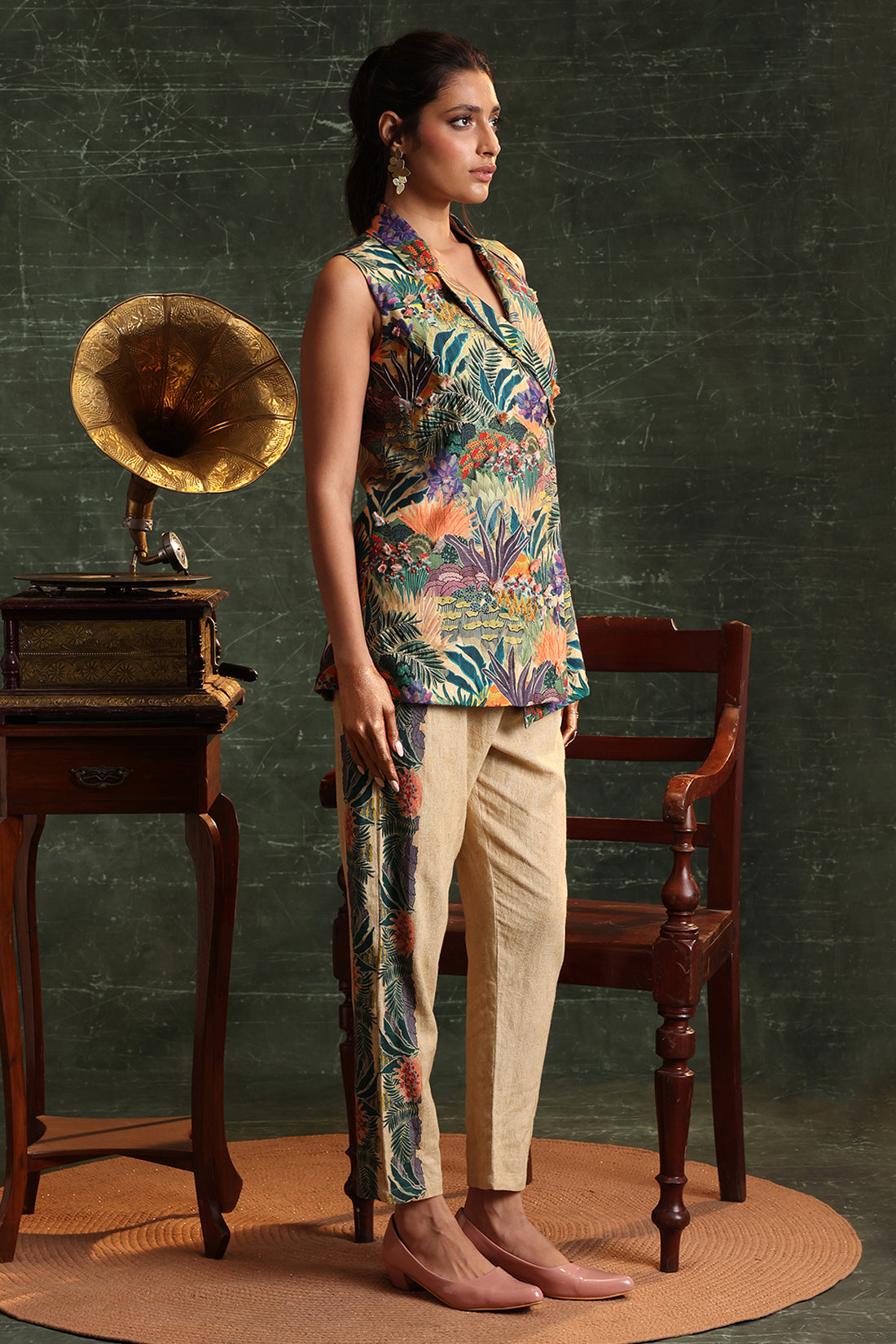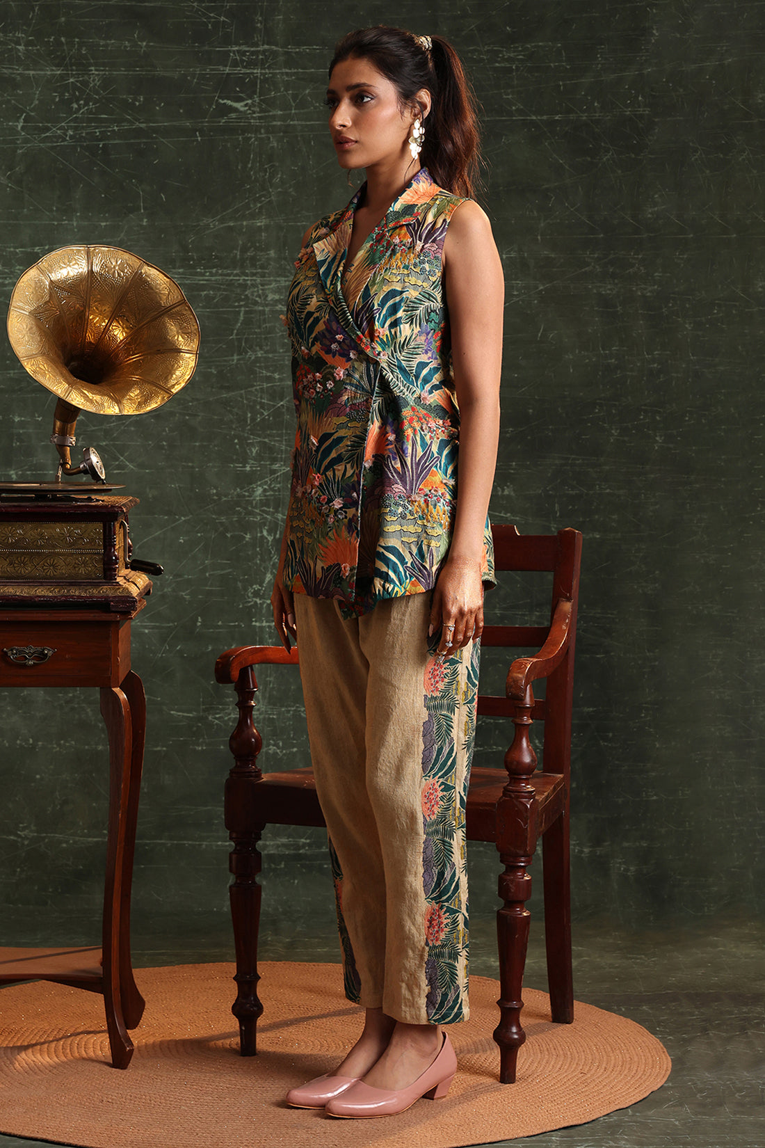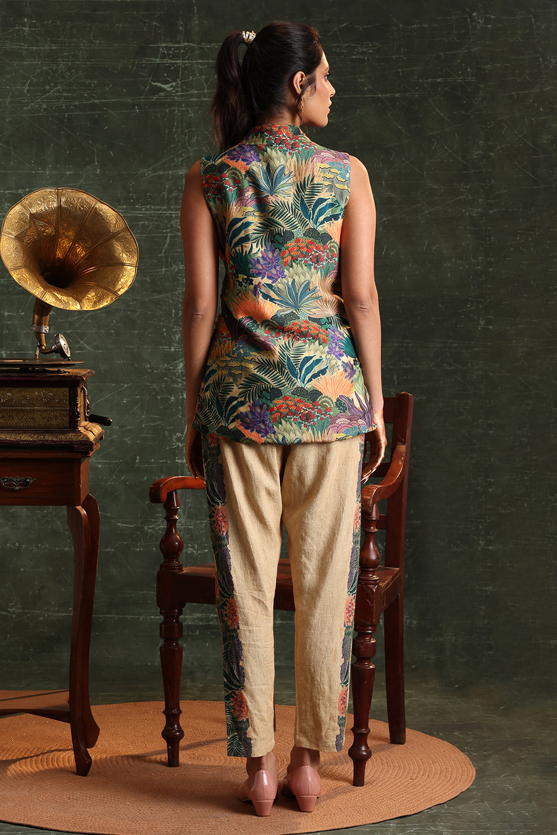 Multicolor Kaira Printed Sleeveless Blazer Top paired with Cotton Pants.
