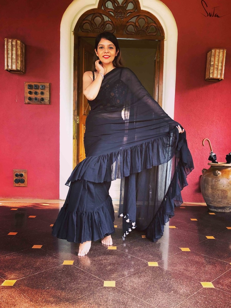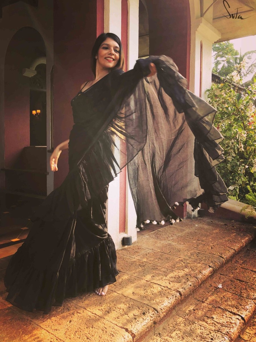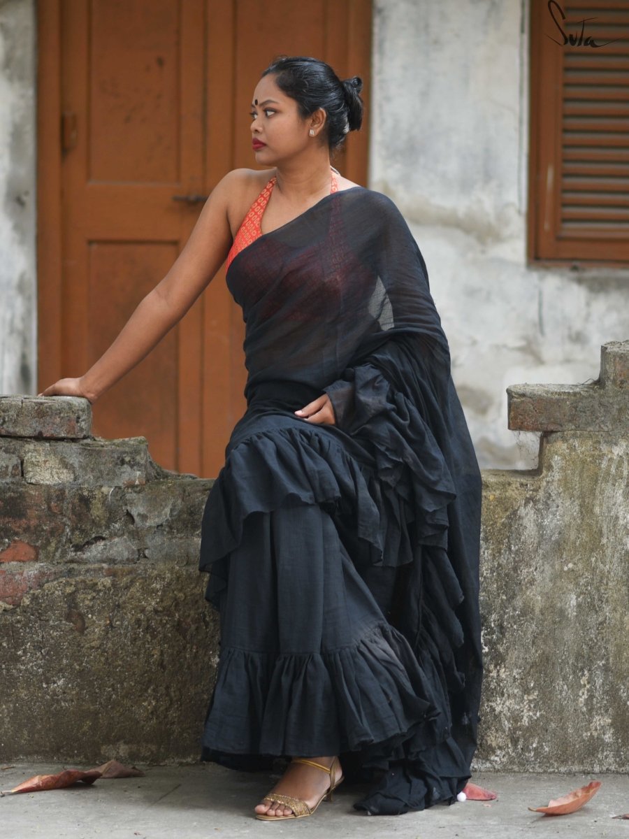 This dreamy black made-in-heaven mul saree with ruffles is as intense as it gets.