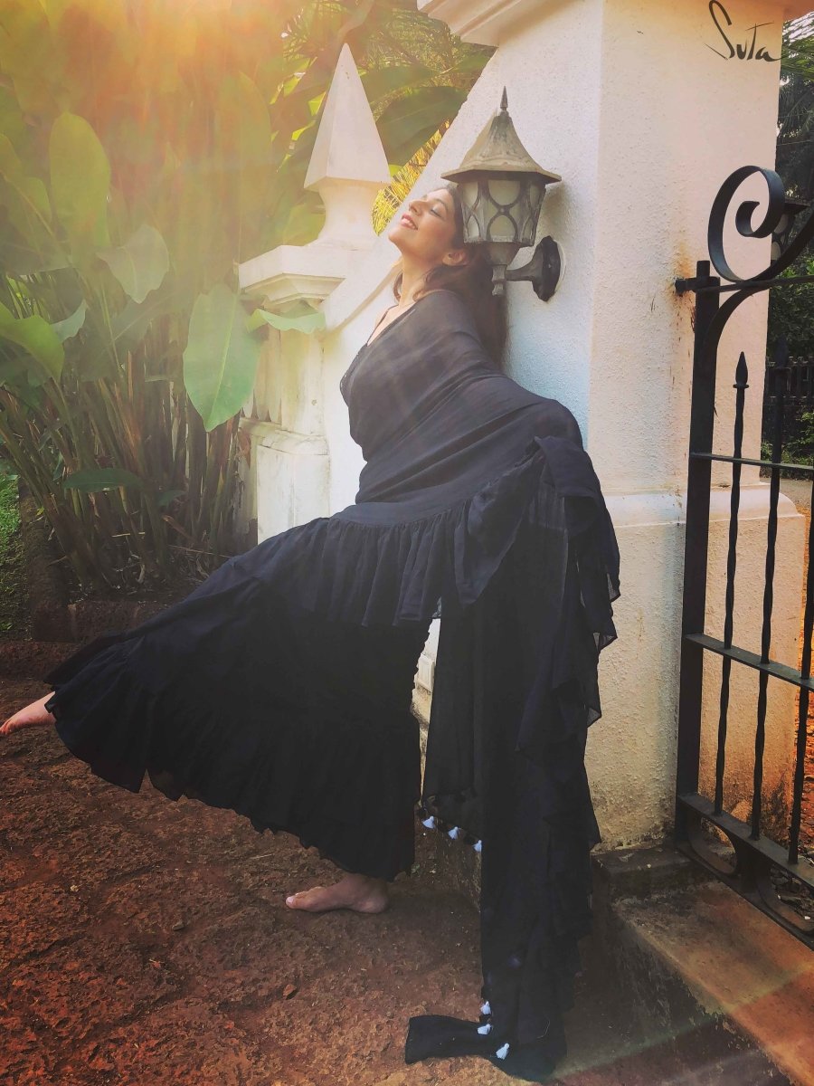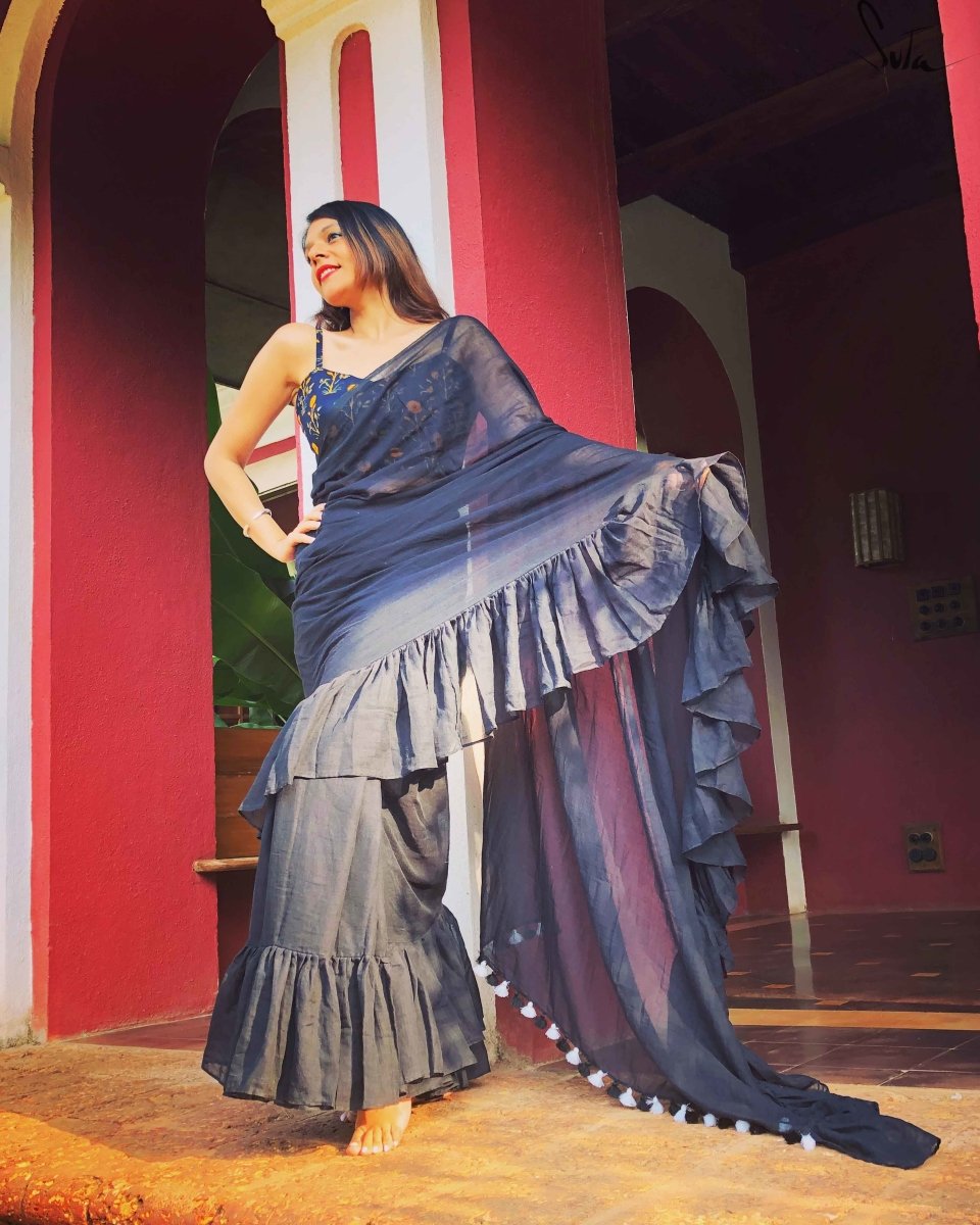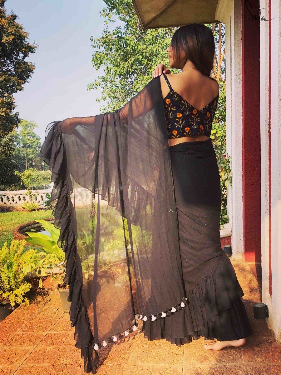 This dreamy black made-in-heaven mul saree with ruffles is as intense as it gets.