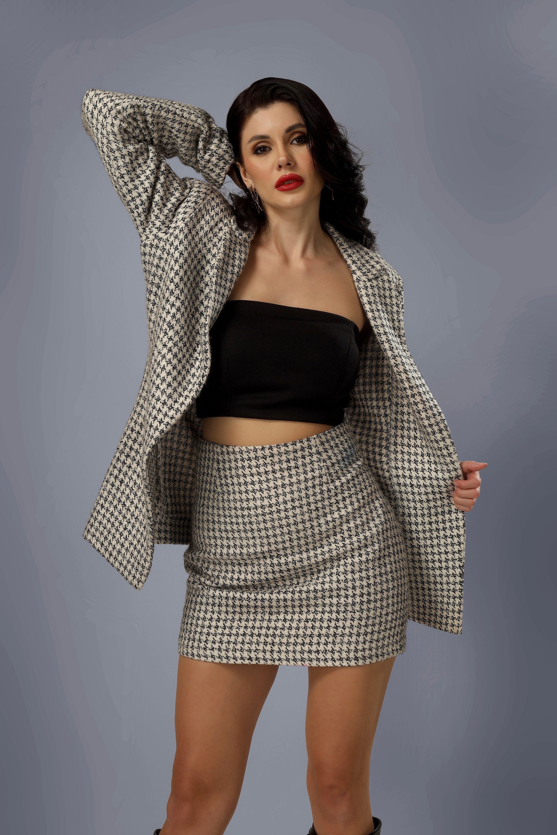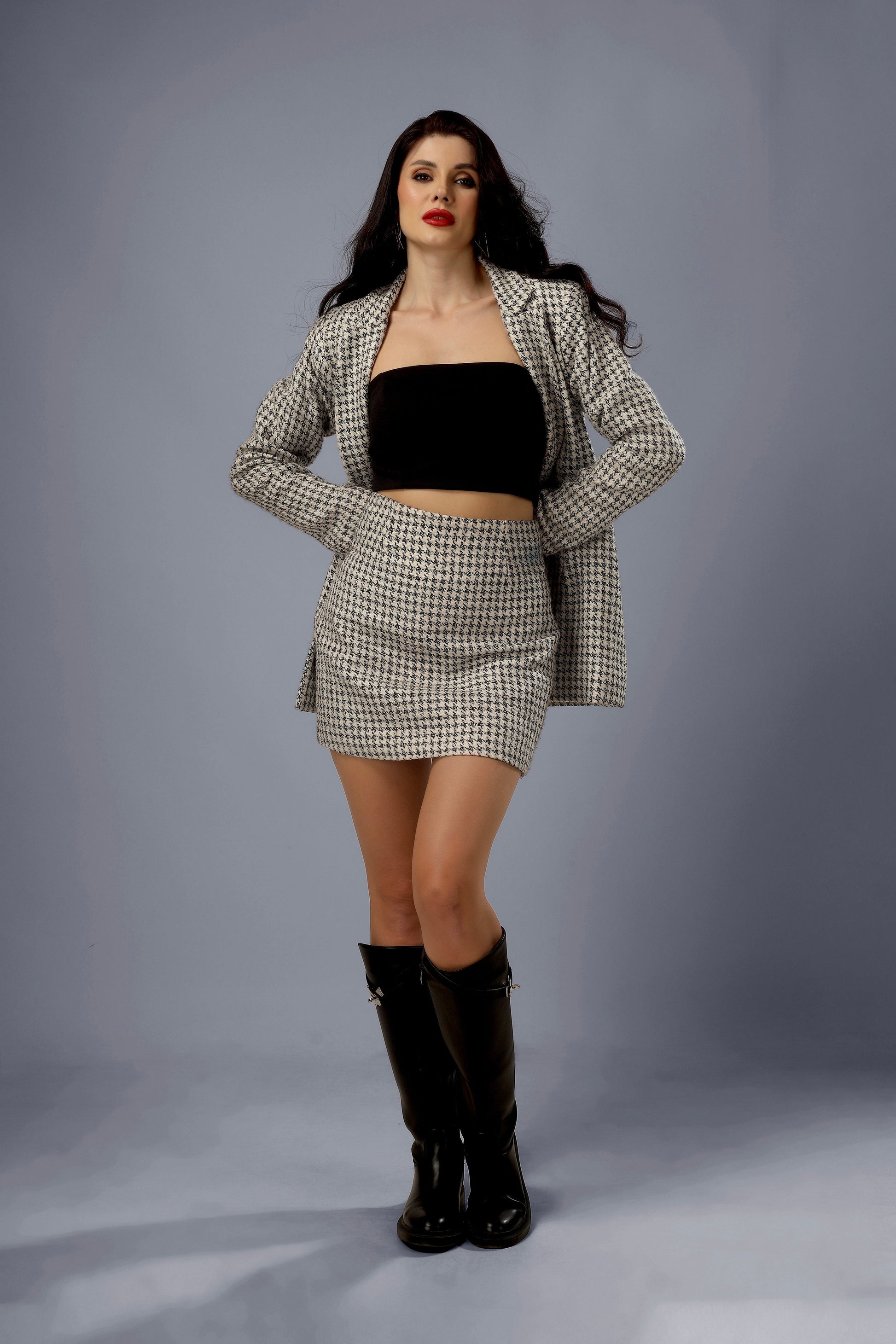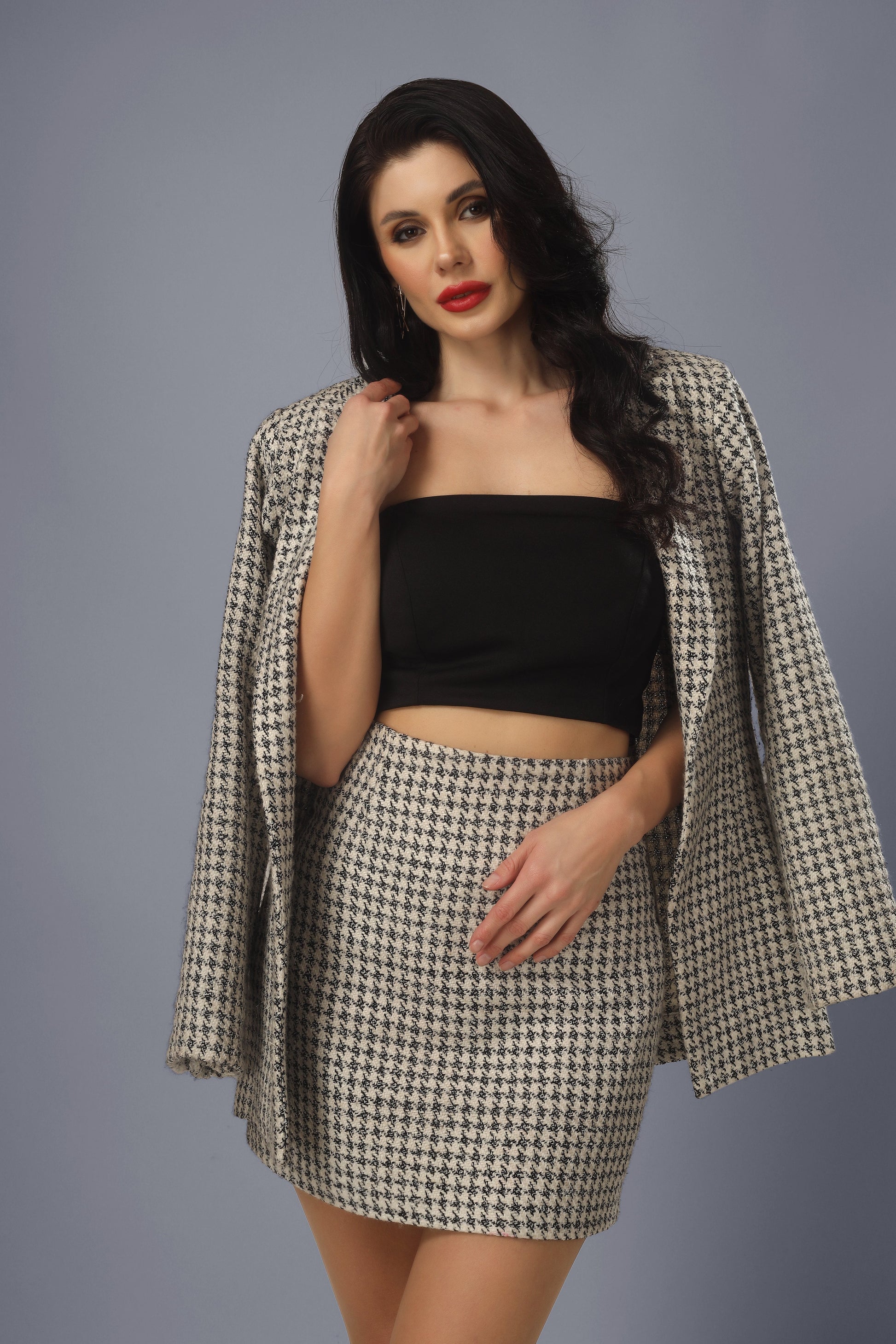 MEASUREMENT- Model is wearing small size. Bust 34inch, Waist 26inch, Hip 36inch, blazer length 30inch, skirt length 16inch, bustier length 14.5inch