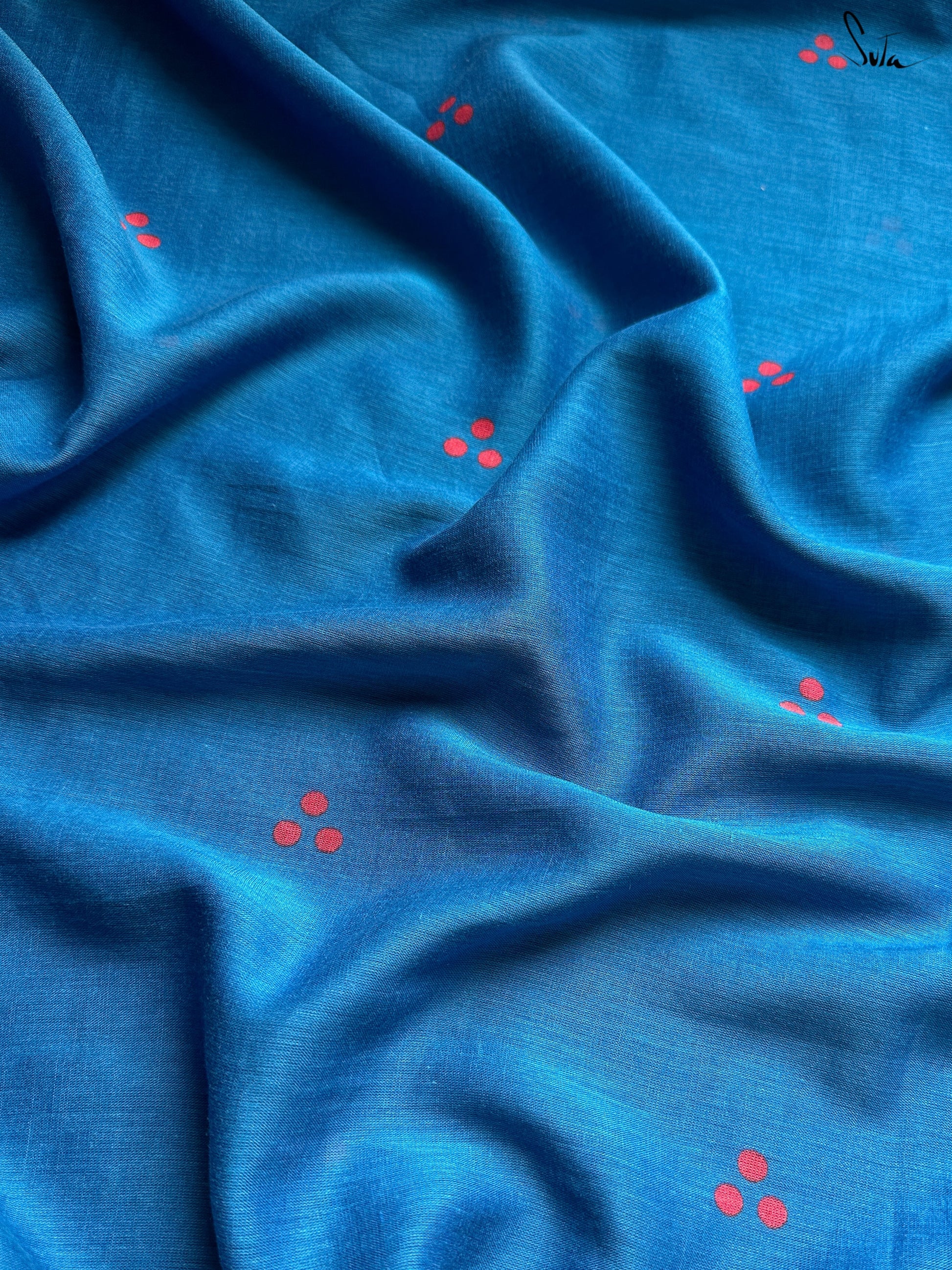 This stunning blue printed saree is made of Sutas signature made-in-heaven mul mul cotton. Also known as mul mul in West Bengal, mul cotton is a buttery soft fabric and has a delicate beauty. Its weave is very fine and this lends a very fluid texture to the fabric, which makes draping it a breeze. It truly is like a hug that wraps you in its love.