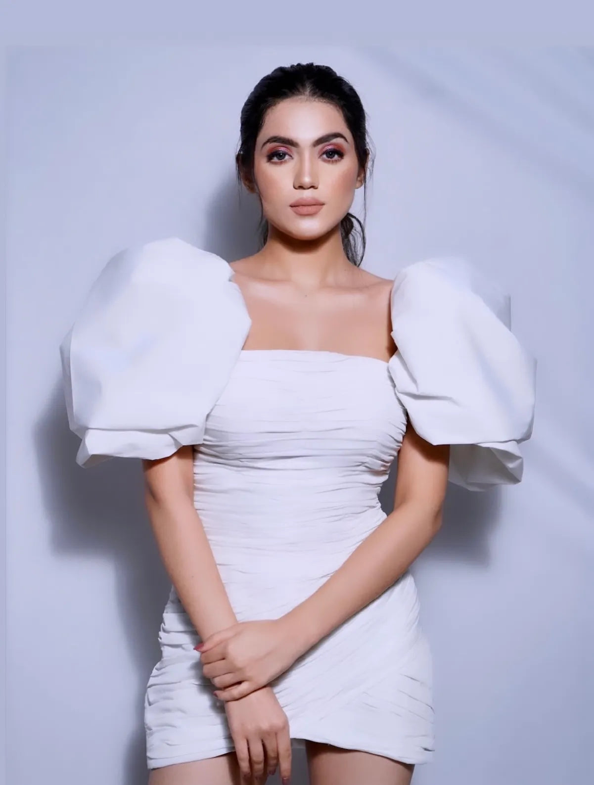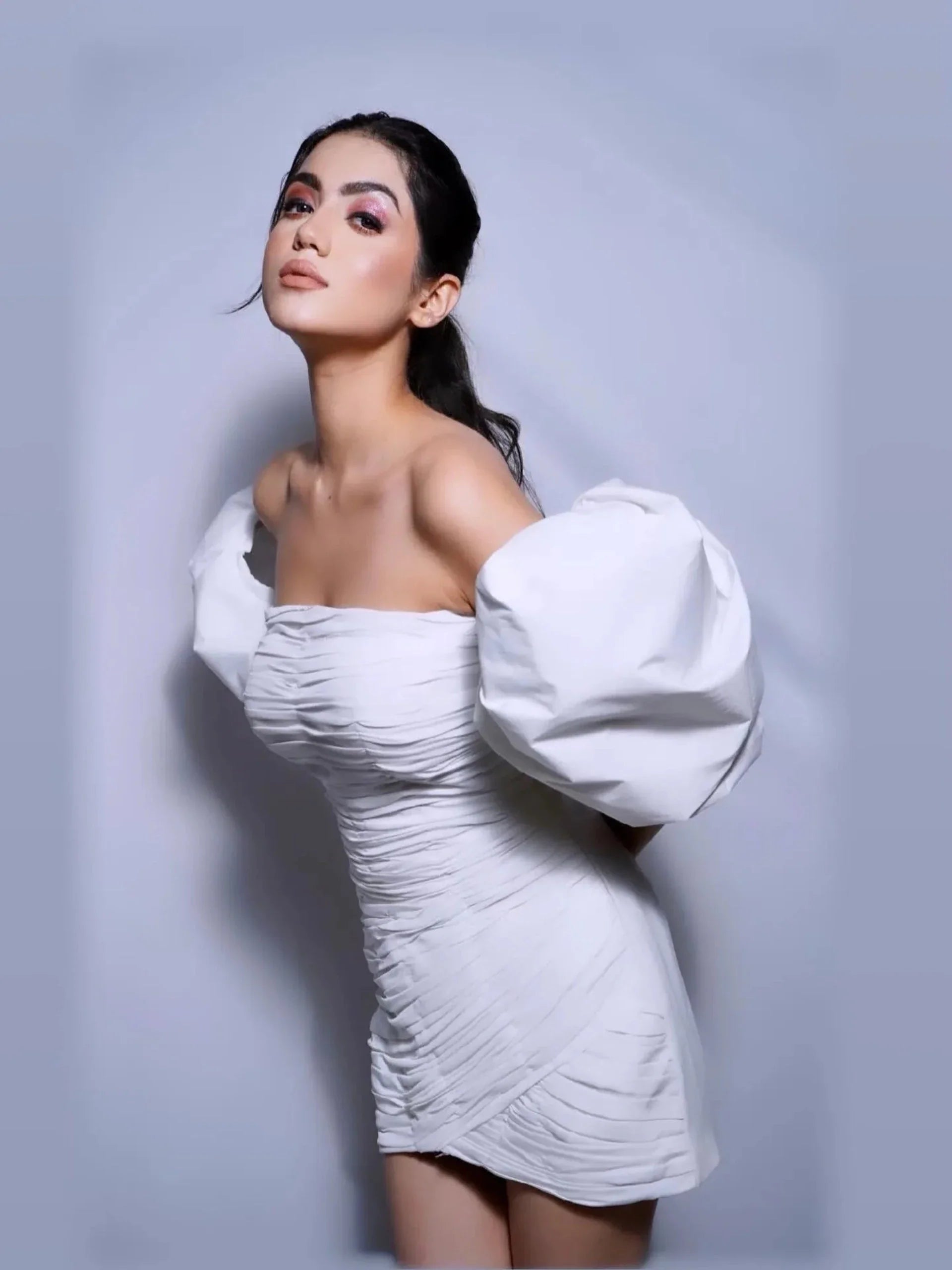 White off-shoulder dress with statement sleeves. Heavy Ruching on the front. Padded.