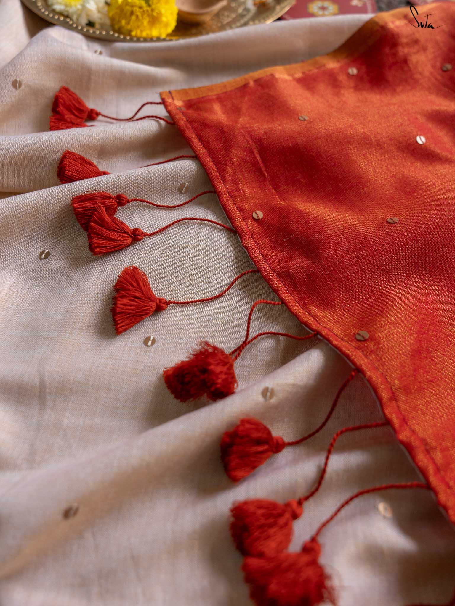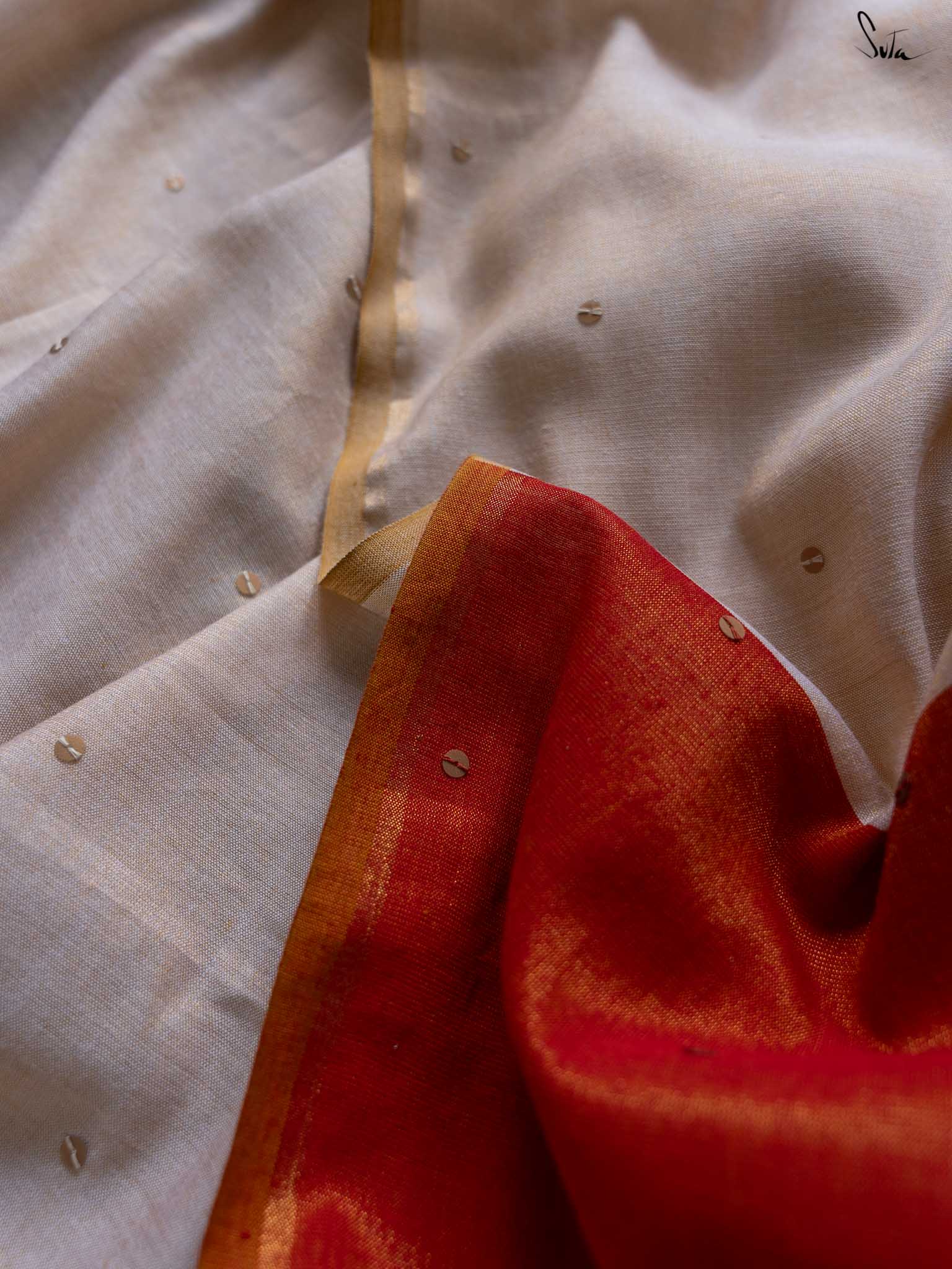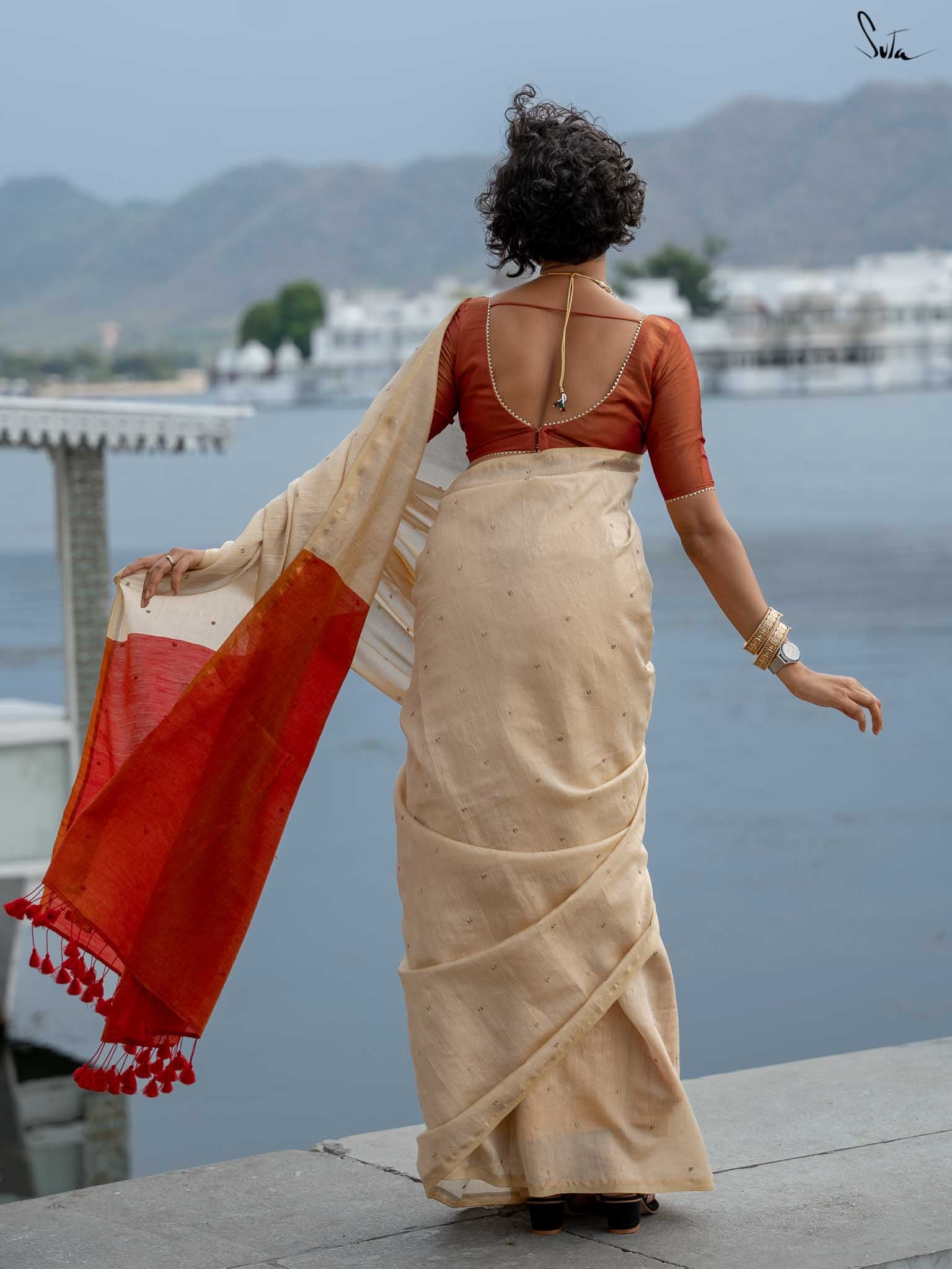 Keya, named after a divine flower celebrates purity and serenity. Celebrate every moment with this off-white saree from Suta’s Taara collection, crafted from rich acrylic cotton with zari. This saree is hand-embellished with chumki all over and a gold zari border. The saree also comes with an attached rust-orange blouse piece, which can be easily styled into any design or pattern you prefer, making it a versatile addition to your wardrobe. The masterpiece offers a contrast rust-orange pallu adding warmth, making Keya a celebration of understated elegance, reminding you that your light can shine the brightest even in simplicity.