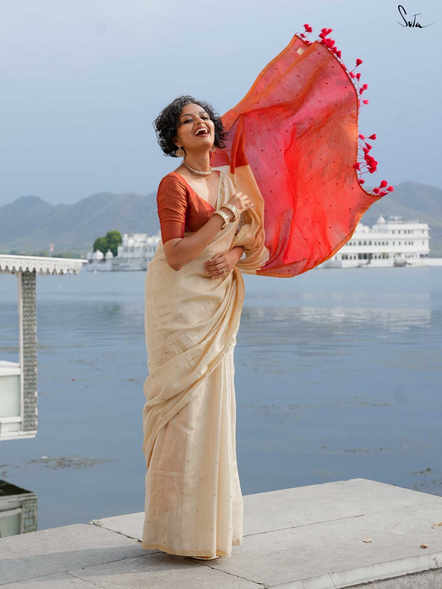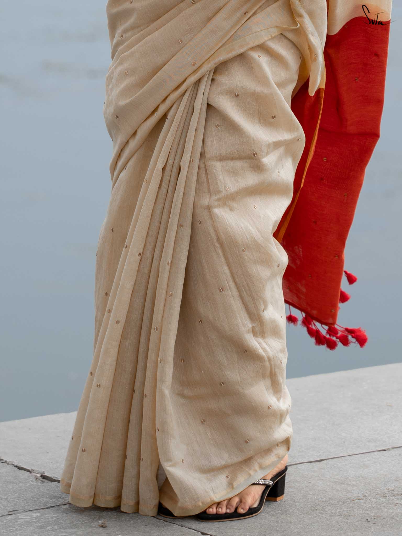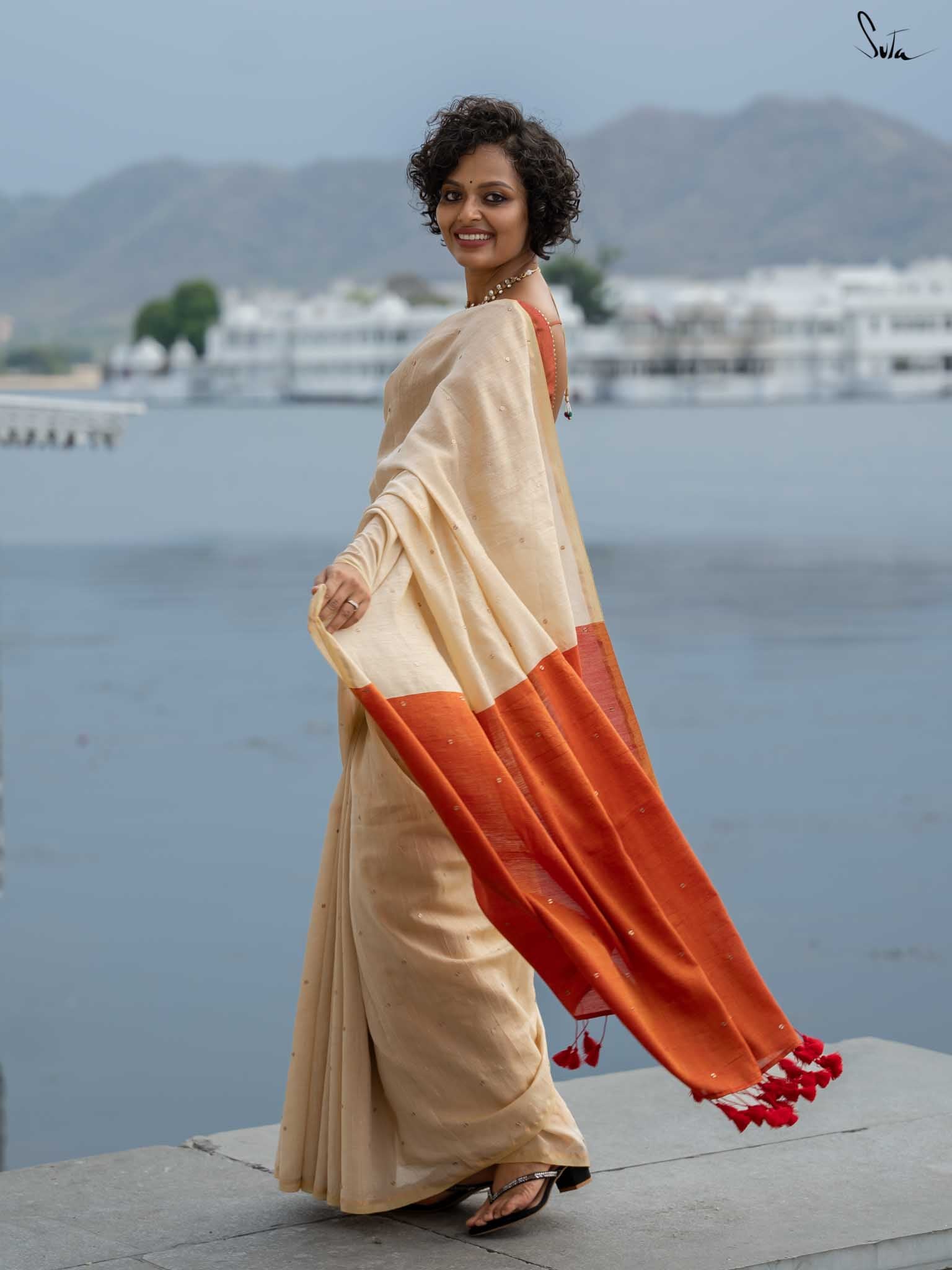 Keya, named after a divine flower celebrates purity and serenity. Celebrate every moment with this off-white saree from Suta’s Taara collection, crafted from rich acrylic cotton with zari. This saree is hand-embellished with chumki all over and a gold zari border. The saree also comes with an attached rust-orange blouse piece, which can be easily styled into any design or pattern you prefer, making it a versatile addition to your wardrobe. The masterpiece offers a contrast rust-orange pallu adding warmth, making Keya a celebration of understated elegance, reminding you that your light can shine the brightest even in simplicity.