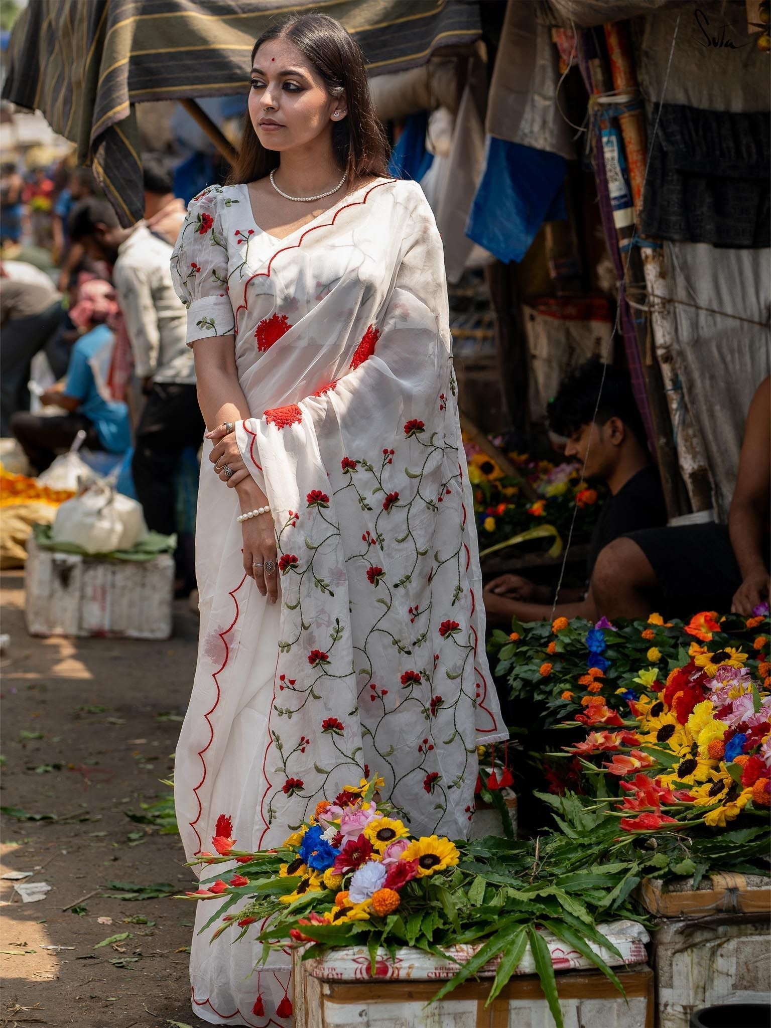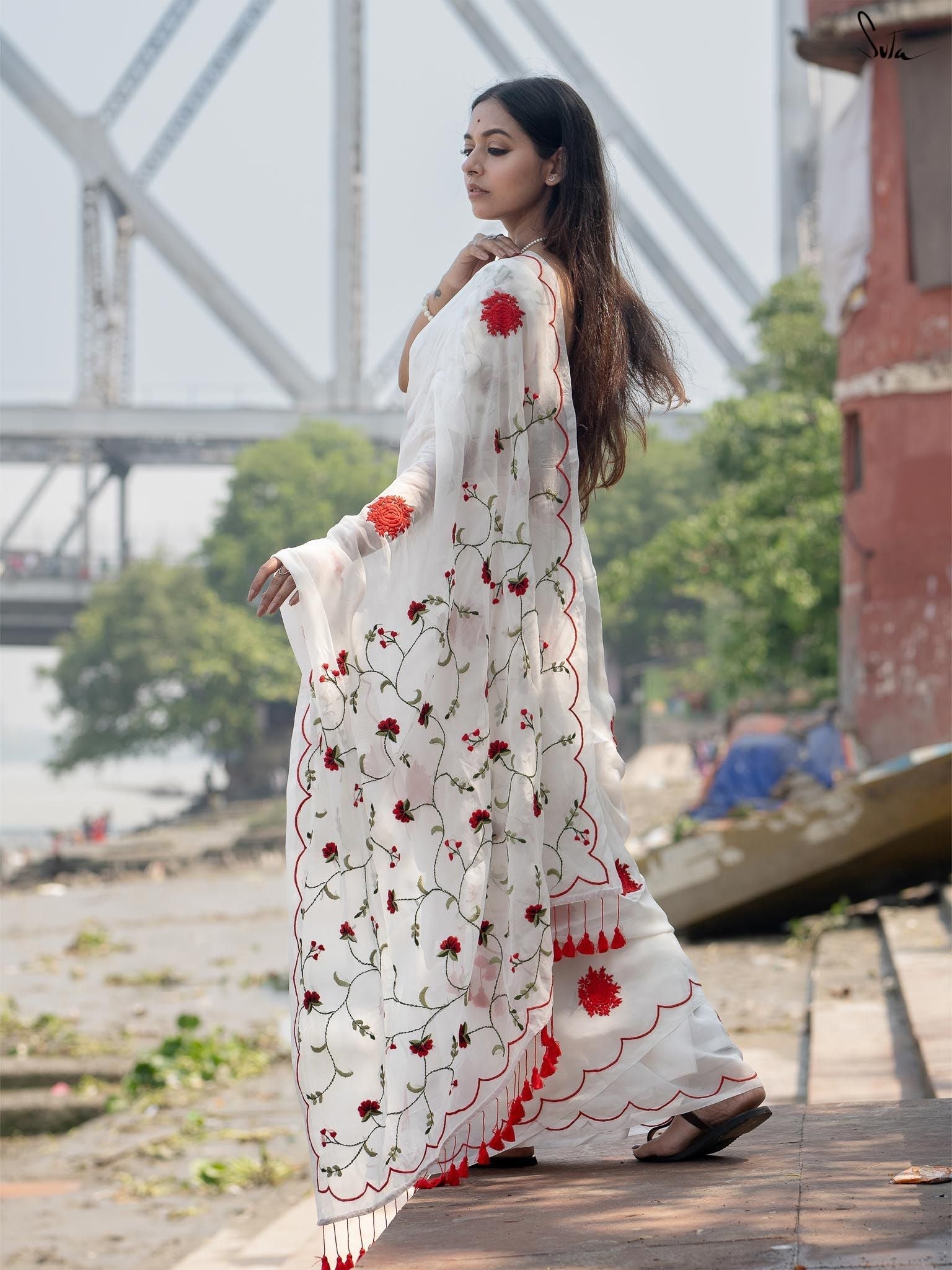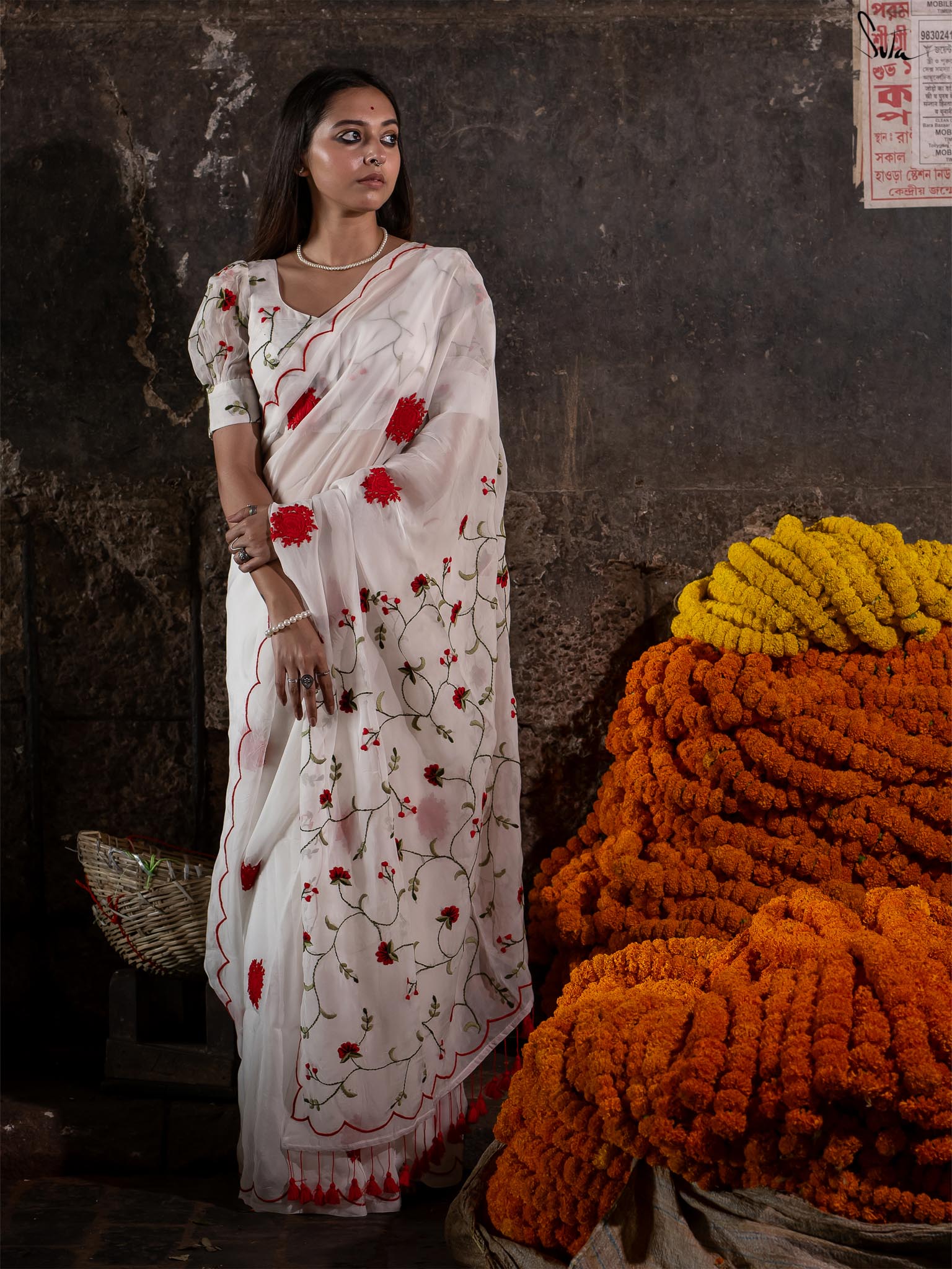 The Khwaab stuns with hand-embroidered 3D red roses inspired by Persian designs, on luxuriously soft Viscose Organza.Delicate scalloped edges and playful tassels add a touch of femininity. This breathable saree drapes beautifully and stays comfortable, making it perfect for any occasion.