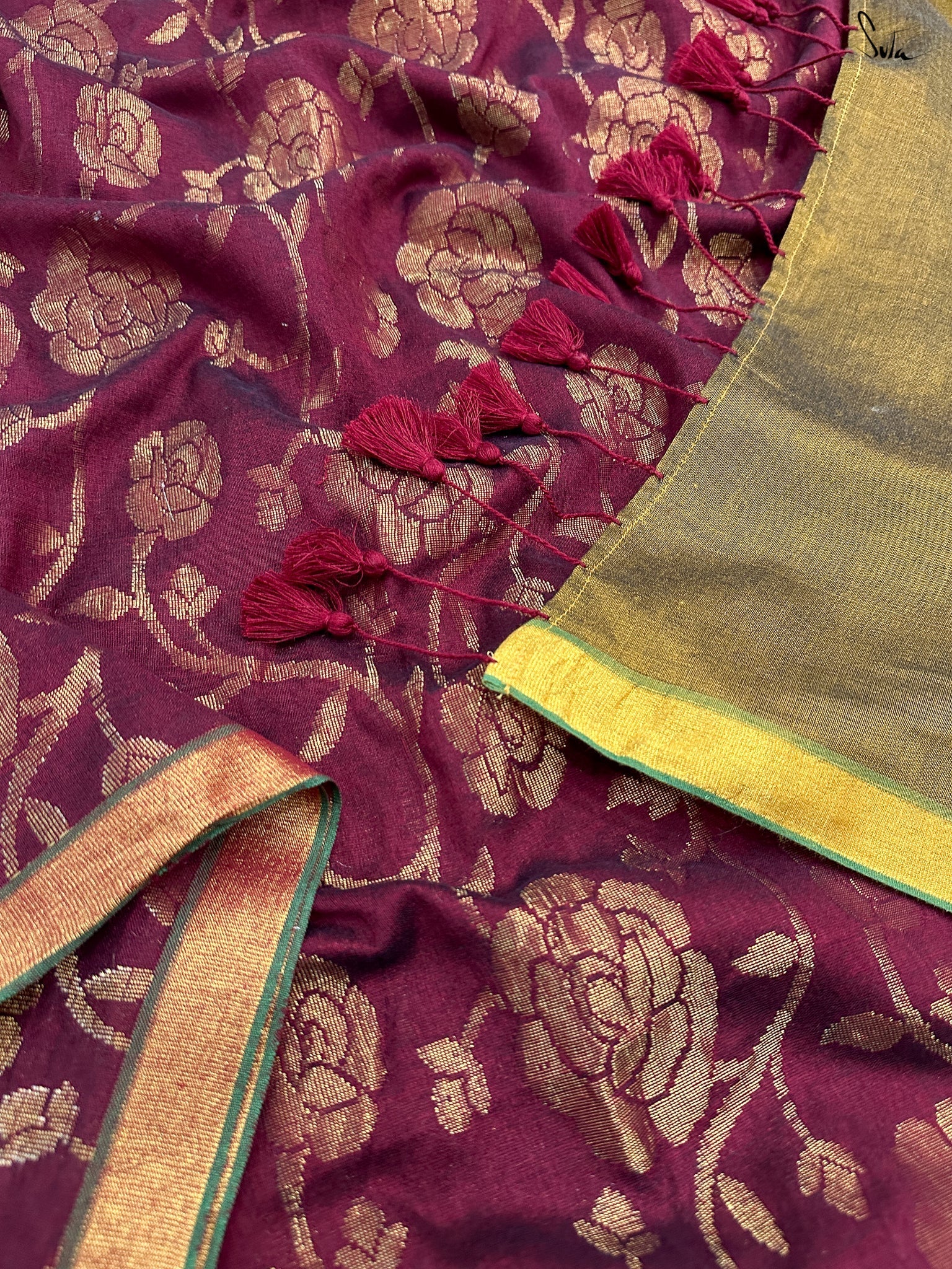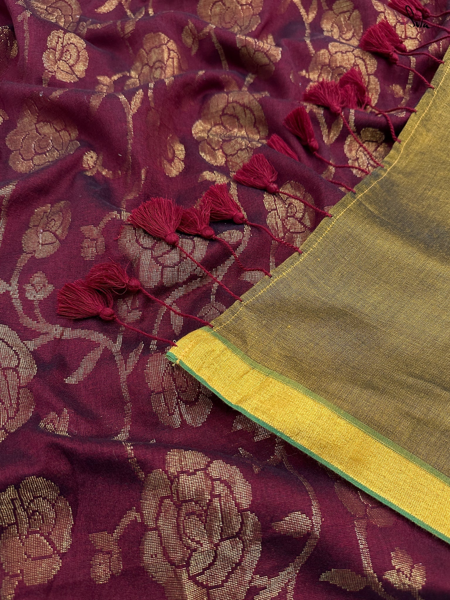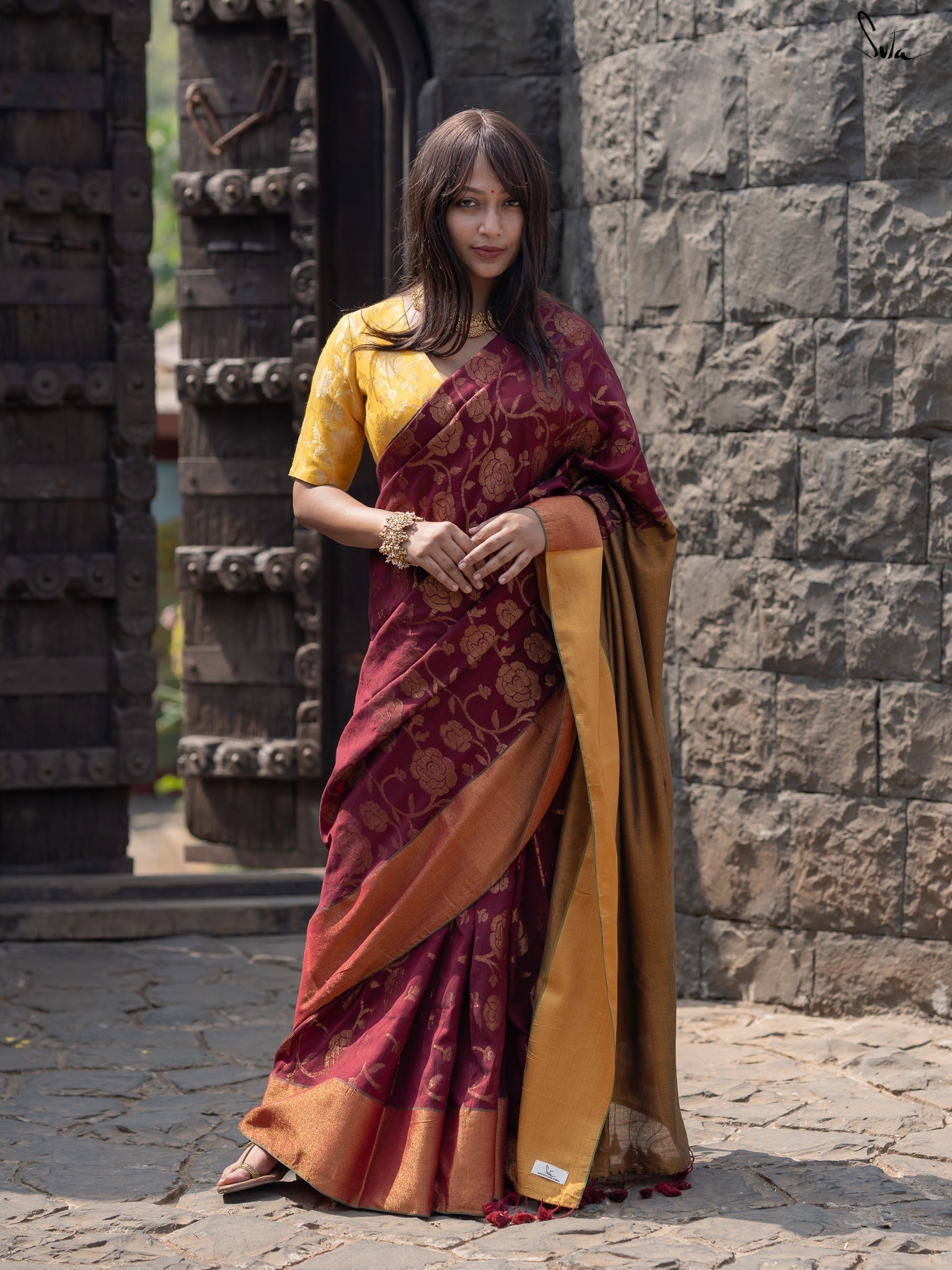 Shine as bright as the golden zari blooms on this timeless maroon and mustard saree. The breathable fabric is meant to float on your body.