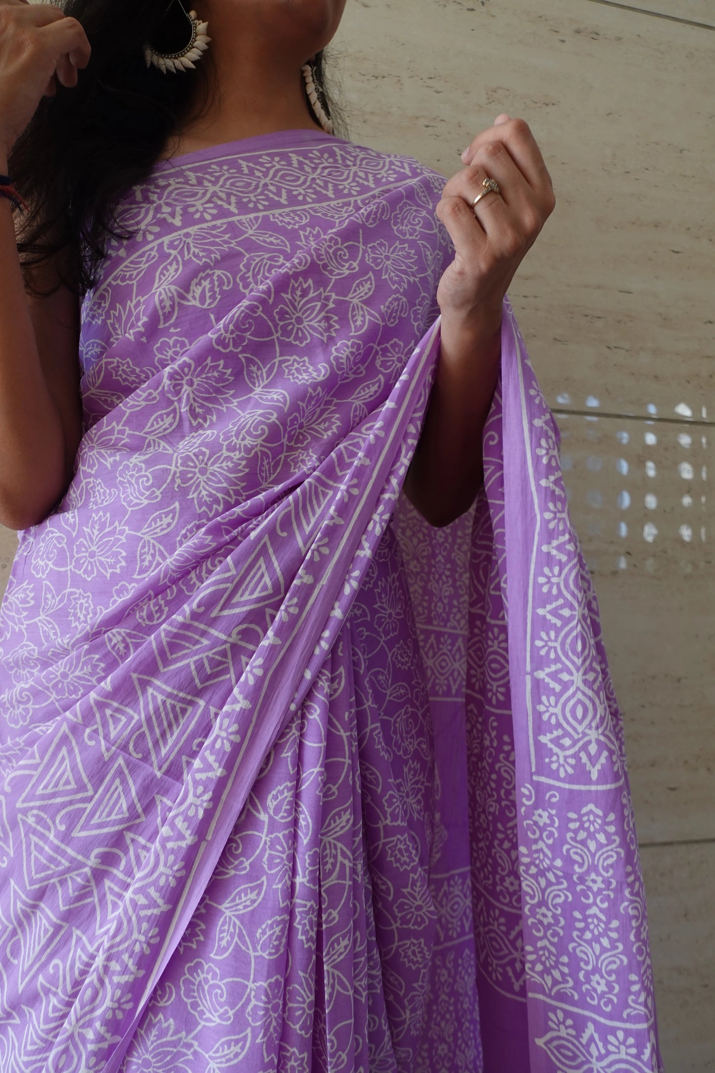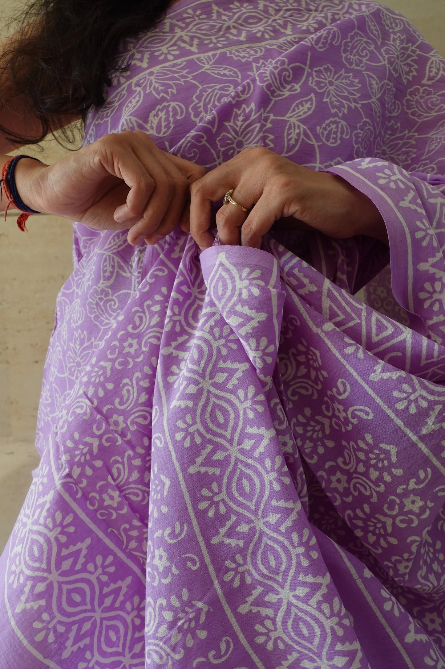 Lavender Love Letter - Handblock Print Natural Dyed - Mulmul Cotton Saree