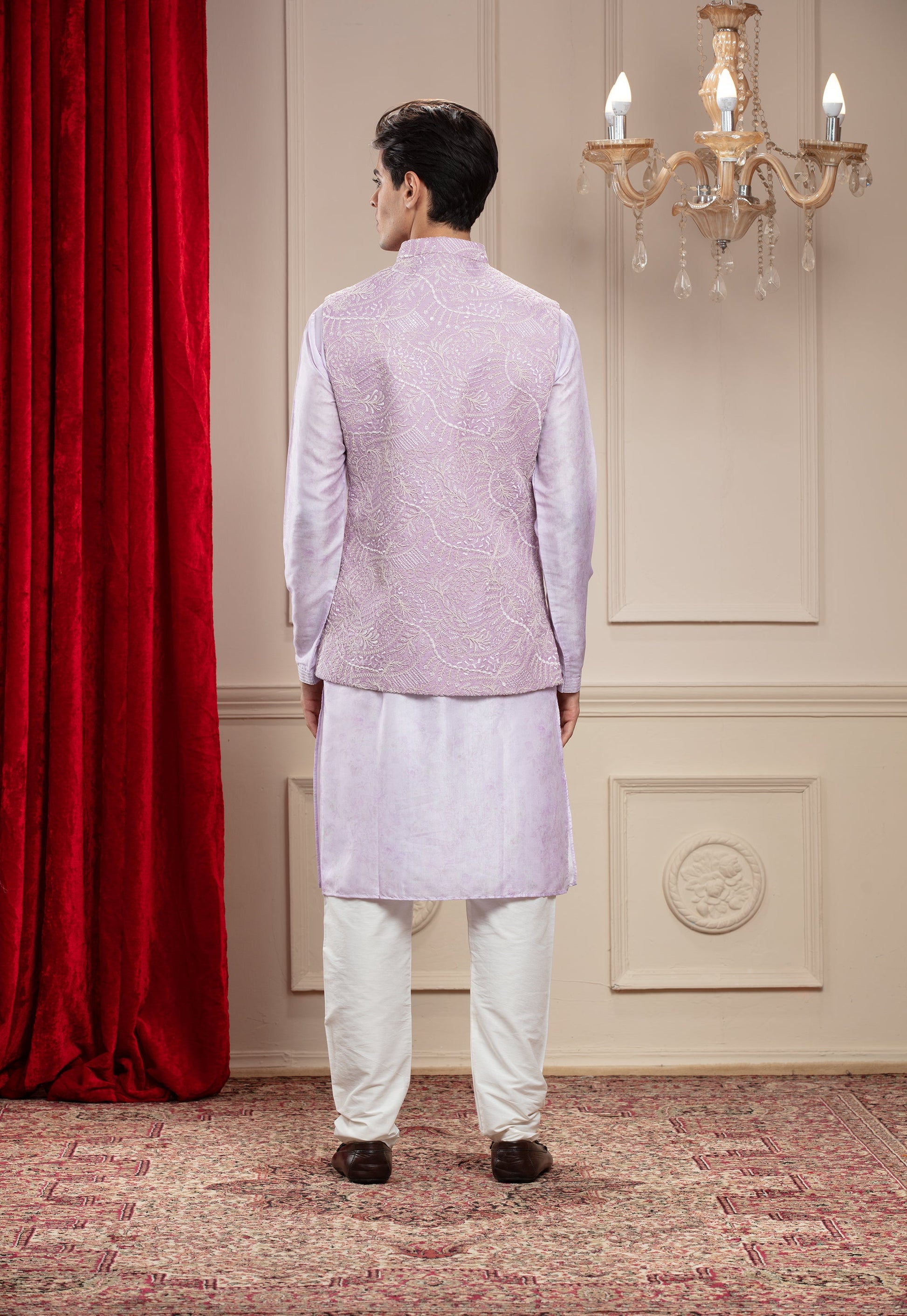 Lavender Mauve Lucknowi kurta Jacket Set with cutdana work and brooch