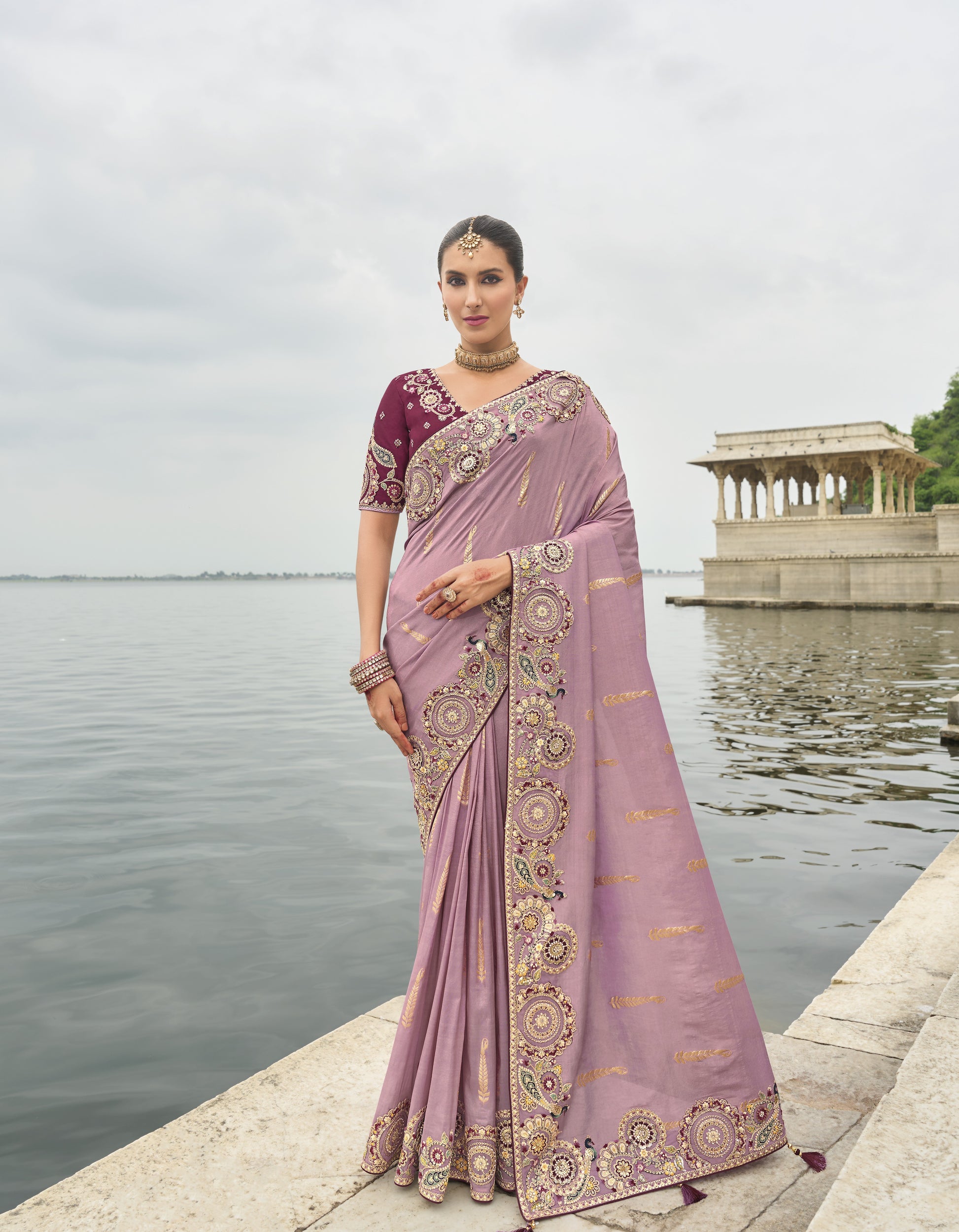 Lavender Viscose Silk With Embroidery Butti Work Border Saree
