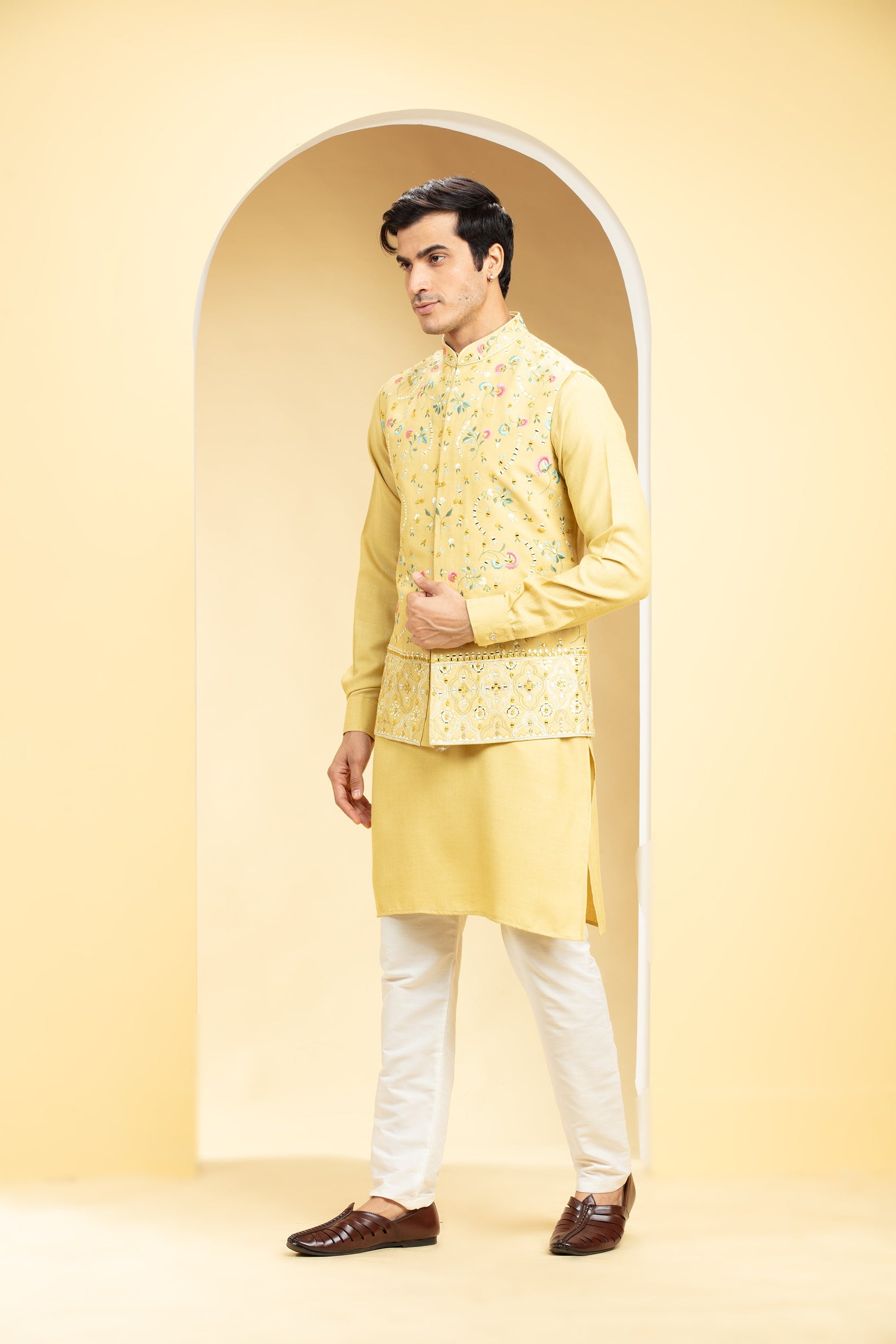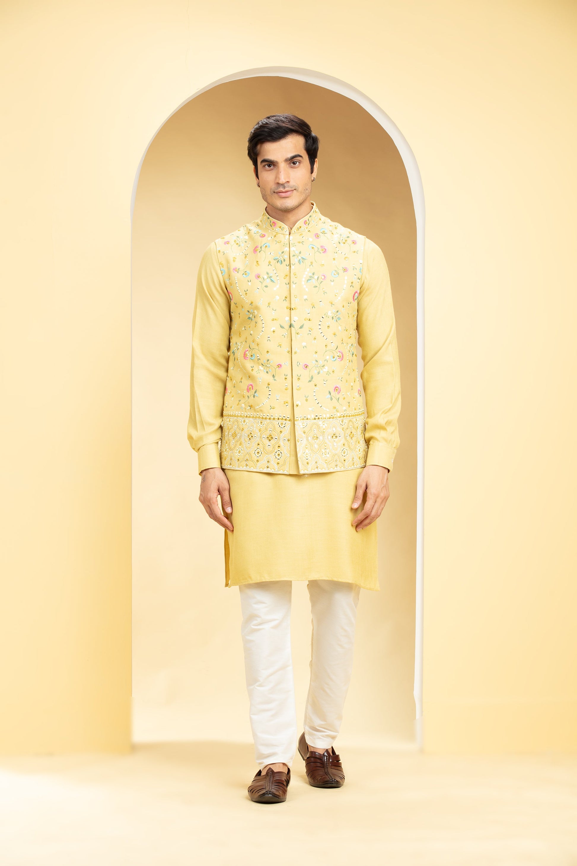 Light Mustard Yellow Jacket kurta set with floral and mirror embroidery