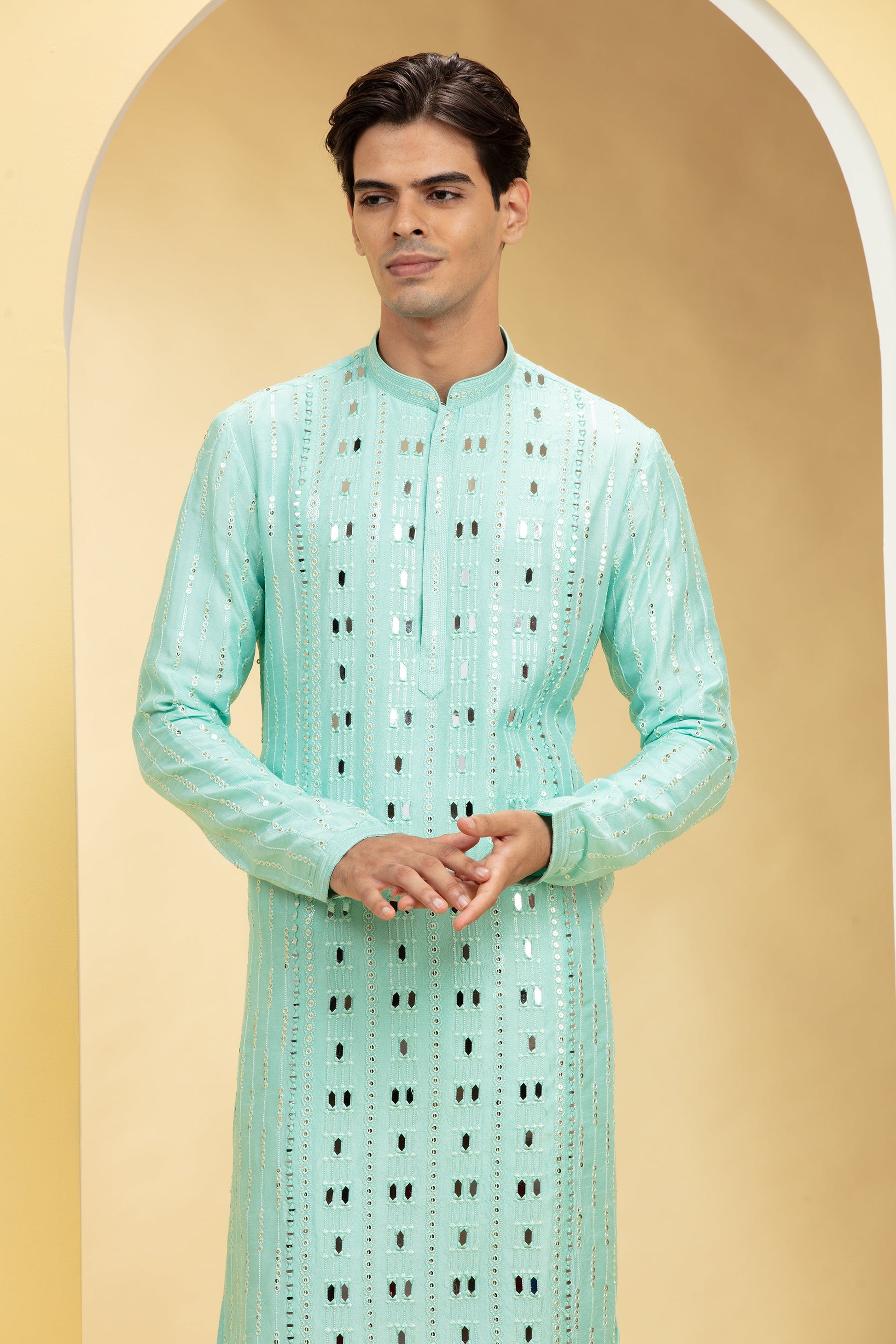 Light turquoise Lucknowi kurta pajama Set with Mirror and Thread work