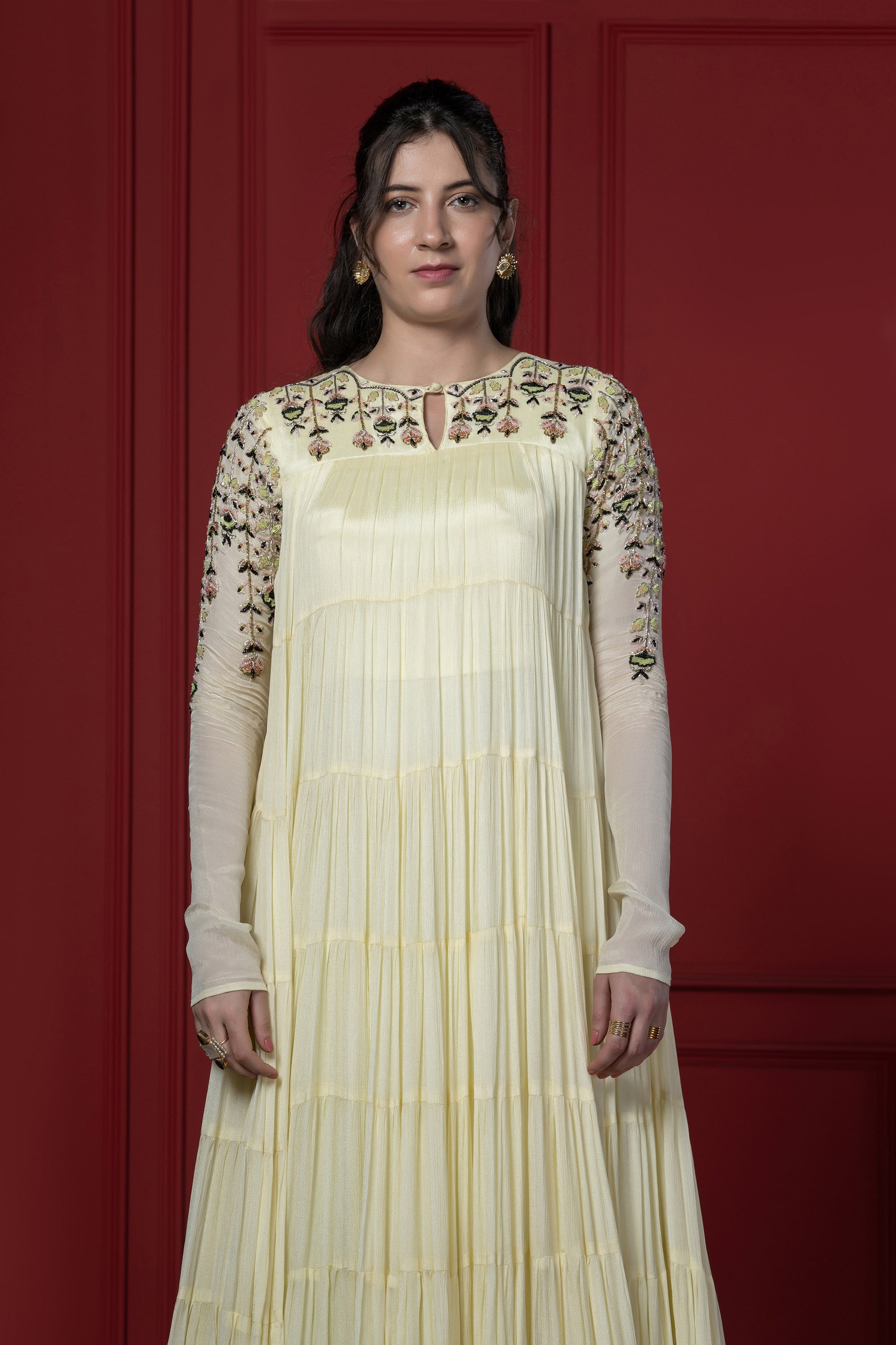 Lemon Yellow embroidered multi-layered gown with handwork detail around sleeve & shoulder. The silhouette is graceful & rich,