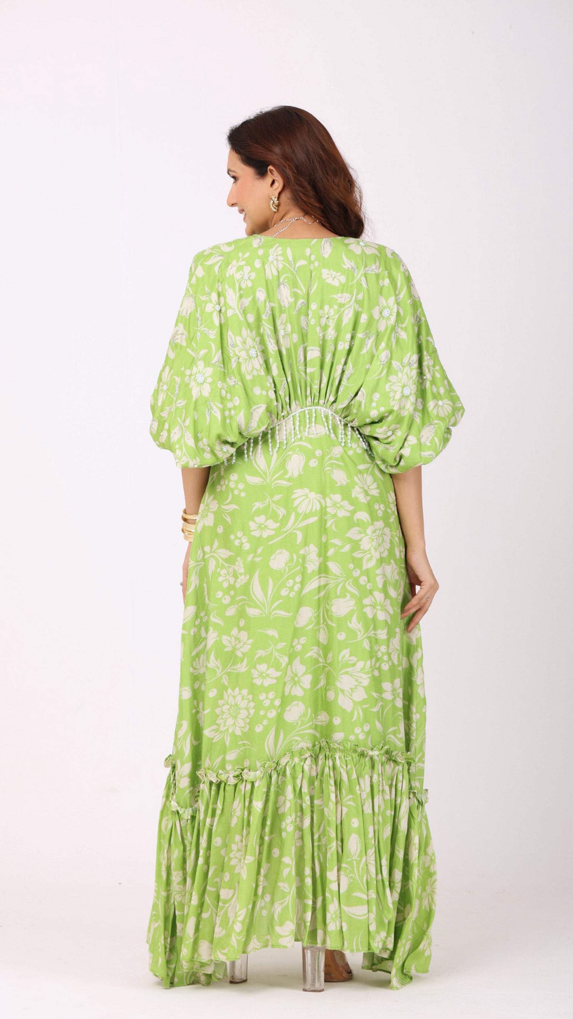 Love bird green gathered calf length dress with pearl buttons