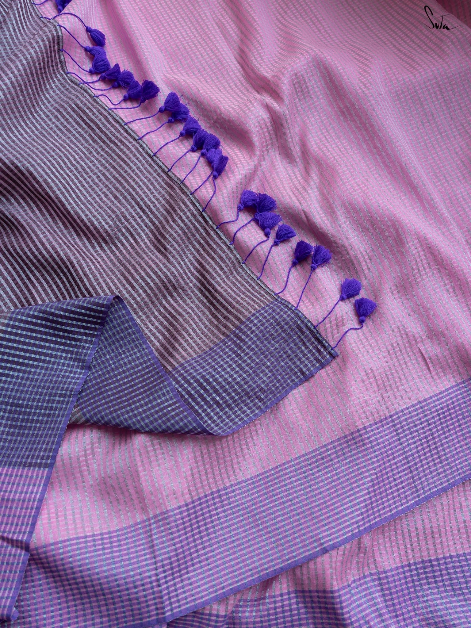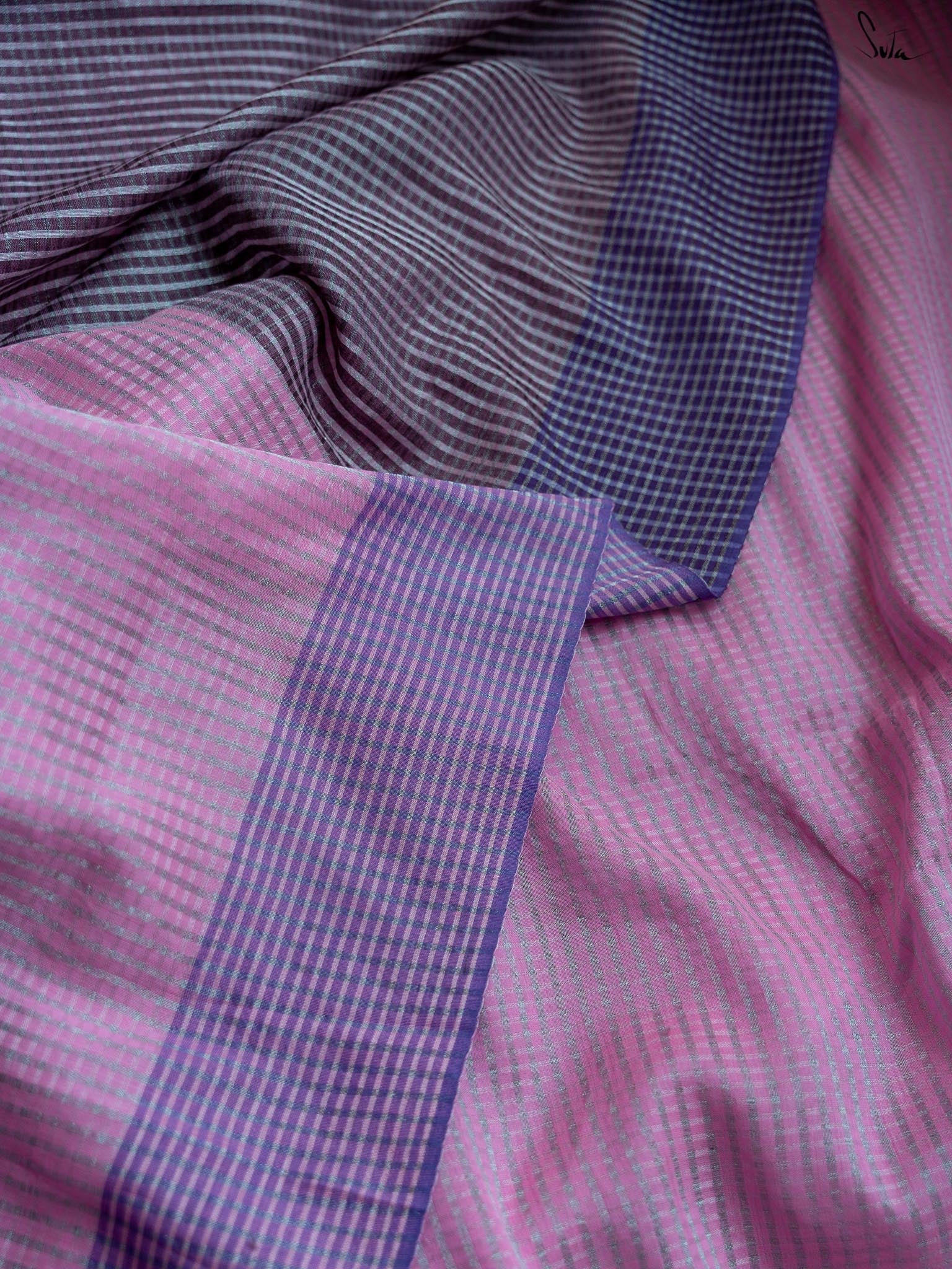 Woven from heavenly mul cotton, the 'Maadhur Sapna' saree is truly a dream waiting to be explored! Consisting of a beautiful light pink base alongside contrasting border and pallu, the saree has zari lines running in both warp and weft throughout it. Pair it up with Suta's 'Kshamya' blouse and transform yourself into a poet's dream!