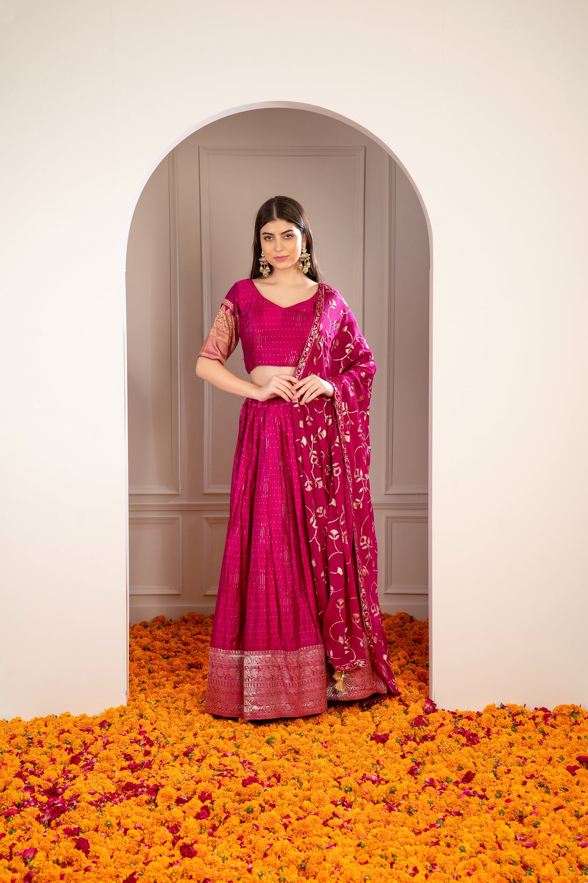 Magenta Pink Satin Silk Sequinned Lehenga Set.