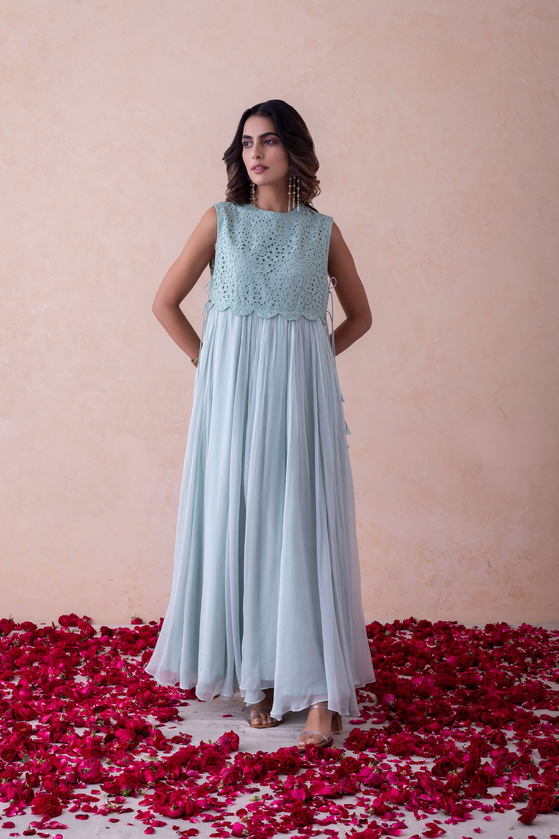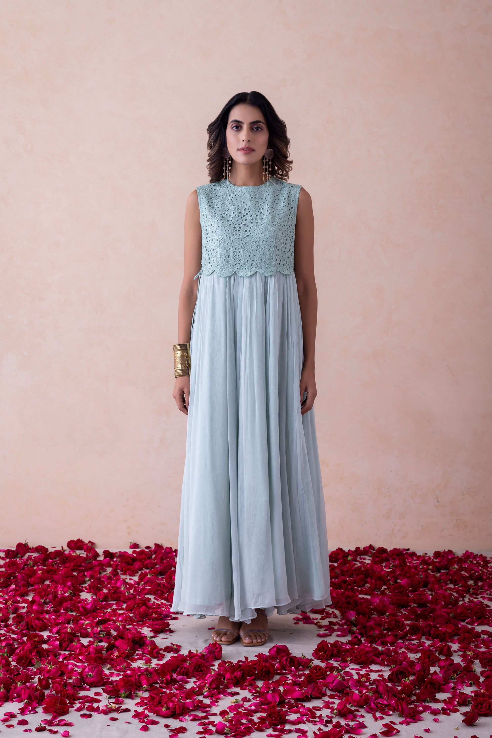 Sleeveless Organza and Chinnon Gown with Schiffli EmbroideryThis ethereal sleeveless gown is crafted from organza and chinnon, featuring intricate Schiffli embroidery on the bodice. Designed for fluid movement and lined with soft shantoon, it offers elegance and comfort in equal measure.Product Type: DressPattern: Schiffli EmbroideryLength: Floor-LengthClosure: Side ZipLining: Fully Lined with Shantoon