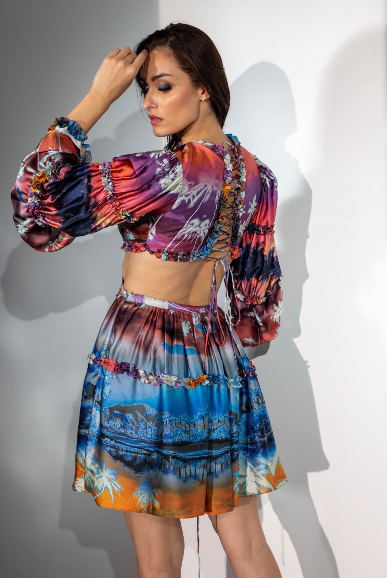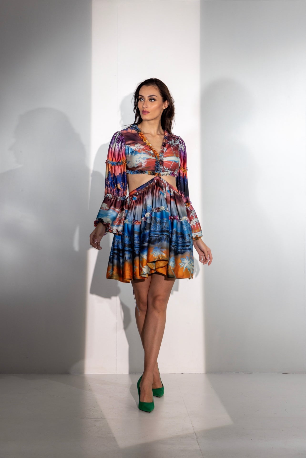 DETAIL- Satin based printed dress with waist cut out and a line flared bottom. Padded and knotted back. Side zip in skirt