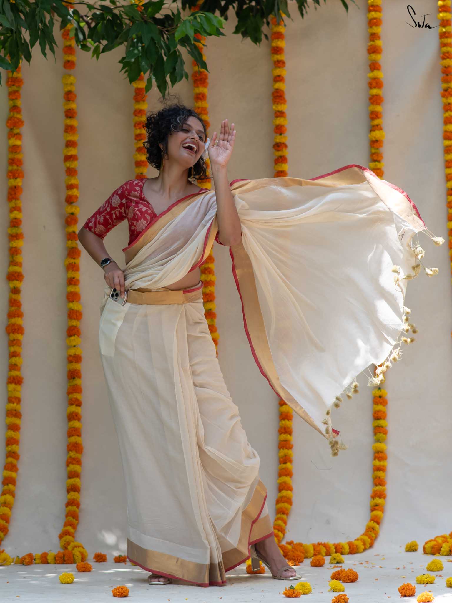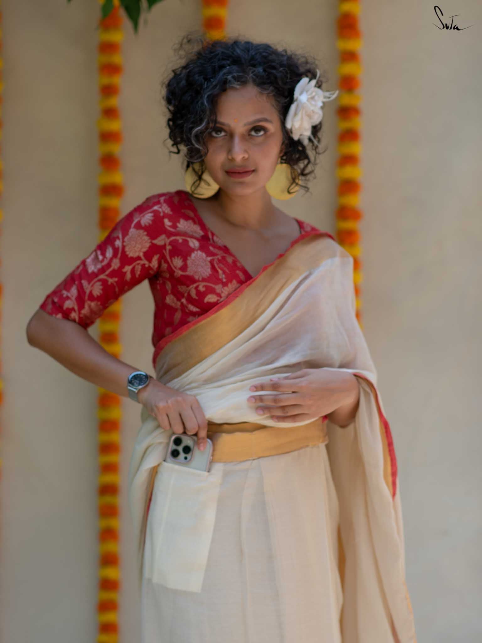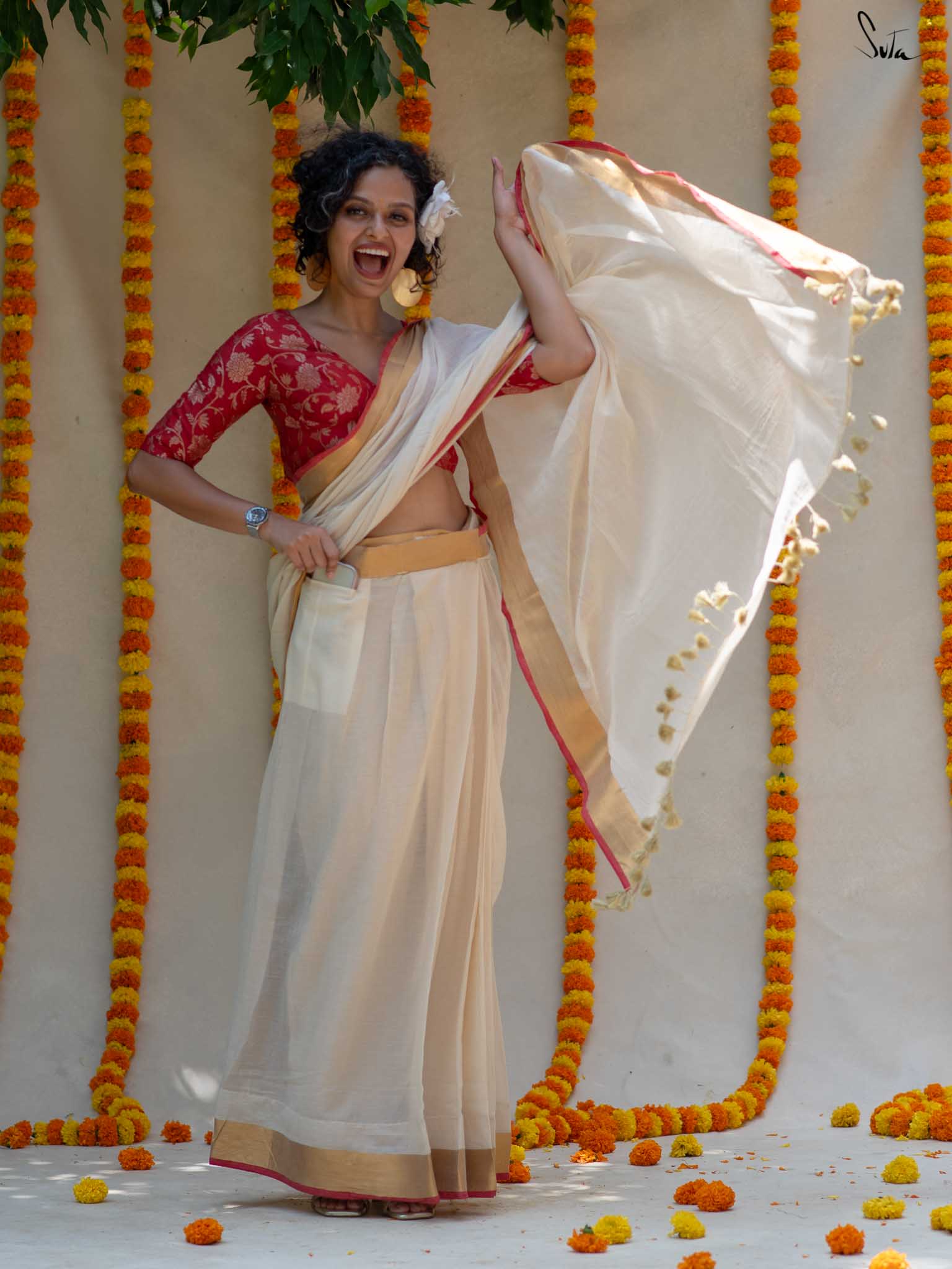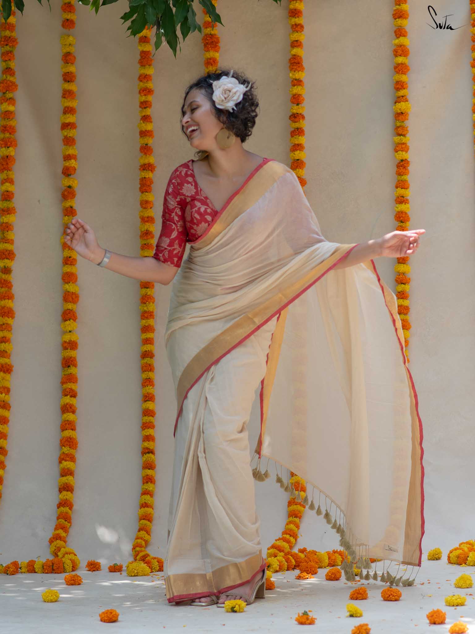 Our ˜made in heaven mul cotton, is also known as mul mul in West Bengal. The fabric is buttery soft and has a delicate beauty. Its weave is very fine and this lends a very fluid texture to the fabric, which makes draping it a breeze. It truly is like a hug that wraps you in its love. The addition of zari adds a regal sheen to this saree, making it as beautiful as it is comfortable.