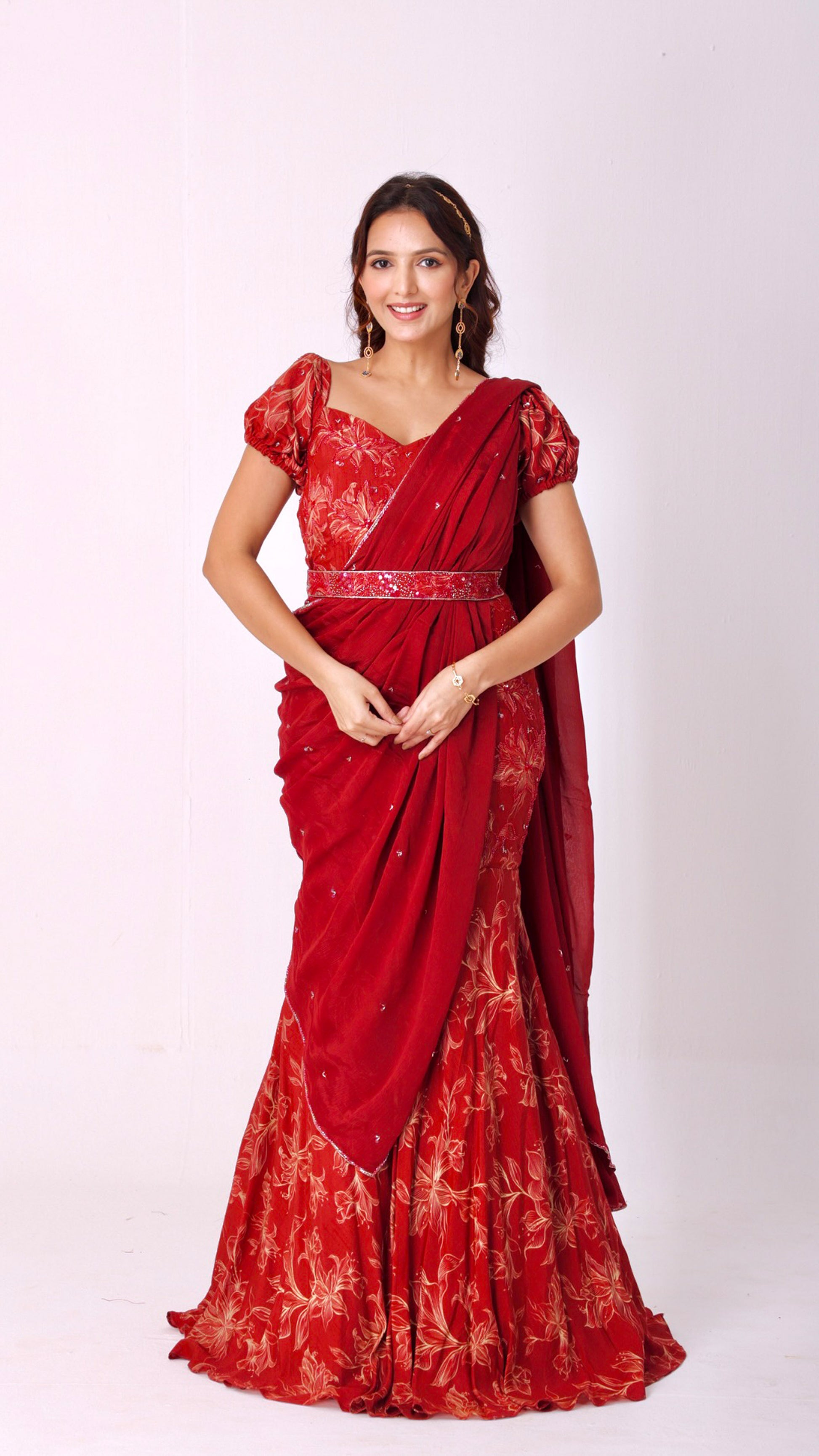 Maroon floral hand-embroidered fish-cut saree gown with puff sleeves and belt