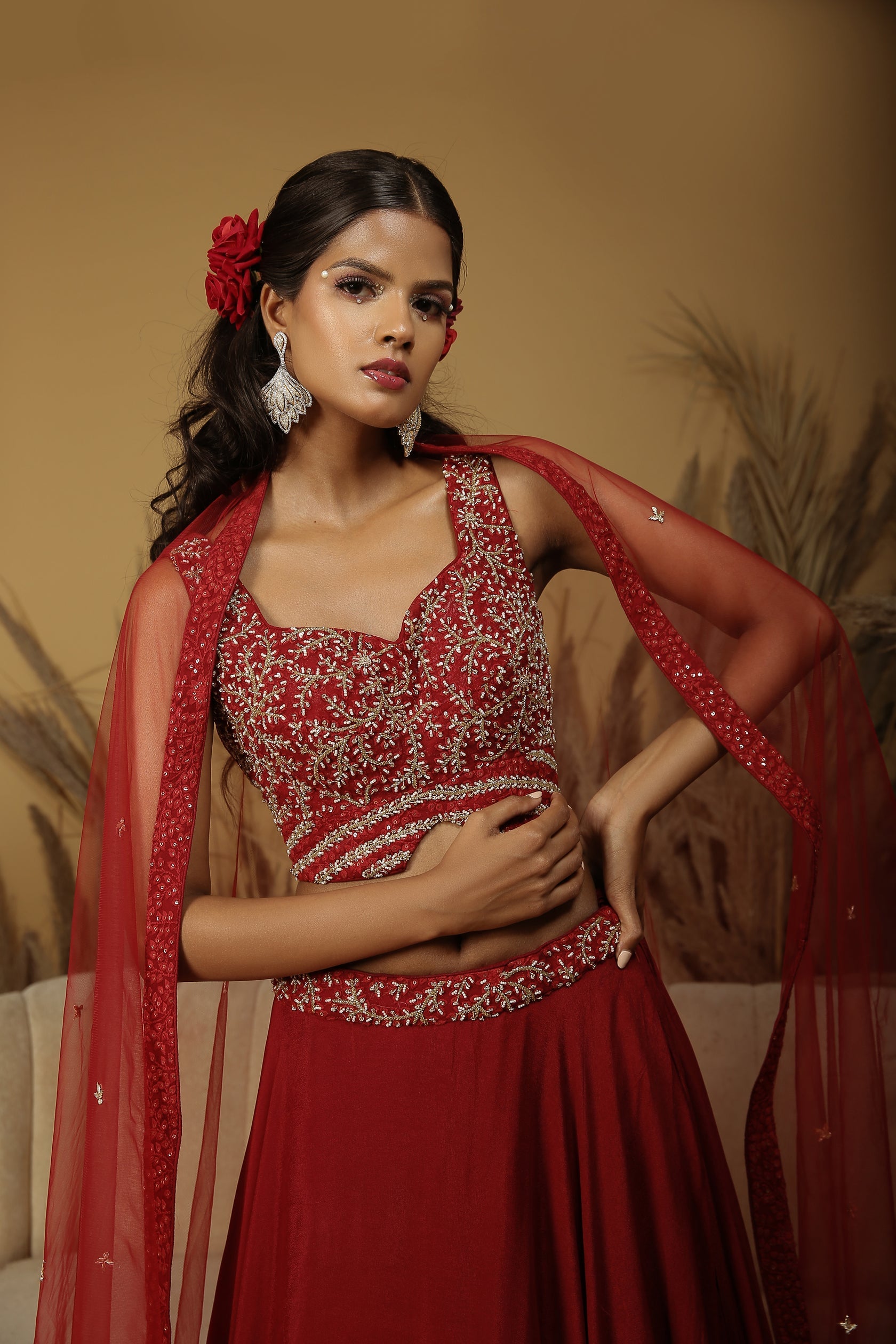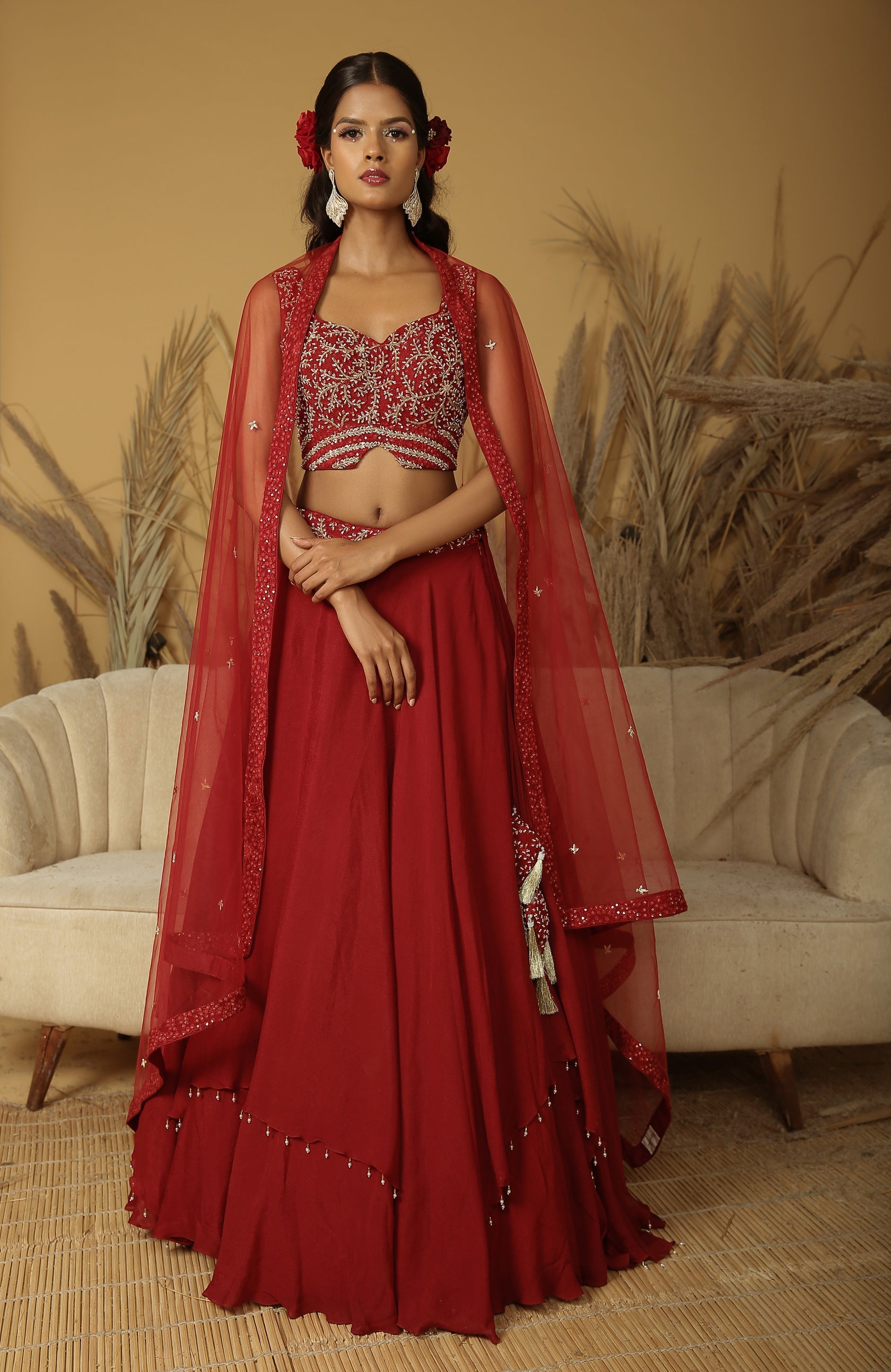 Featuring a maroon layered lehenga in georgette crepe base with embroidery. It is paired with a matching georgette blouse and a net dupatta.